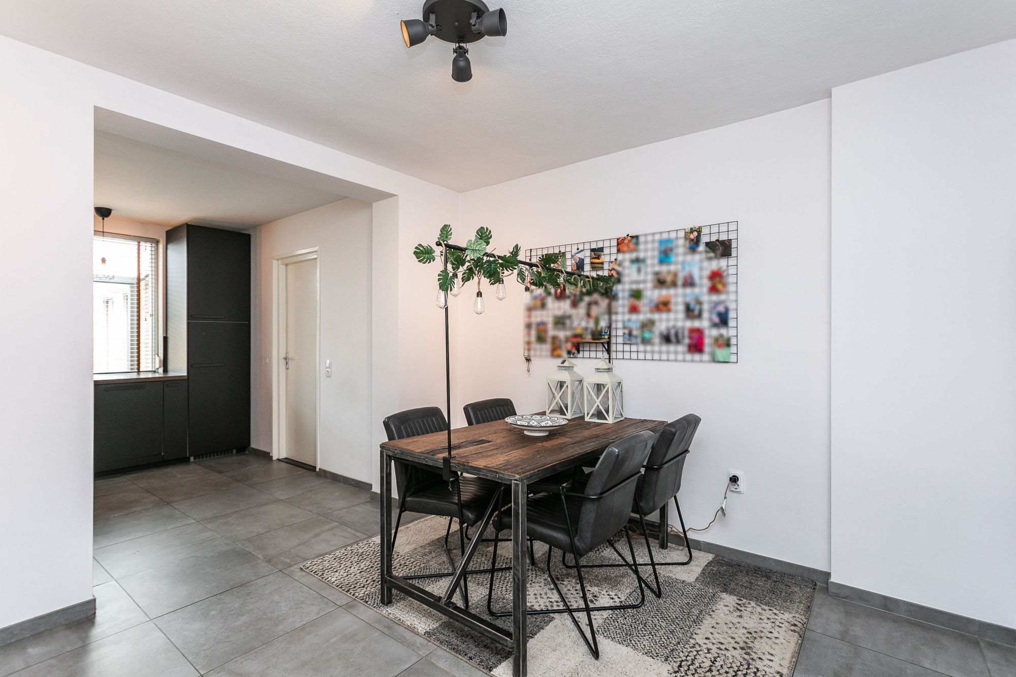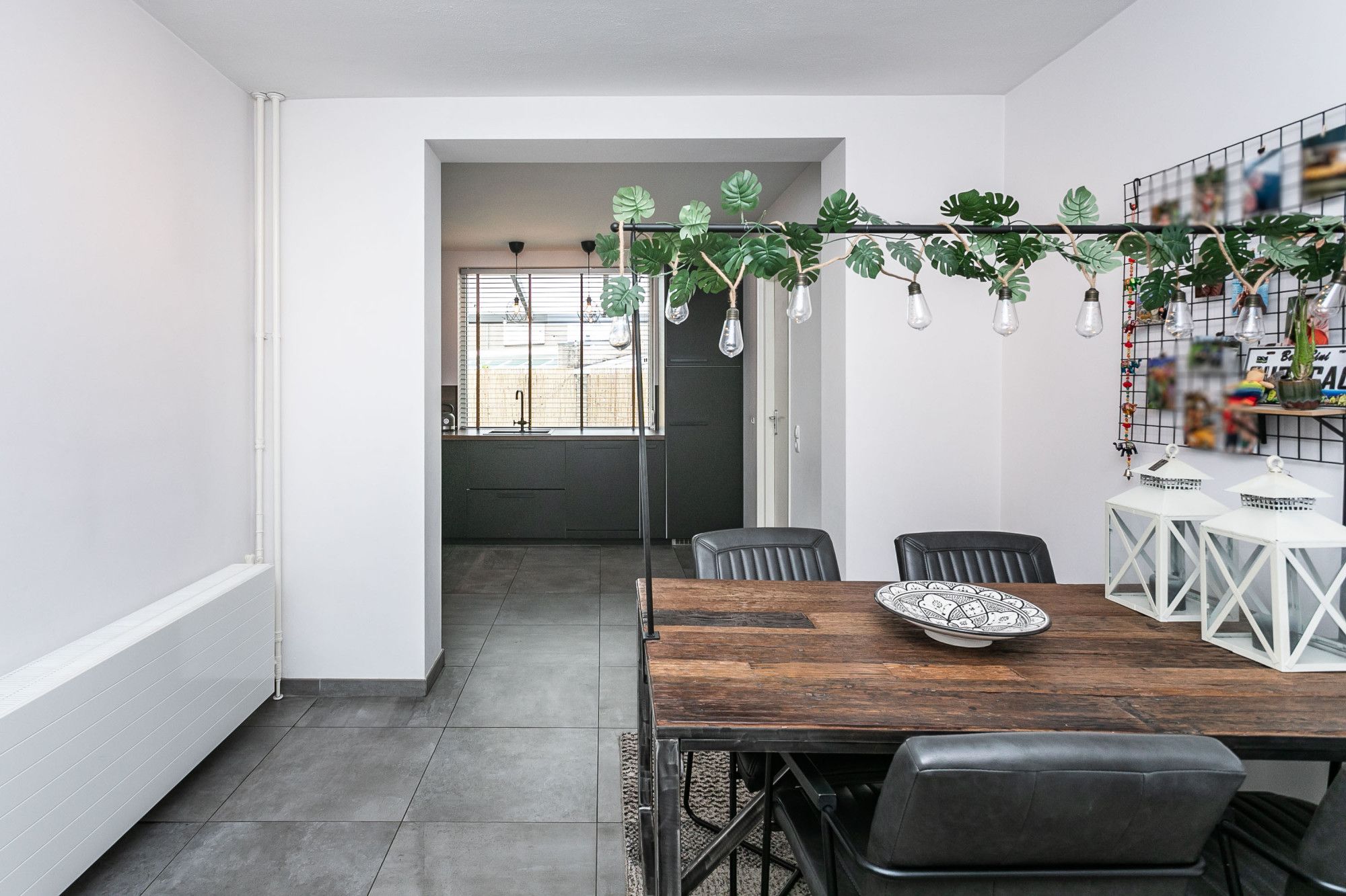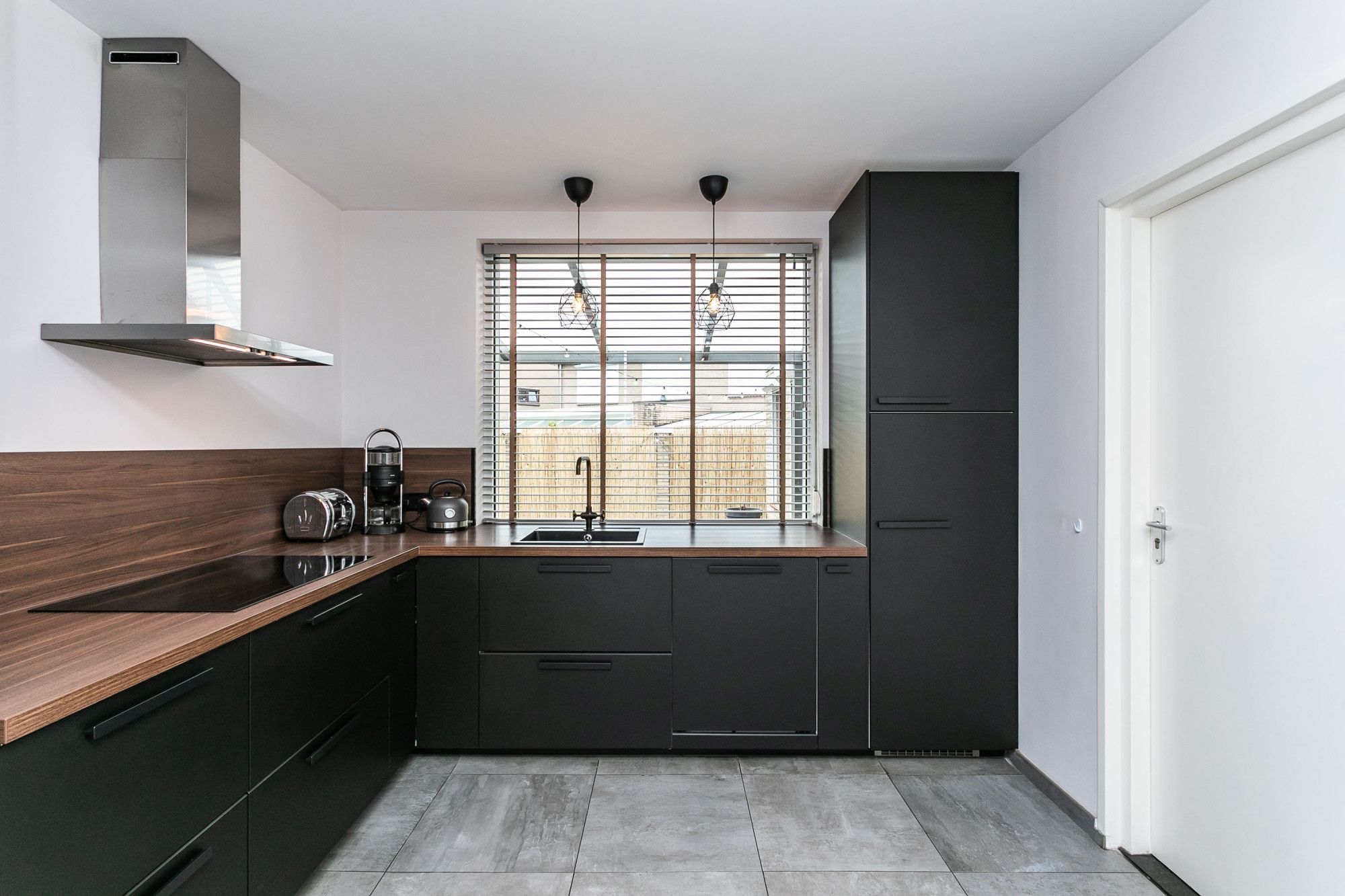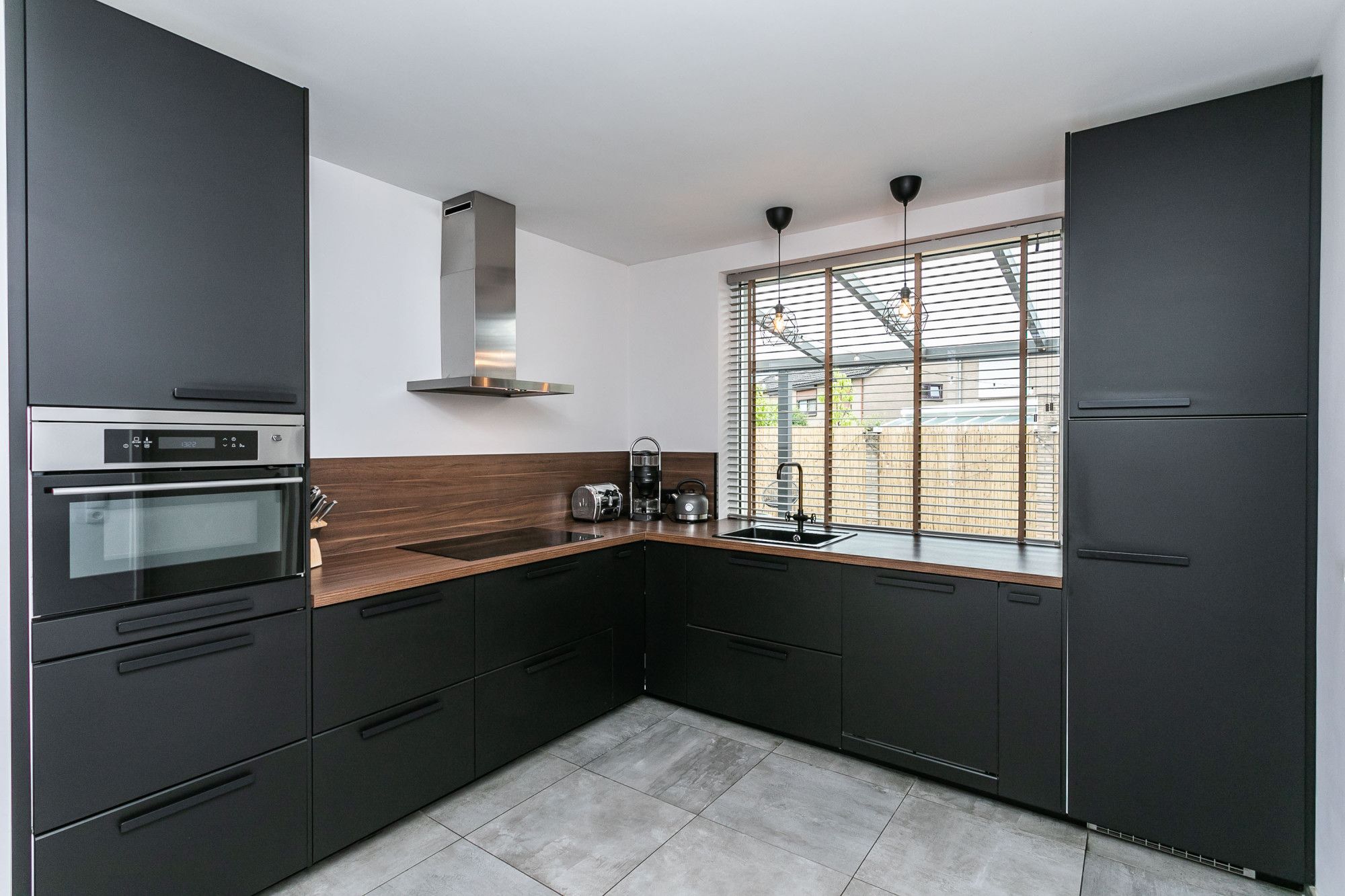 Ruime eetkamer en keuken, voorzien van een eigentijdse matzwarte inbouwkeuken in hoekopstelling, uitgerust met apparatuur, te weten: 4 zones inductiekookplaat / RVS wandschouwafzuigkap / combimagnetron / koelkast / wasbak / vaatwasmachine en veel opbergruimte. Loopdeur naar de garage.