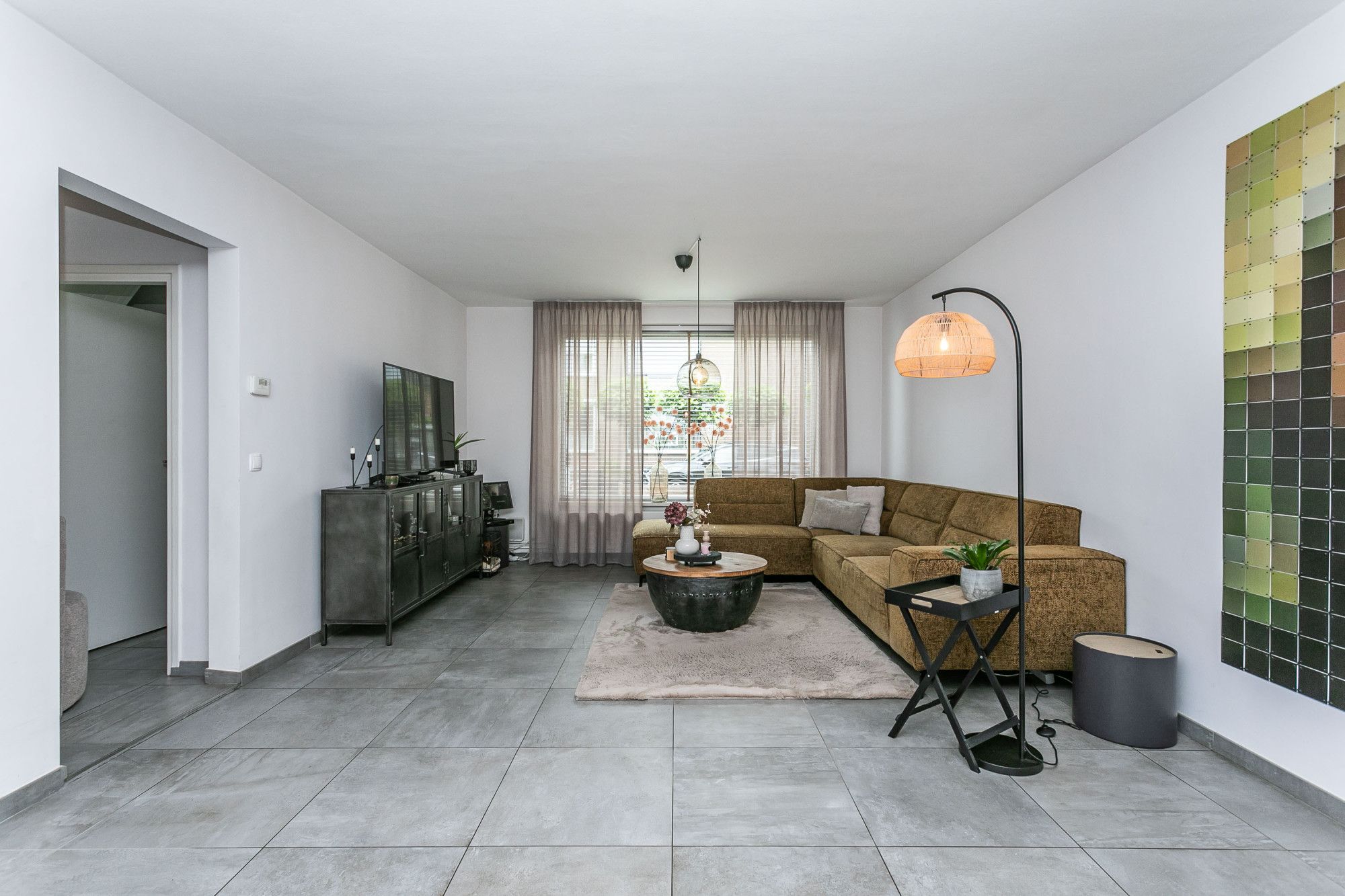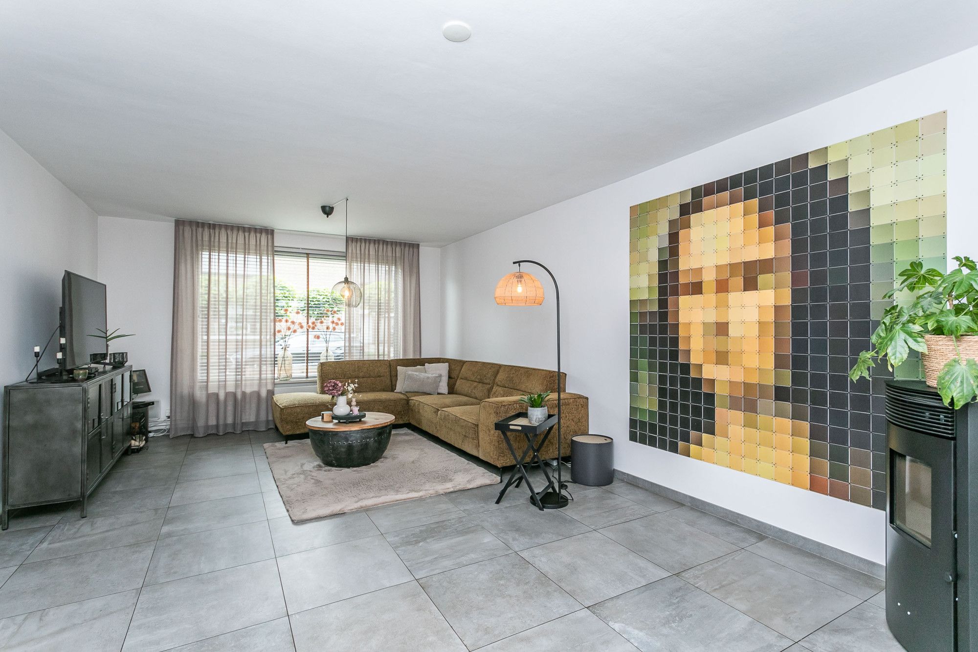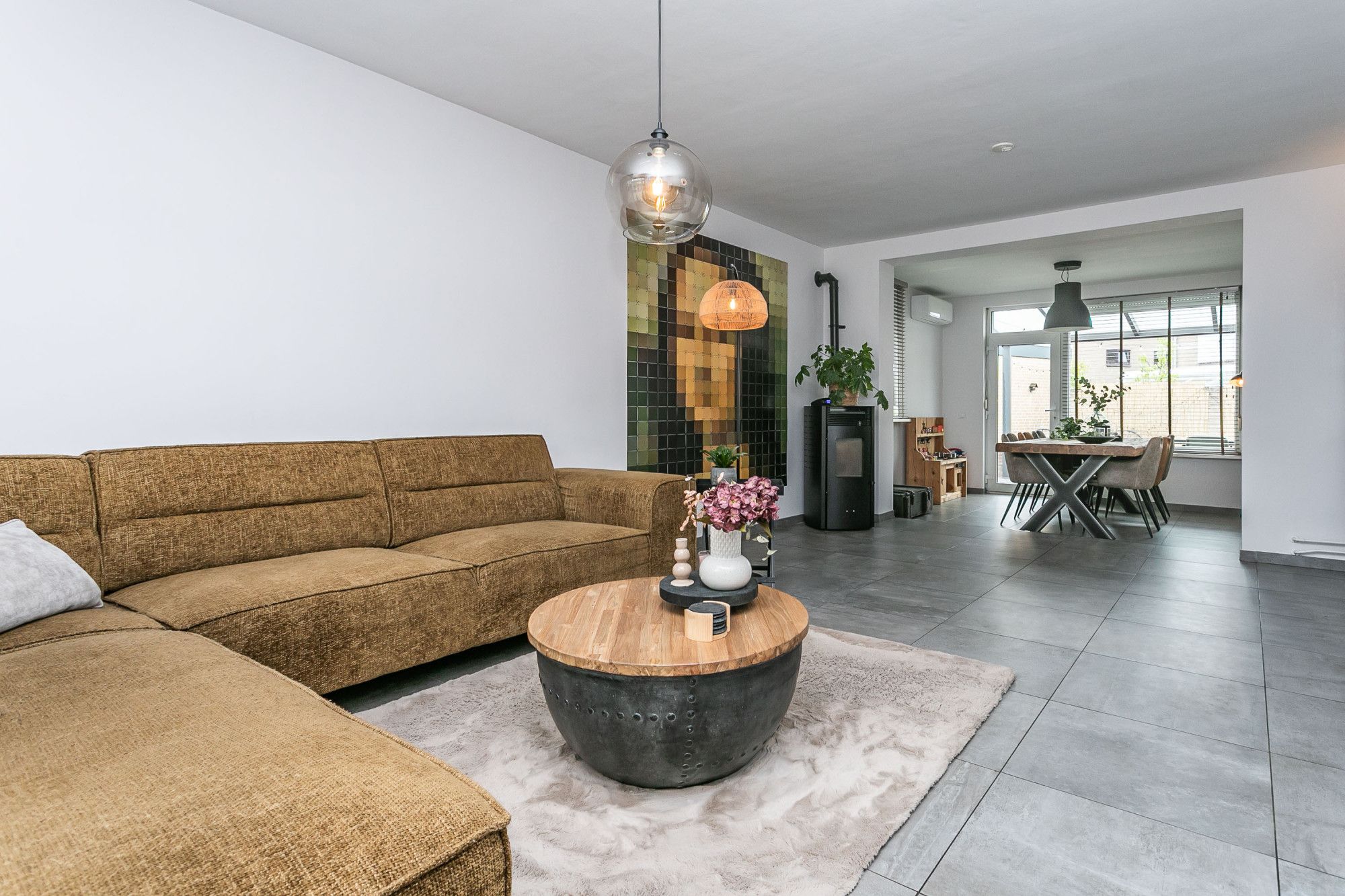 Royale lichte woonkamer met plavuizenvloer en aan de voorzijde gelegen living/lounge voorzien van audio-/visuele-aansluitingen. Centraal geplaatst de sfeervolle pelletkachel.