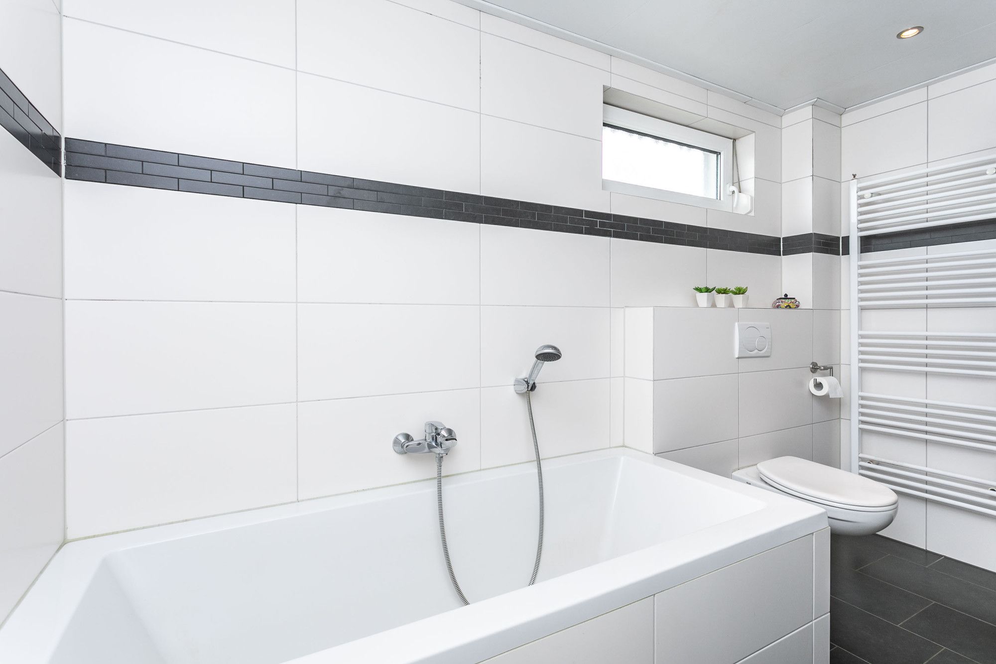 * STRAKKE BADKAMER MET INLOOPDOUCHE, LIGBAD, WASTAFEL IN EEN MEUBEL EN TWEEDE TOILET