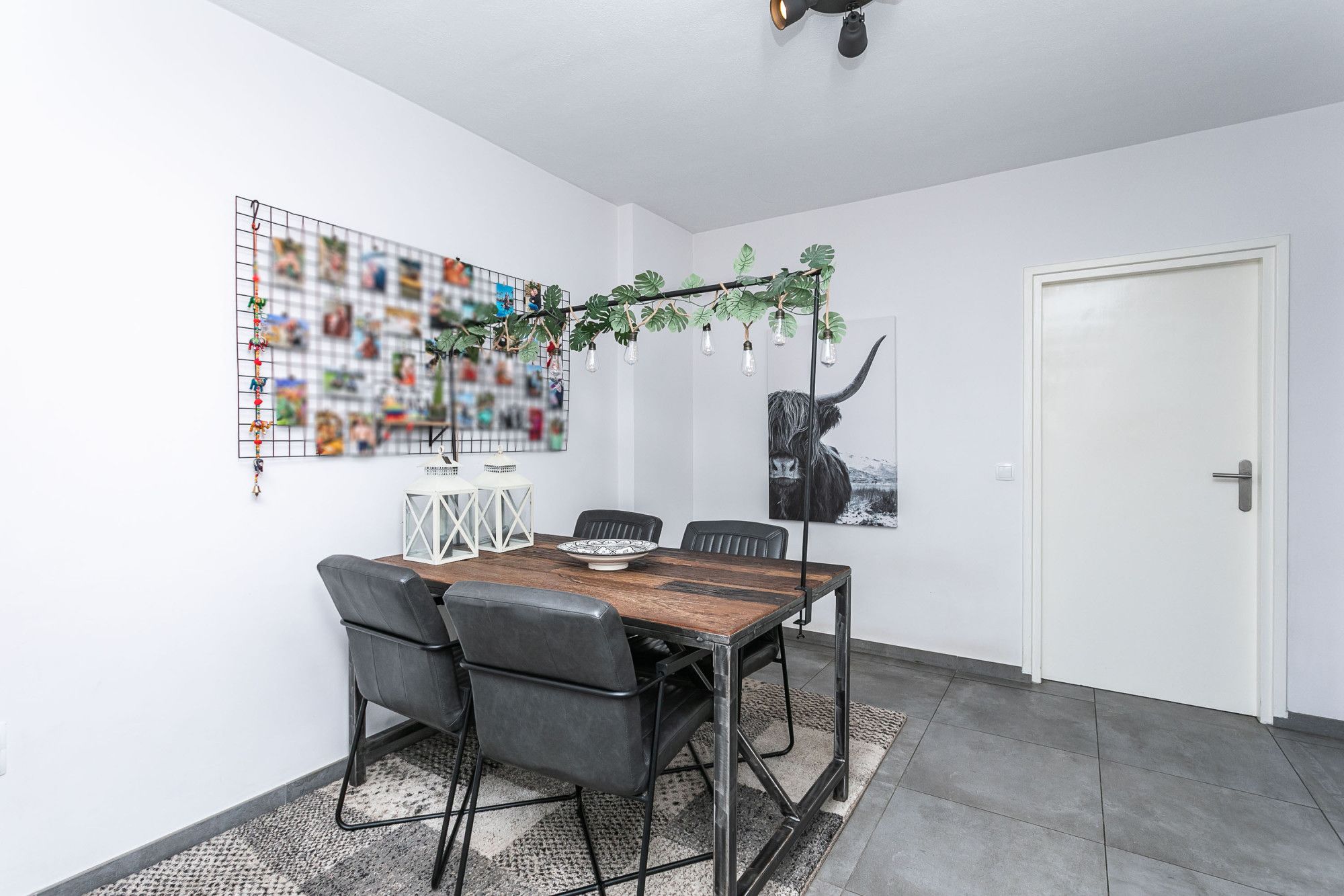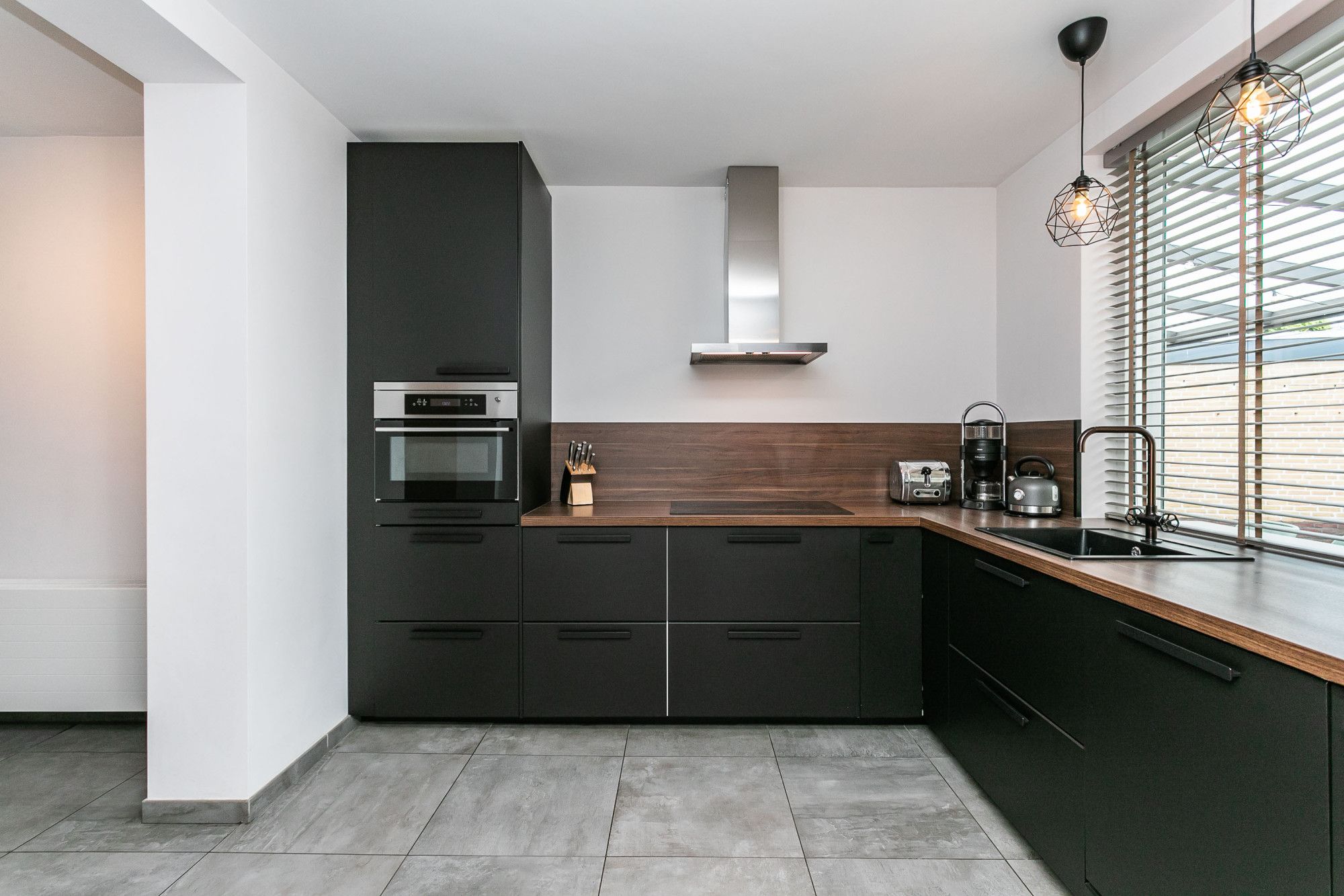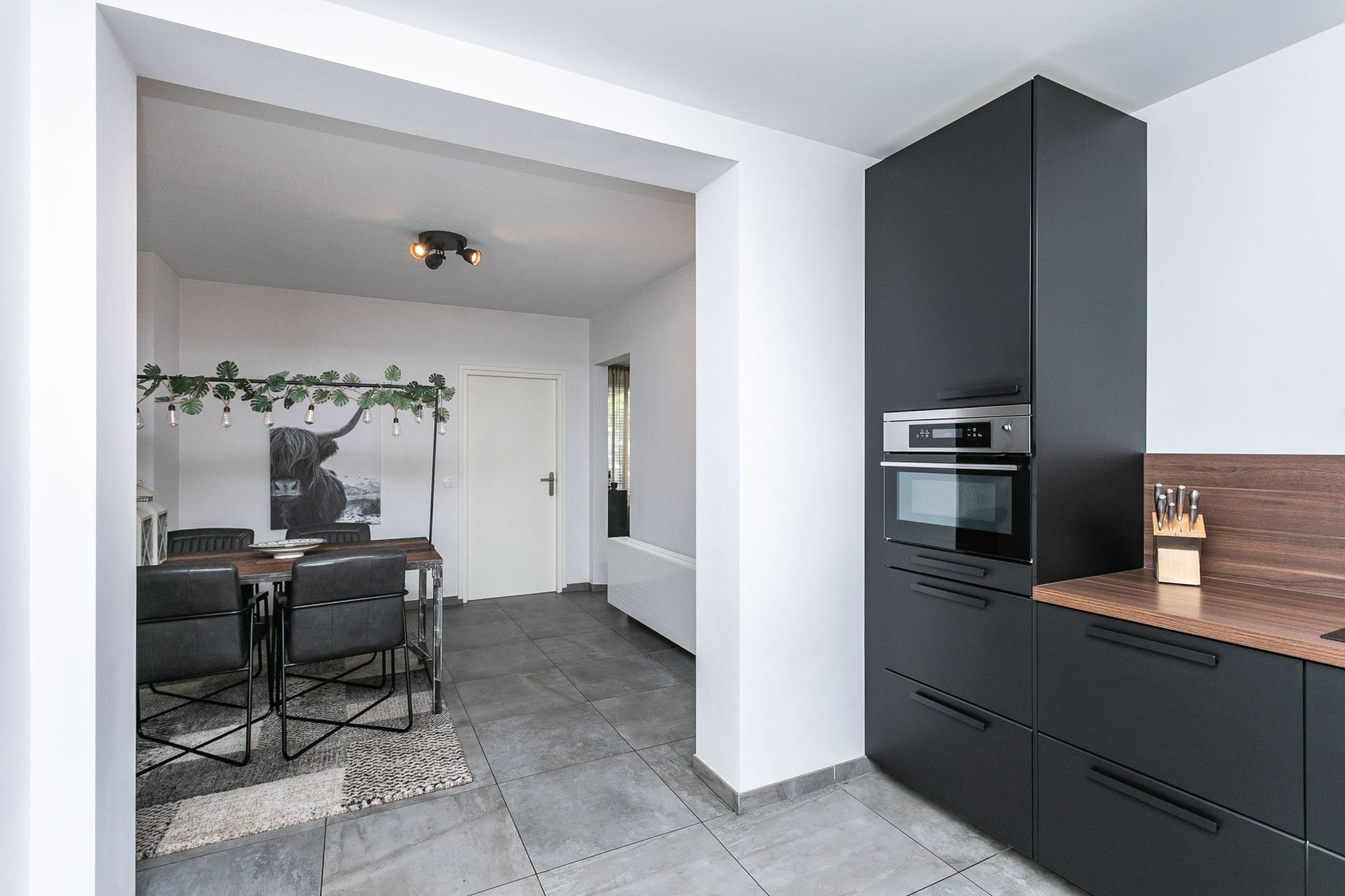 De eigentijdse matzwarte inbouwkeuken met apparatuur vormt samen met de aangrenzende eetkamer het hart van de woning, perfect voor gezellig tafelen en samenzijn.