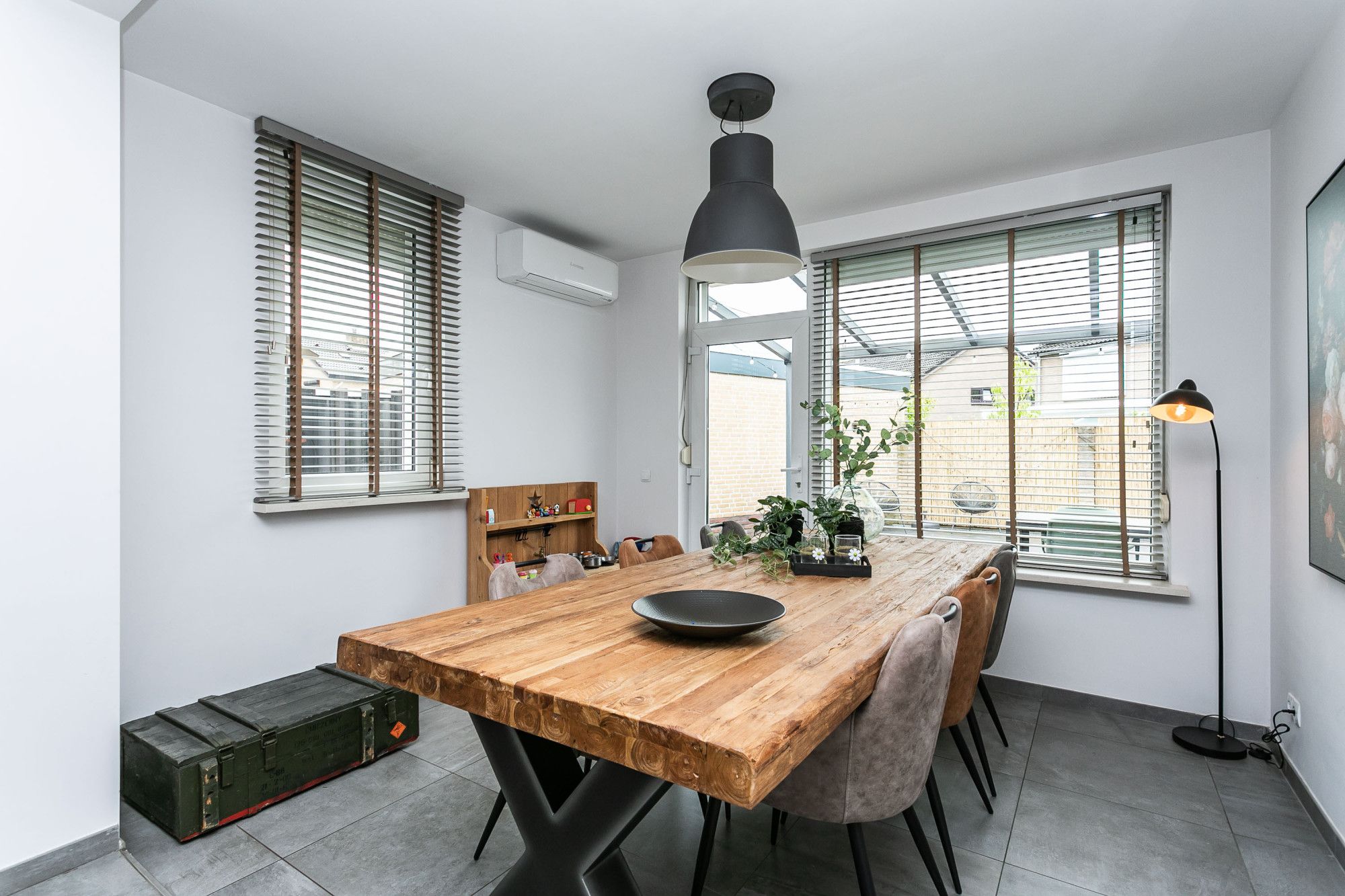 In de aanbouw gelegen tuinkamer met veel lichtinval door de grote raampartijen, waar geplaatst een eethoek en airconditioningsinstallatie. Via een loopdeur is er direct toegang tot het overdekte terras.