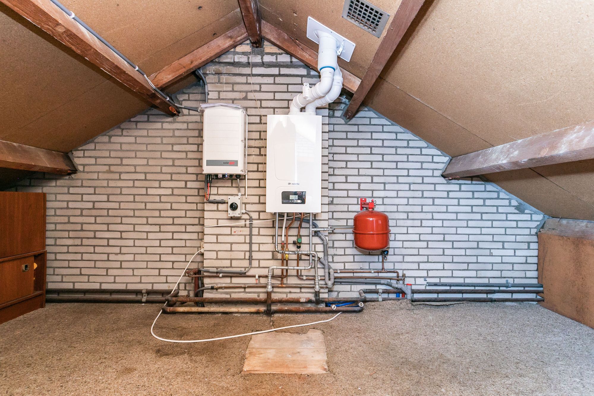 Vaste trap naar de bergzolder, bestaande uit een tweetal ruimtes met standplaats voor de Remeha CV-Combiketel (Eigendom / Bouwjaar 2023) en de omvormer voor de zonnepanelen.