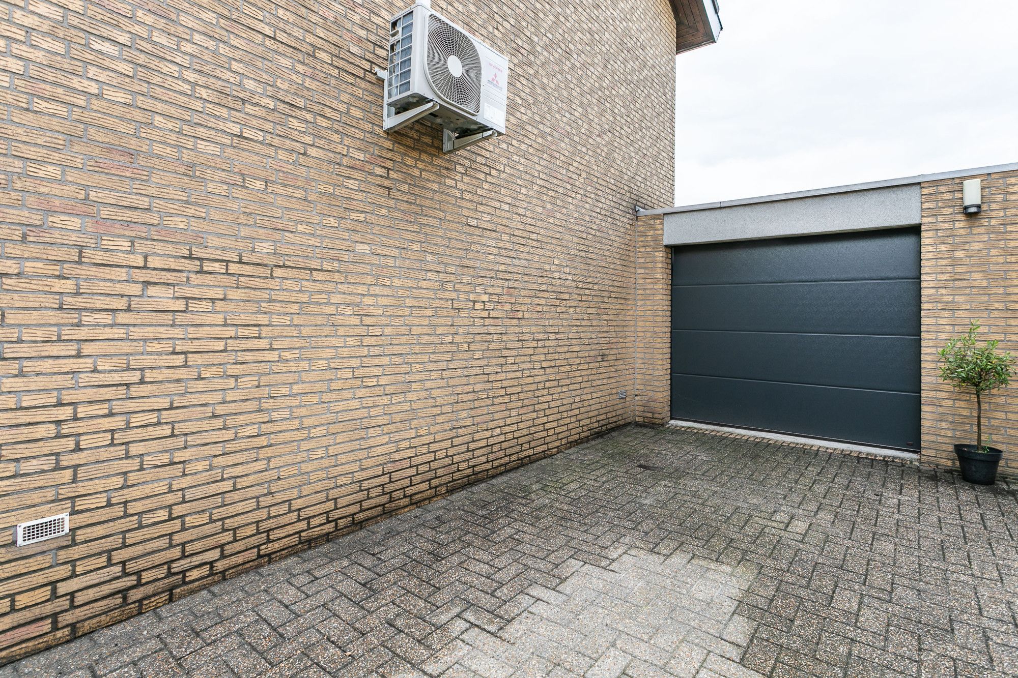 Naastgelegen, inpandig bereikbare garage voorzien van een elektrische sectionaalpoort, waar geplaatst de witgoedaansluitingen voor wasmachine/droger en extra opslagmogelijkheden.
