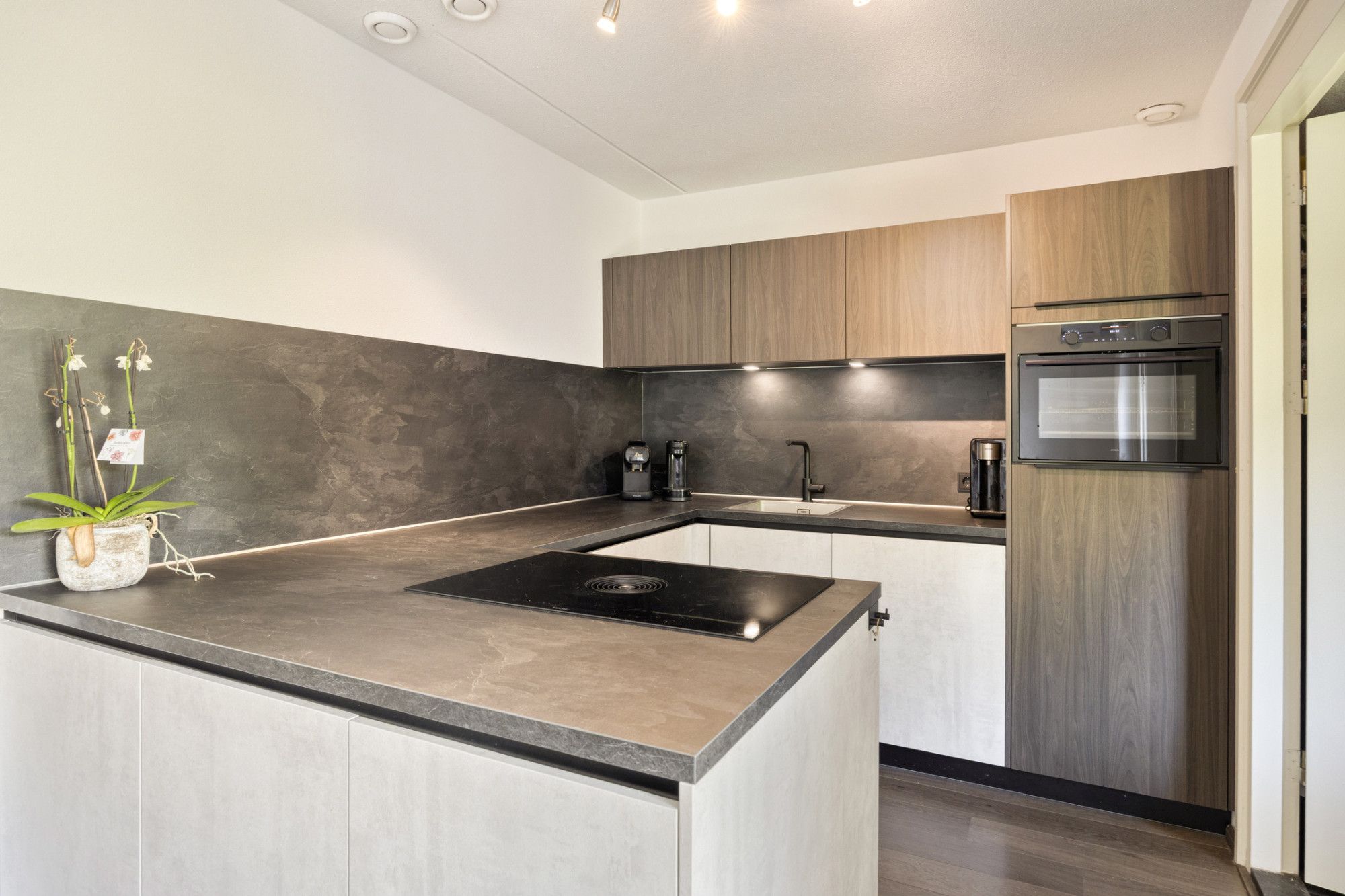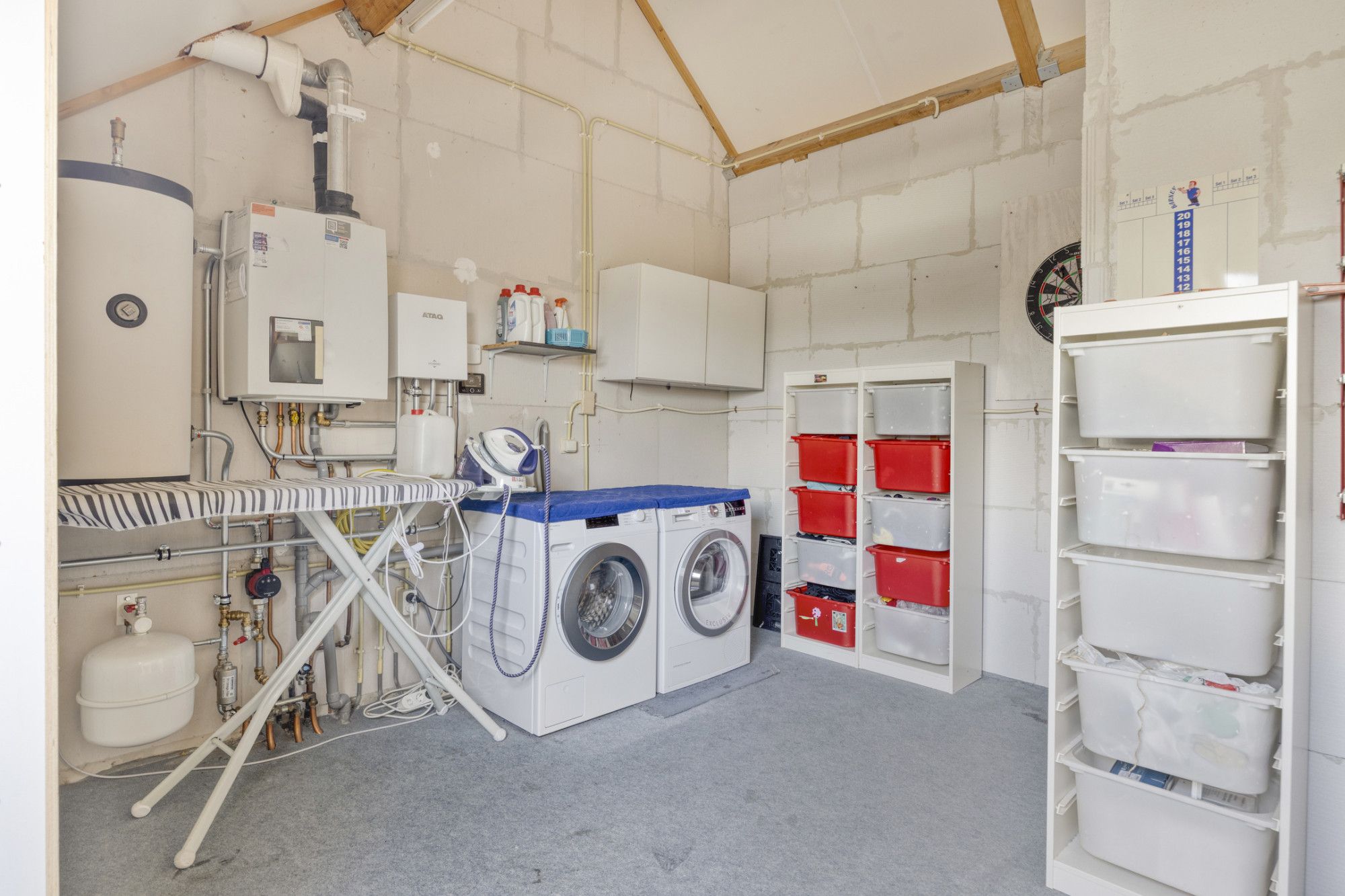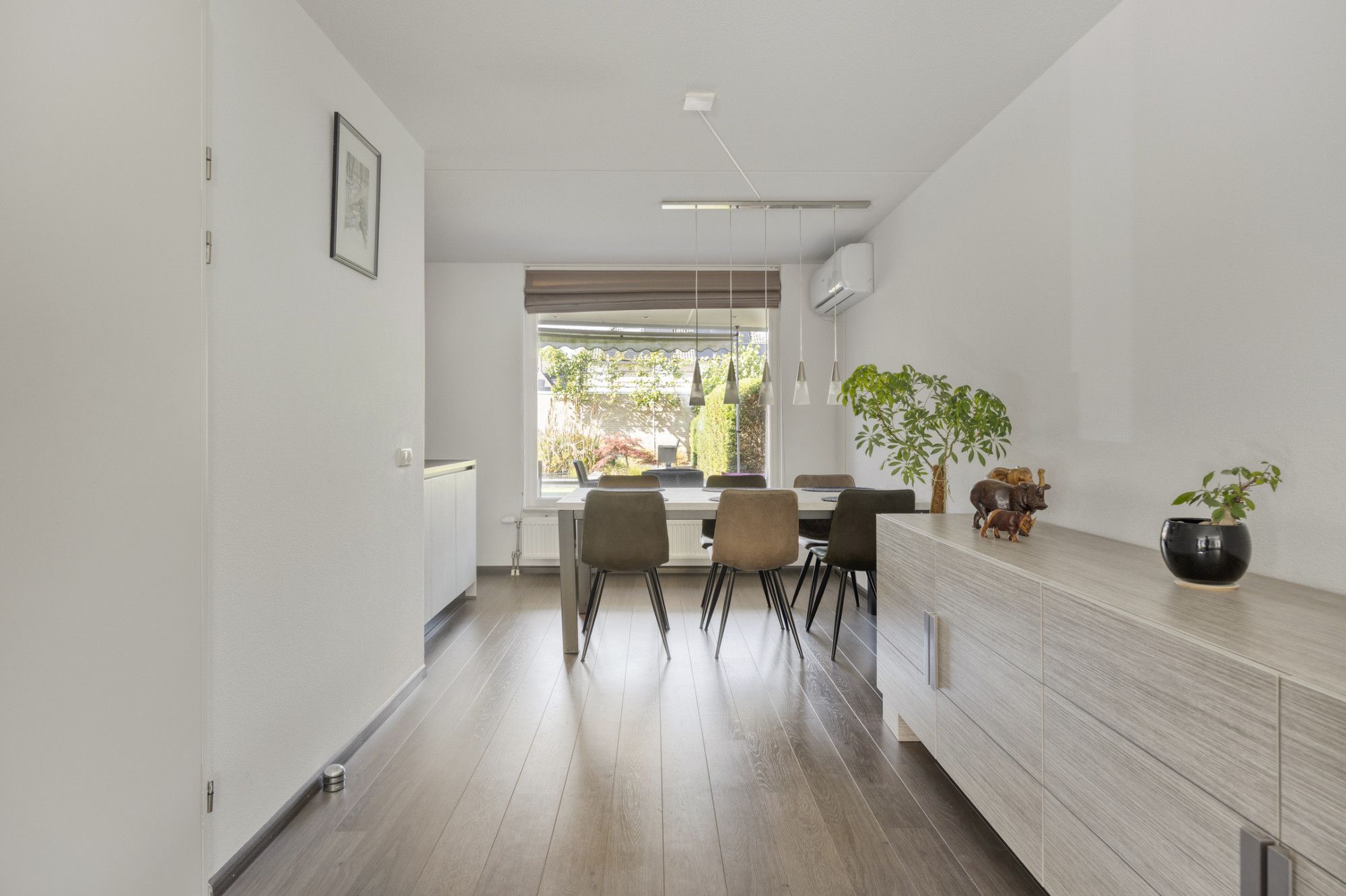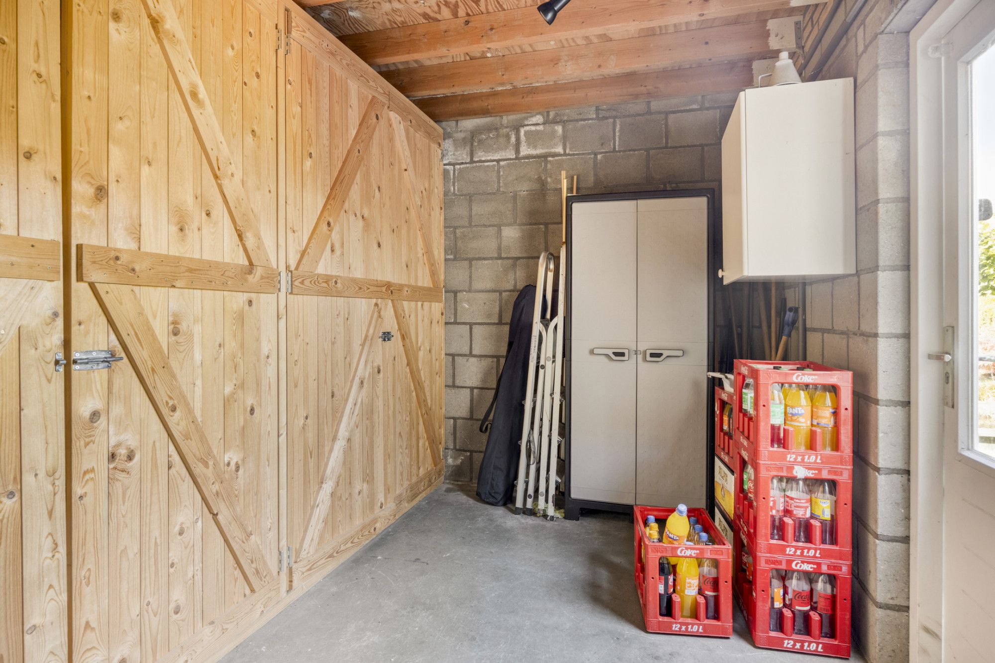 Middels ruime en overdekte entree toegang tot de hal met doorlopende laminaatvloer, garderobe nis en toiletruimte met wandcloset en fonteintje. L-vormige woonkamer (9.25 x 5.33/2.48 m - totaal 34 m²) voorzien van airco (koelen en verwarmen) met open keuken (2024) met luxe keukeninstallatie (2.75 x 2.38 m) in U - opstelling voorzien van ruime lades en onder- en bovenkasten, inbouwapparatuur te weten: Bora inductie kookplaat met kookveld afzuiging, stoom-oven, koelkast en vaatwasser. Vanuit de keuken toegang tot de bijkeuken (2.50 x 1.93 m) met keukenblok met spoelbak en inbouw koelkast en deur naar tuin en garage. Inpandige garage (6.17 x 3.11 m) met elektrisch bedienbare sectionaalpoort en toegang tot extra (tuin)berging (3.27 x 2.81 m) met bergkasten.
