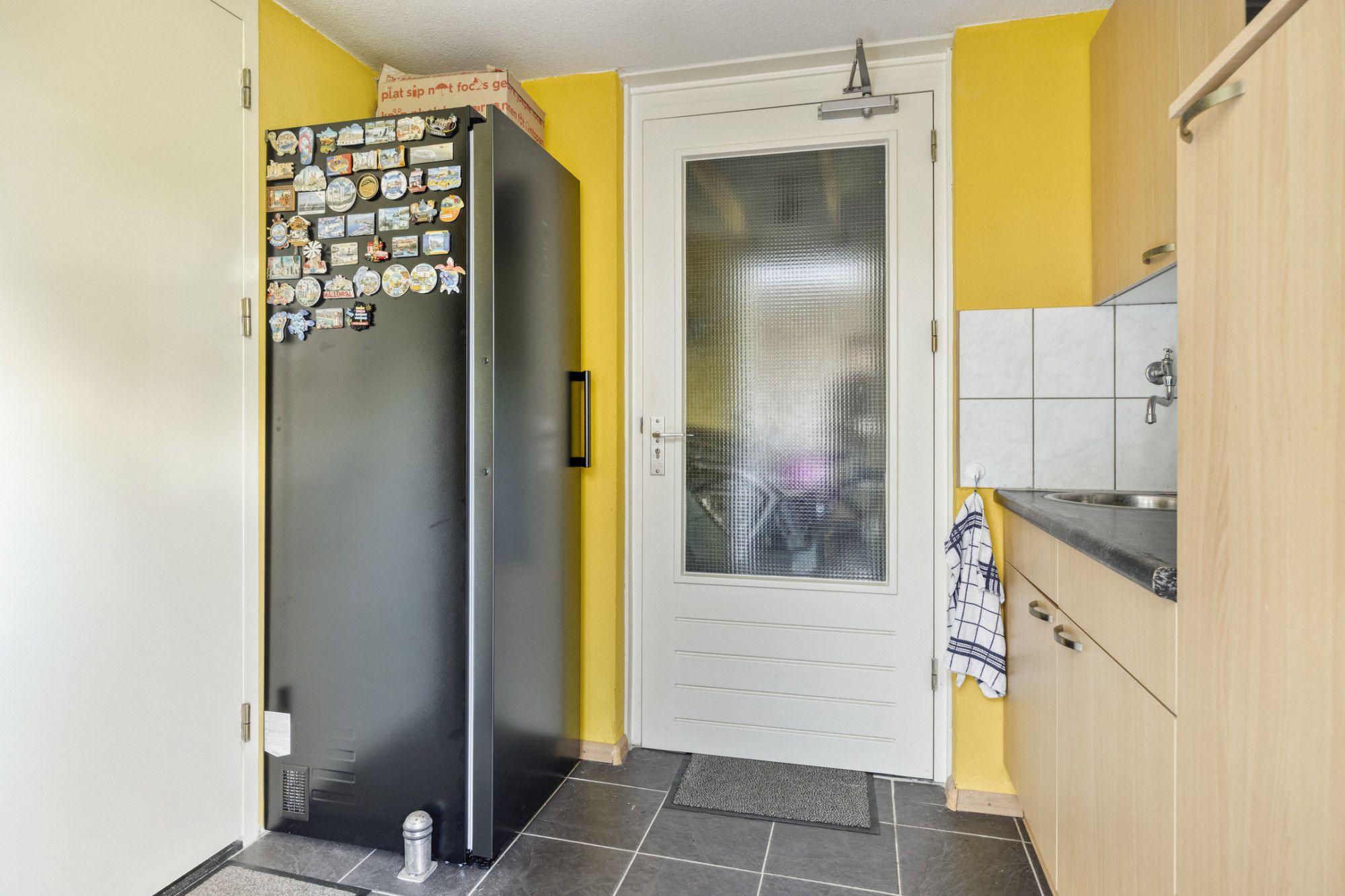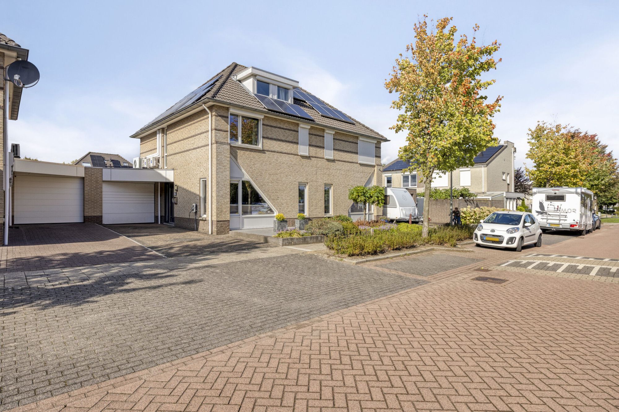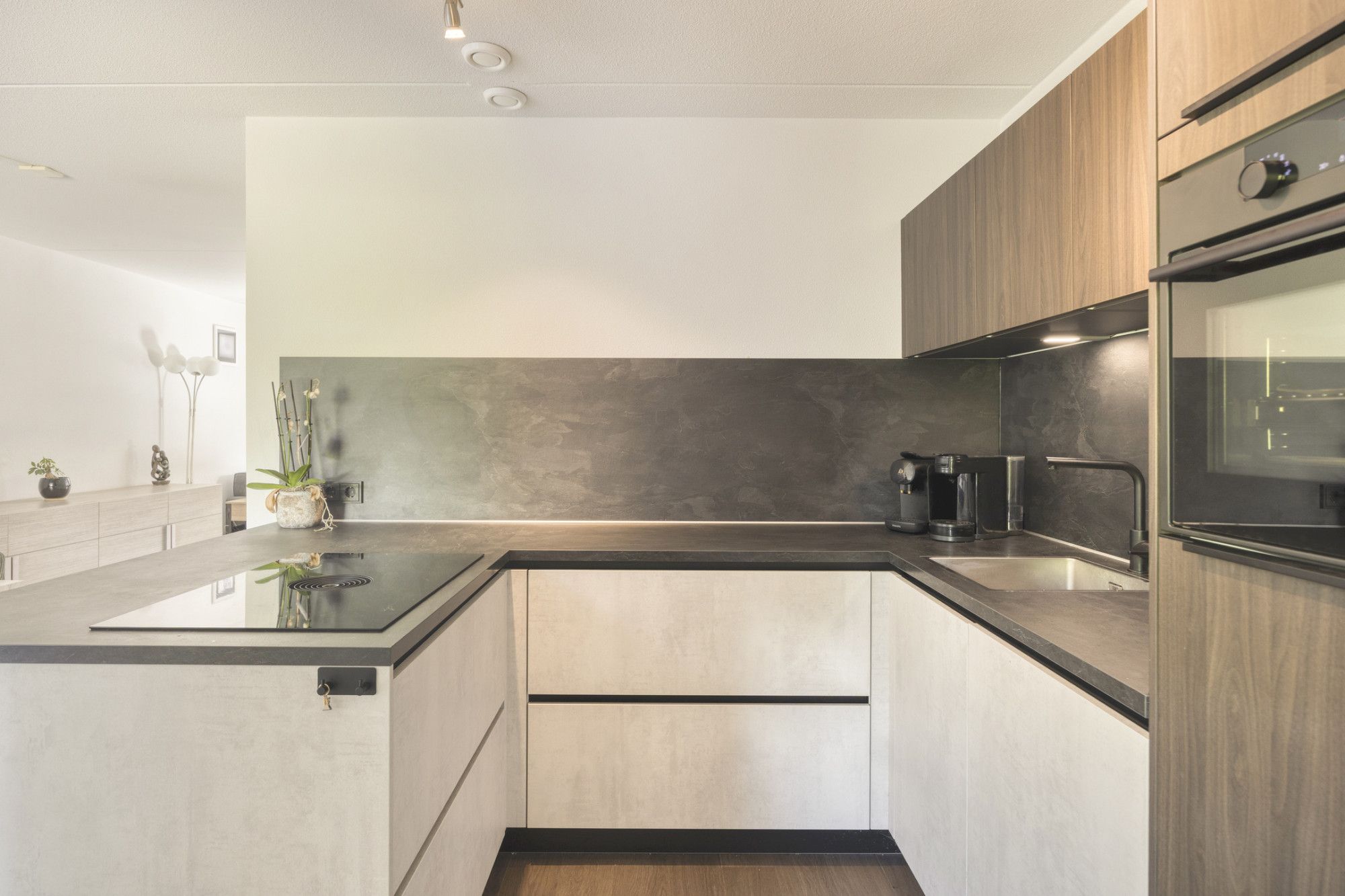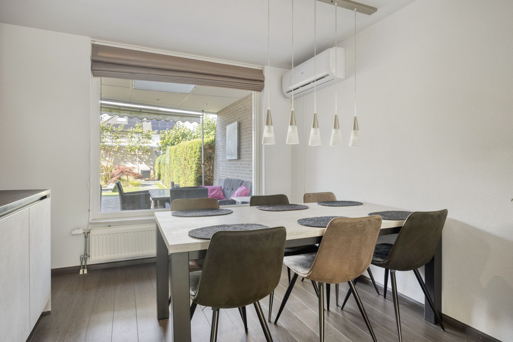 Middels ruime en overdekte entree toegang tot de hal met doorlopende laminaatvloer, garderobe nis en toiletruimte met wandcloset en fonteintje. L-vormige woonkamer (9.25 x 5.33/2.48 m - totaal 34 m²) voorzien van airco (koelen en verwarmen) met open keuken (2024) met luxe keukeninstallatie (2.75 x 2.38 m) in U - opstelling voorzien van ruime lades en onder- en bovenkasten, inbouwapparatuur te weten: Bora inductie kookplaat met kookveld afzuiging, stoom-oven, koelkast en vaatwasser. Vanuit de keuken toegang tot de bijkeuken (2.50 x 1.93 m) met keukenblok met spoelbak en inbouw koelkast en deur naar tuin en garage. Inpandige garage (6.17 x 3.11 m) met elektrisch bedienbare sectionaalpoort en toegang tot extra (tuin)berging (3.27 x 2.81 m) met bergkasten.