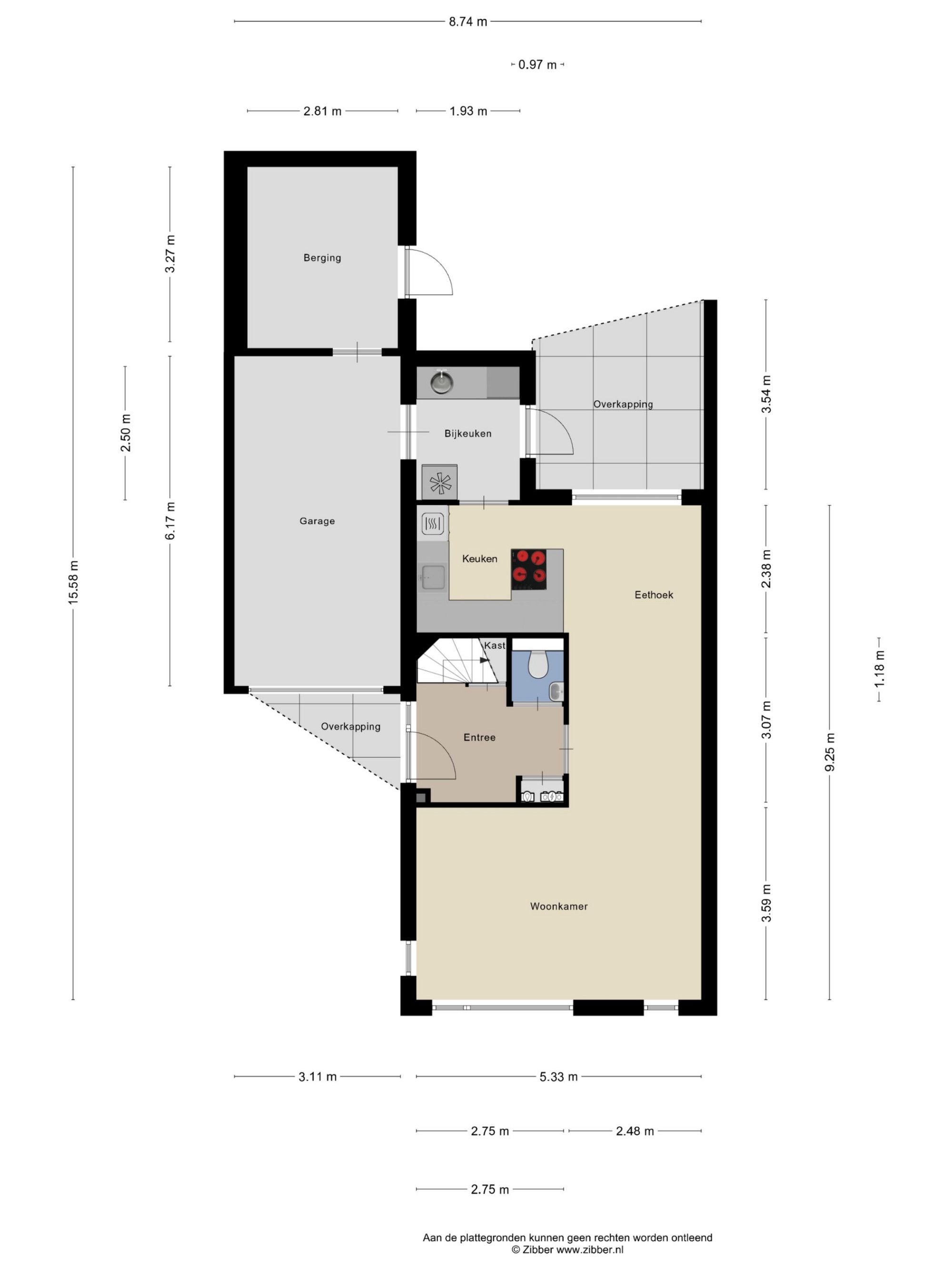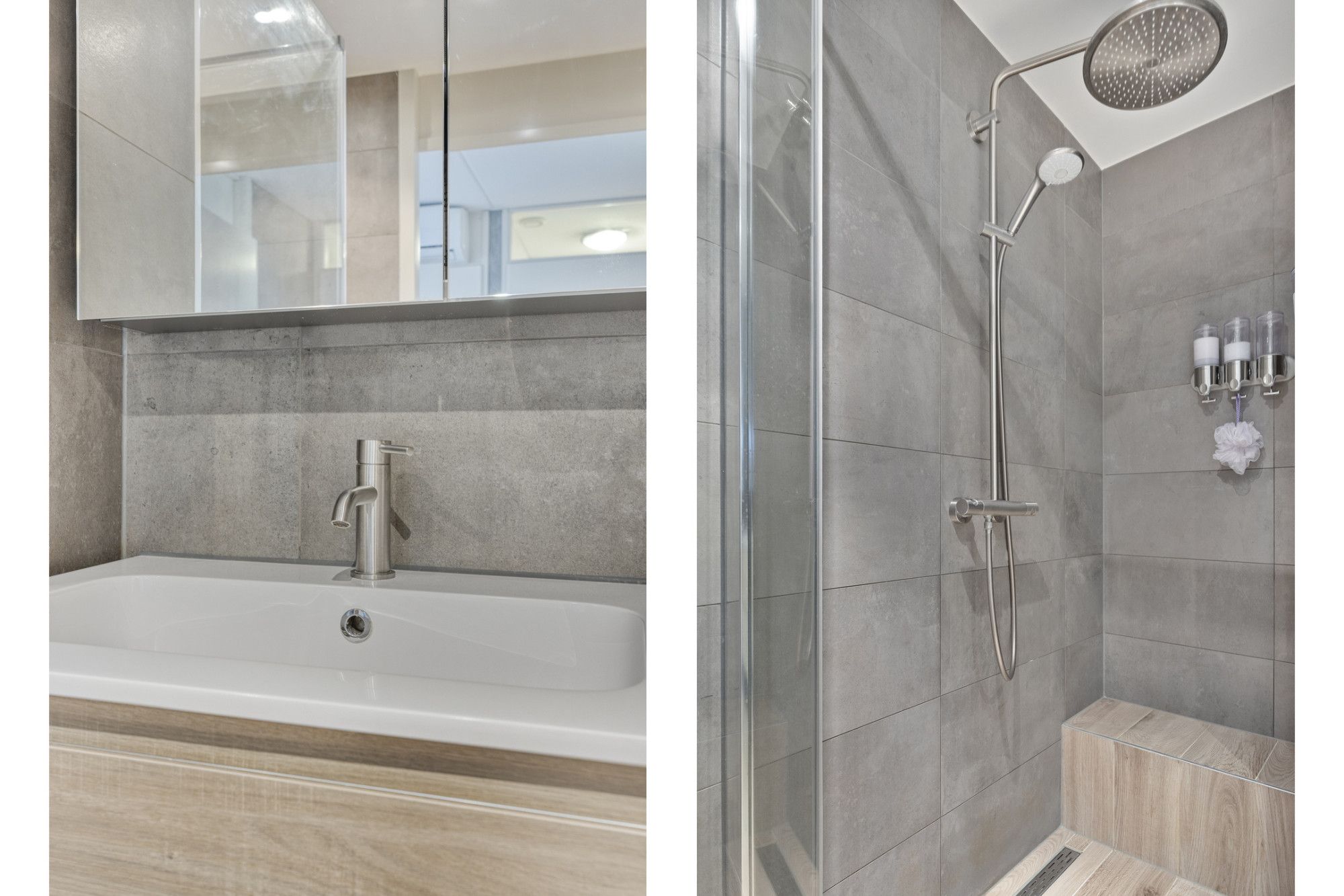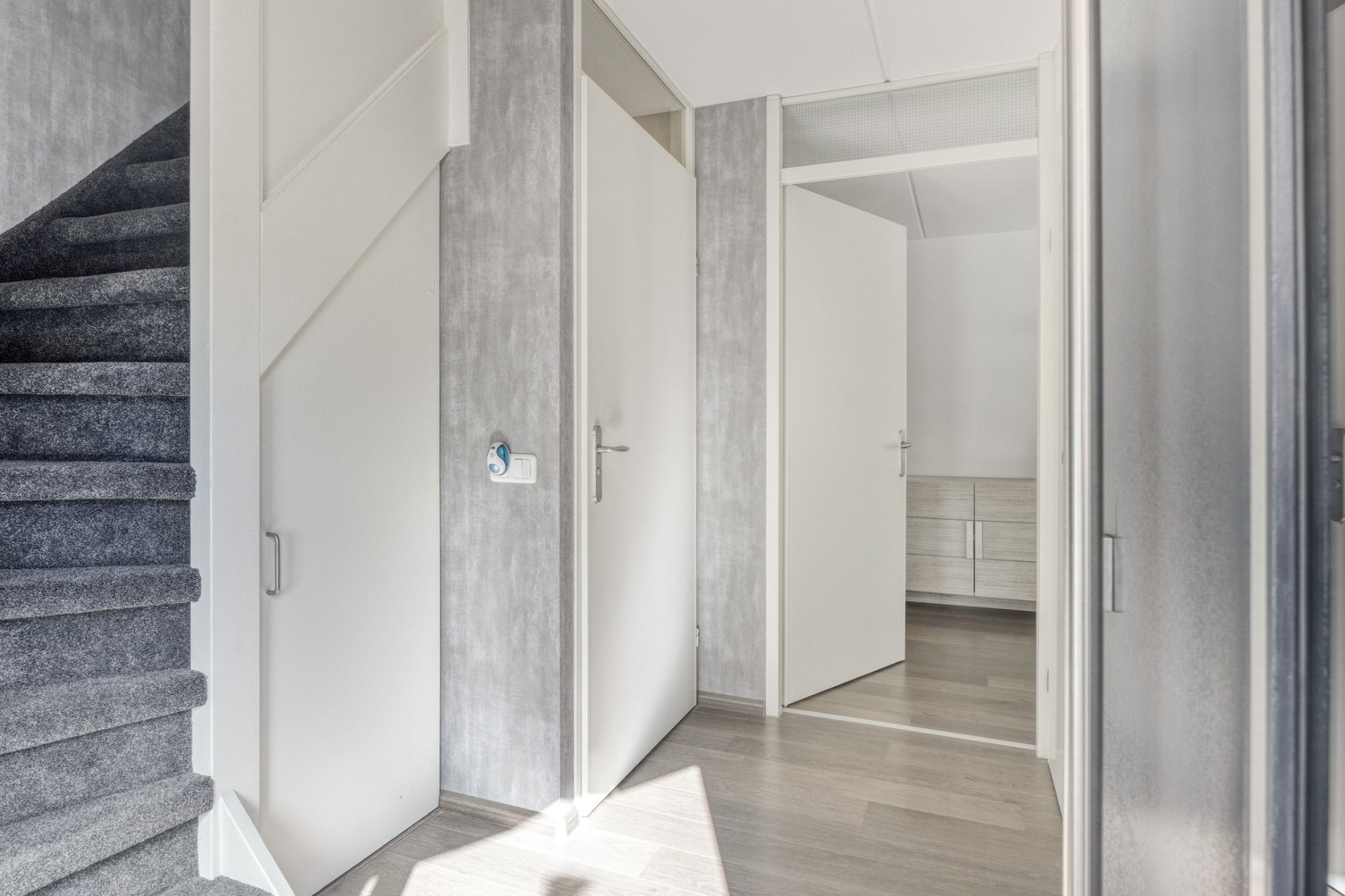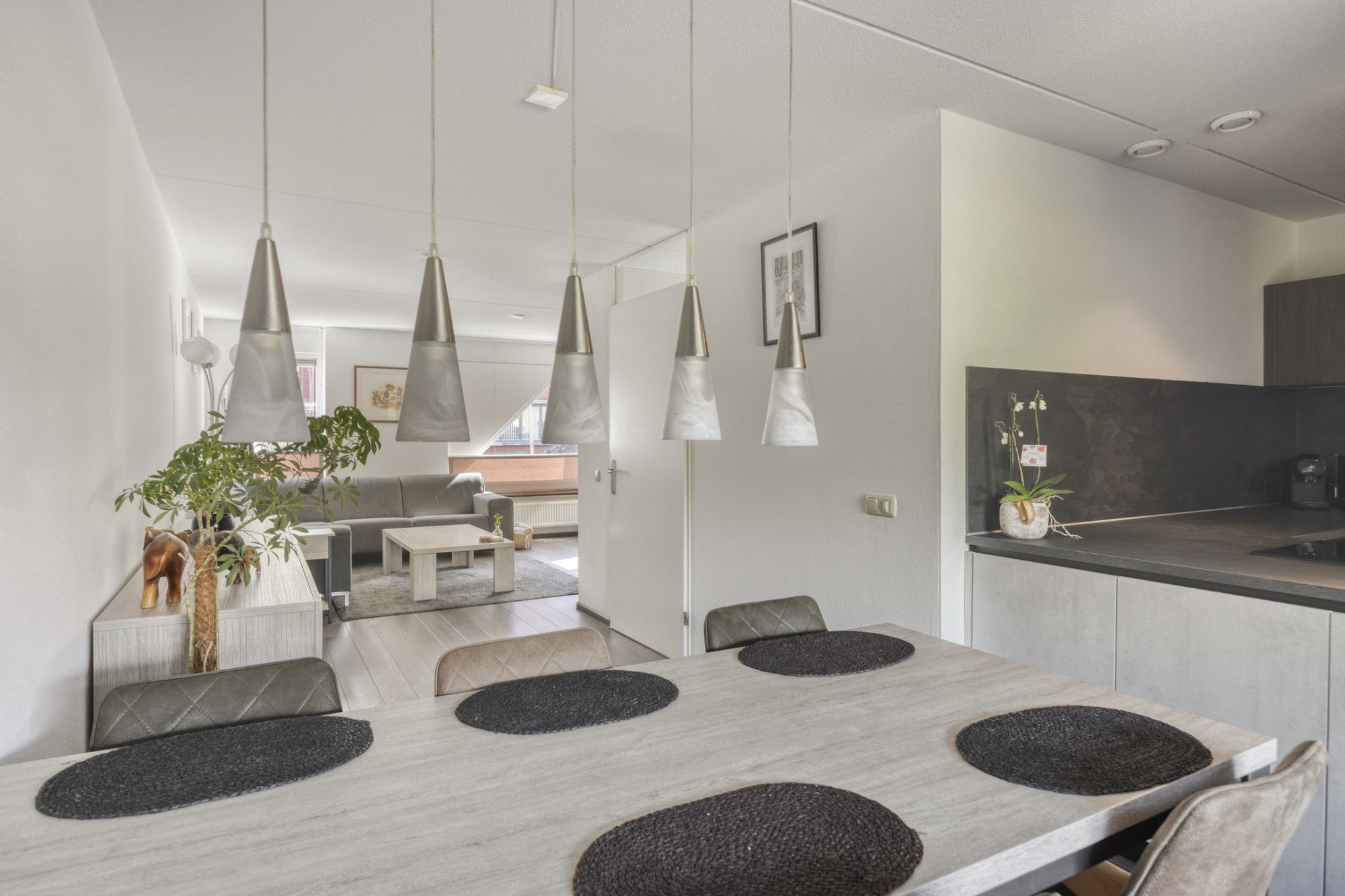 Middels ruime en overdekte entree toegang tot de hal met doorlopende laminaatvloer, garderobe nis en toiletruimte met wandcloset en fonteintje. L-vormige woonkamer (9.25 x 5.33/2.48 m - totaal 34 m²) voorzien van airco (koelen en verwarmen) met open keuken (2024) met luxe keukeninstallatie (2.75 x 2.38 m) in U - opstelling voorzien van ruime lades en onder- en bovenkasten, inbouwapparatuur te weten: Bora inductie kookplaat met kookveld afzuiging, stoom-oven, koelkast en vaatwasser. Vanuit de keuken toegang tot de bijkeuken (2.50 x 1.93 m) met keukenblok met spoelbak en inbouw koelkast en deur naar tuin en garage. Inpandige garage (6.17 x 3.11 m) met elektrisch bedienbare sectionaalpoort en toegang tot extra (tuin)berging (3.27 x 2.81 m) met bergkasten.