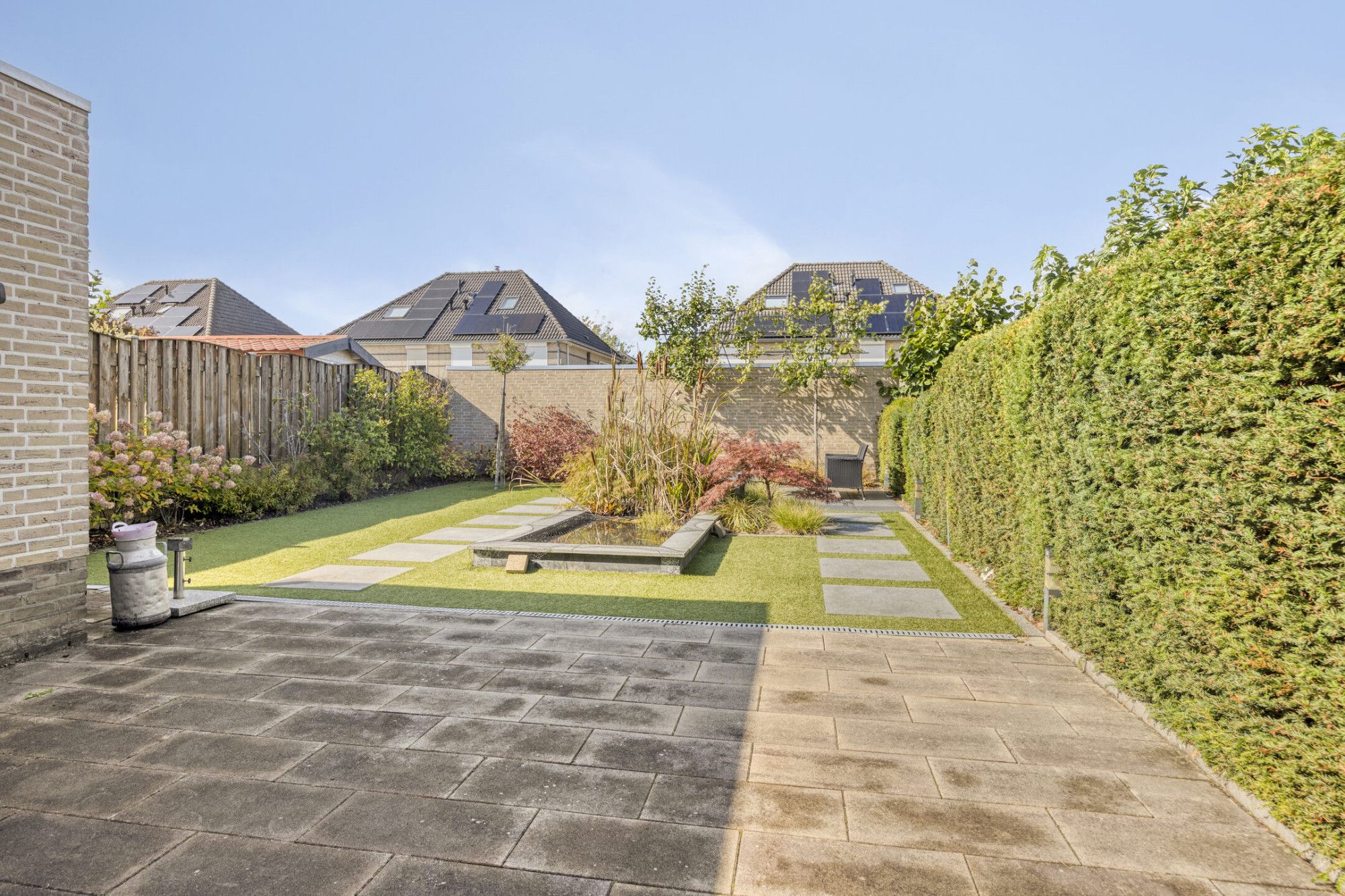 Vanuit de woonkamer en bij-keuken toegang tot het overdekte terras en de riante achtertuin met plantenborders, kunstgras zone en vijverpartij.