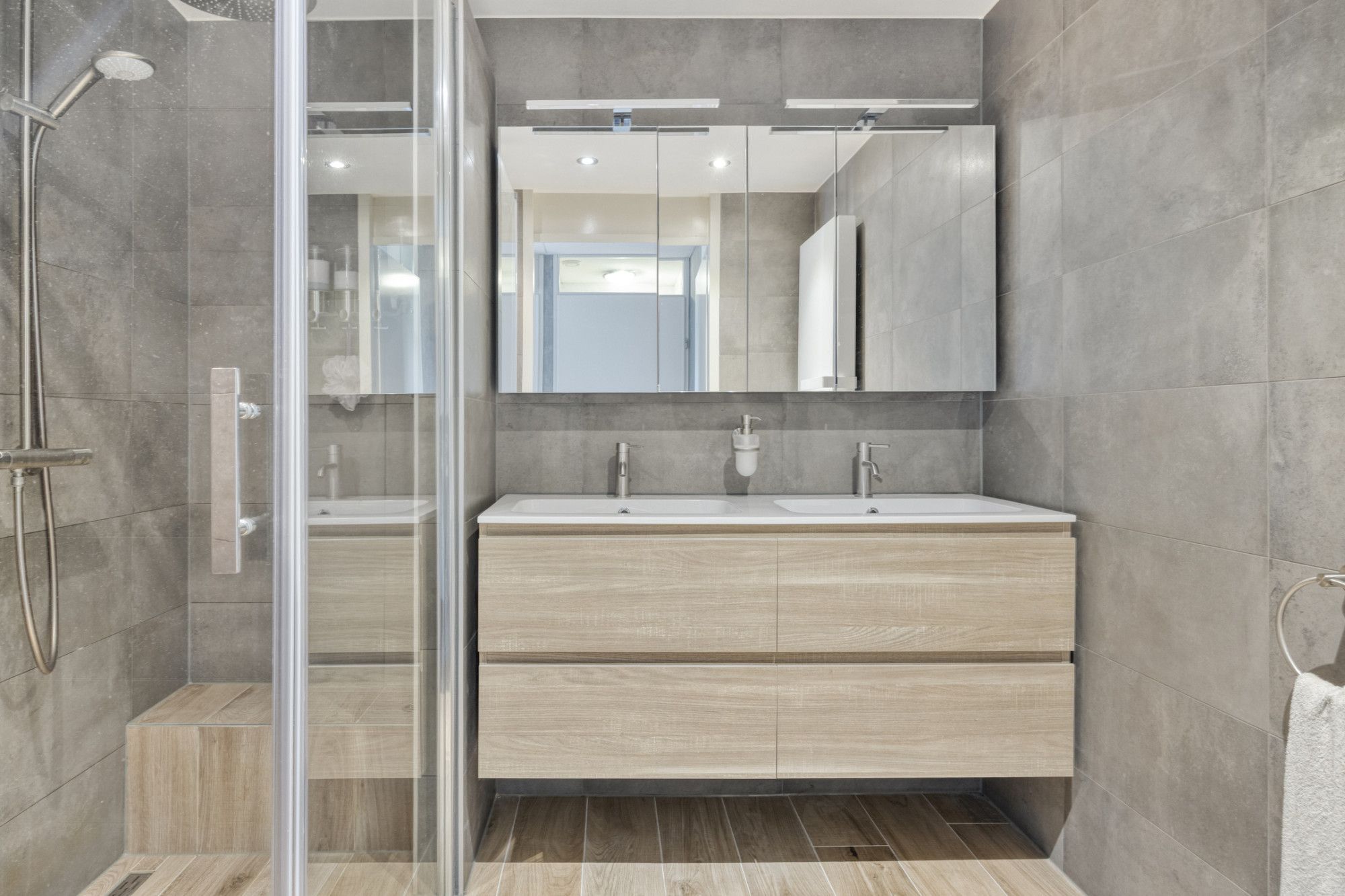 Moderne badkamer (2020) (2.35 x 2.07 m) met inloopdouche en badmeubel met dubbele wastafel.