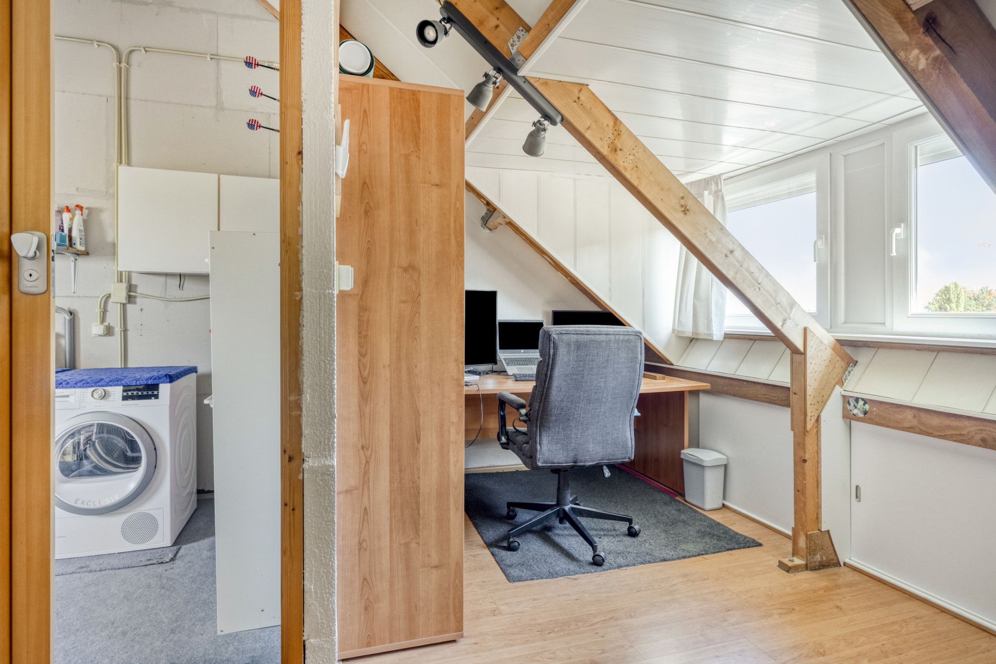 Middels gesloten trappenhuis toegang tot de zolderruimte met algemene ruimte voorzien van Velux dakraam, hybride verwarming systeem (Atag), witgoed aansluiting en rondom bergkasten in de dakschuinte.