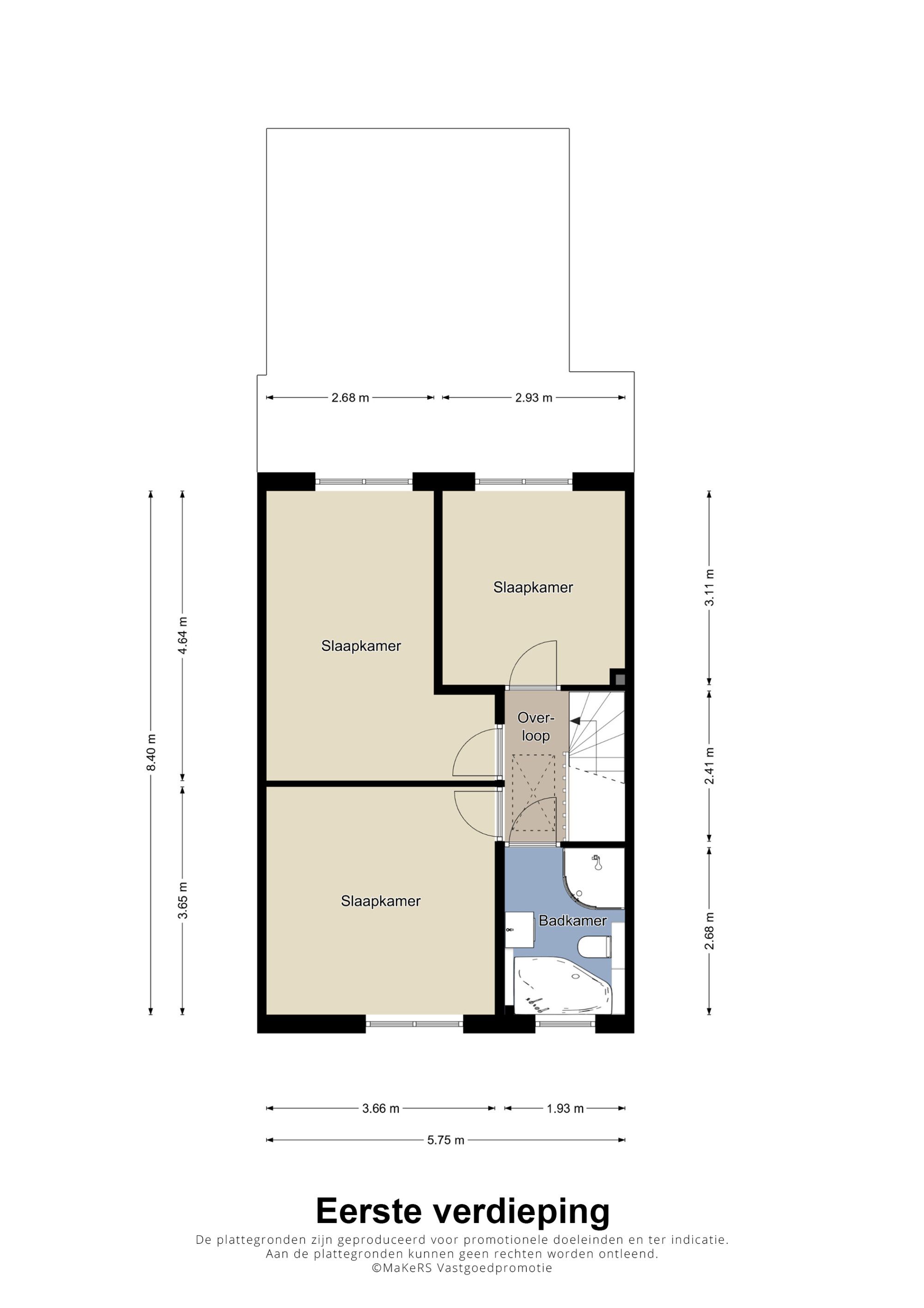 Op de eerste verdieping bevinden zich drie slaapkamers. De slaapkamer linksvoor wordt momenteel gebruikt als logeerkamer, de ruime hoofdslaapkamer aan de achterzijde is voorzien van airconditioning, en de derde slaapkamer is ingericht als kleedkamer.