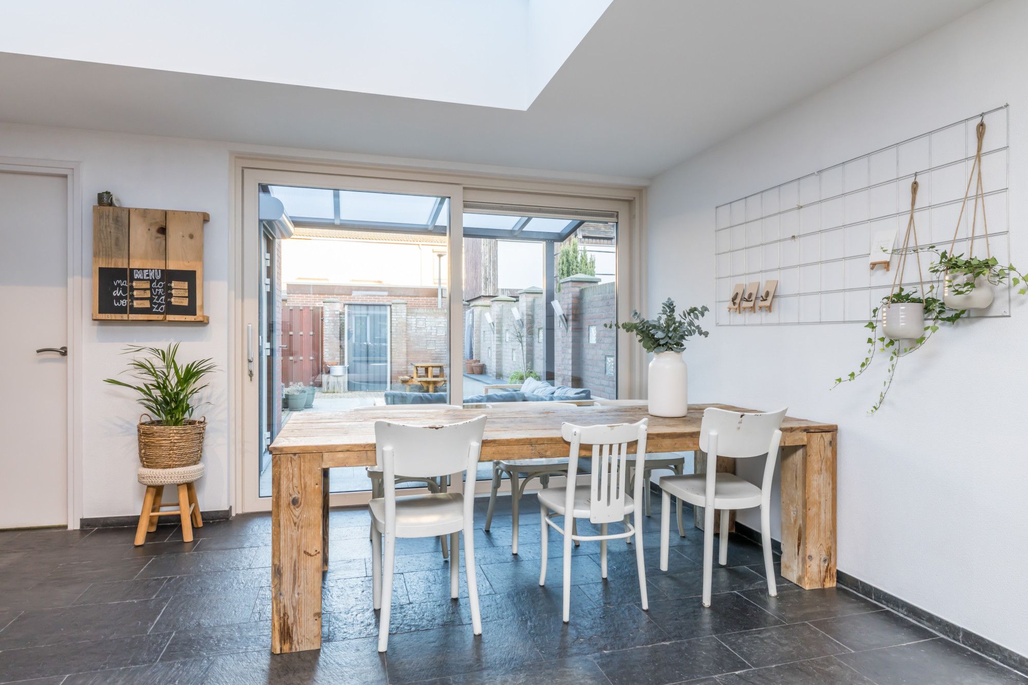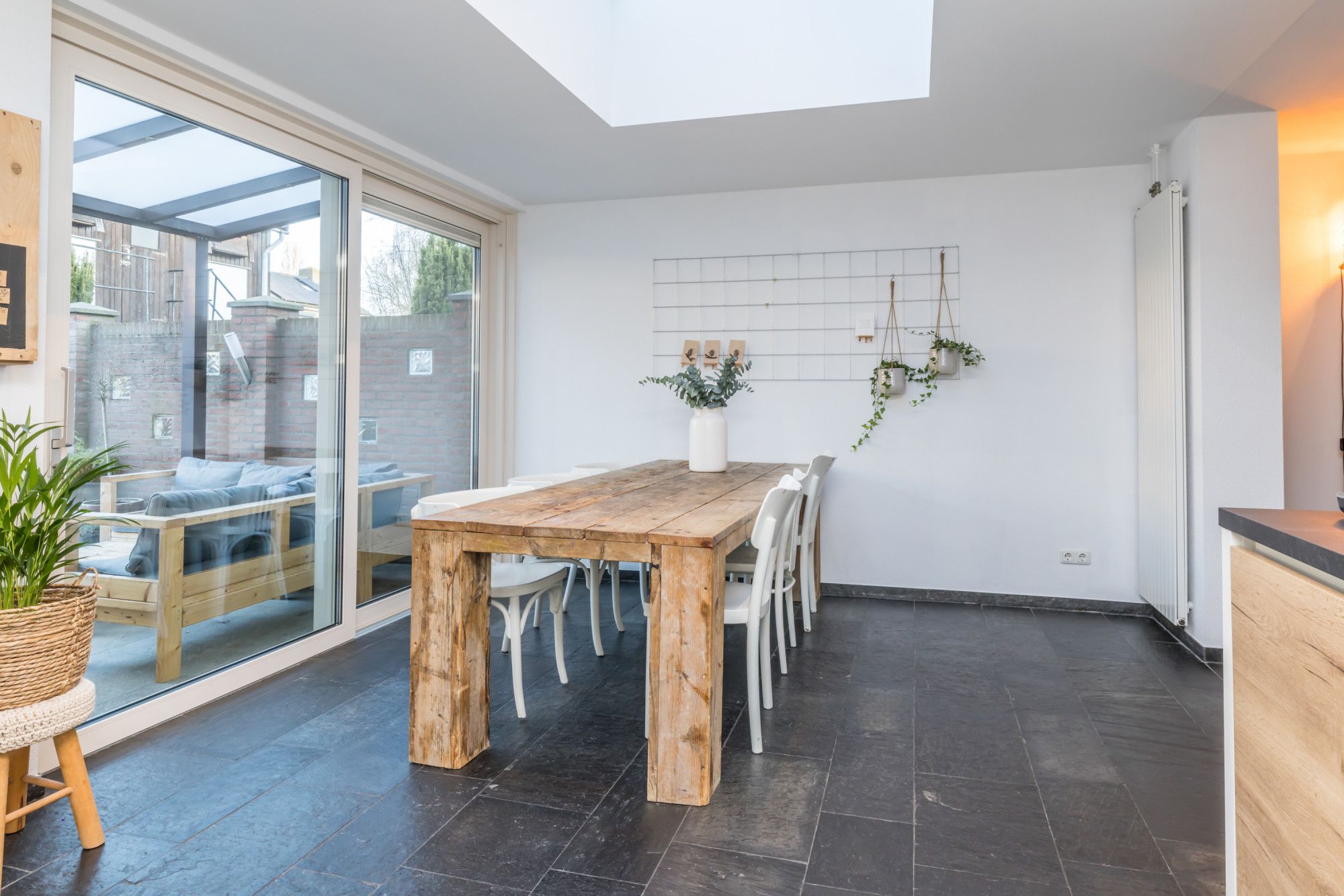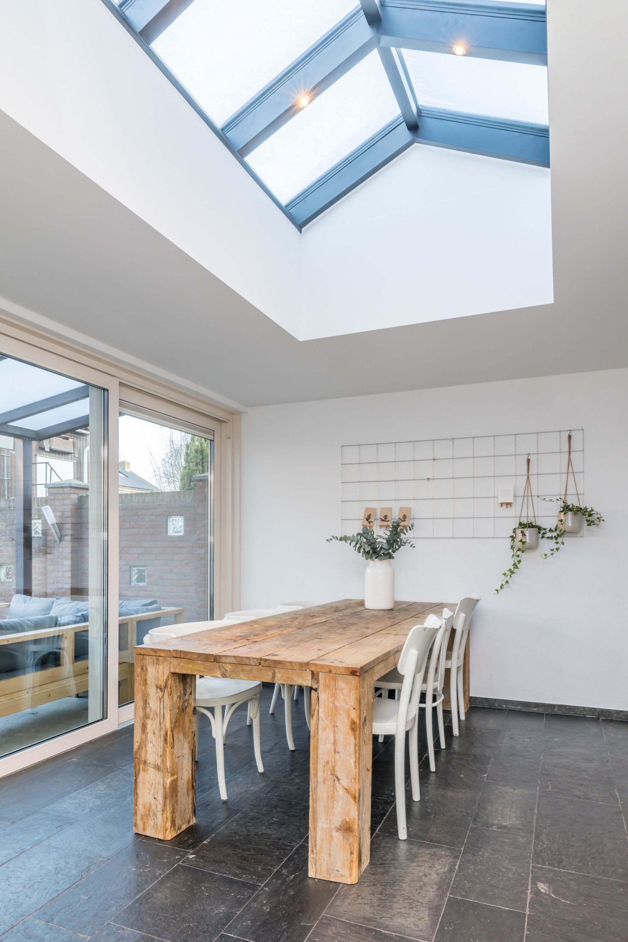 Aan de achterzijde bevindt zich de royale aanbouw met de eethoek, waar dankzij de lichtstraat een prachtige natuurlijke lichtinval ontstaat. Via de schuifpui is er direct toegang tot het overdekte terras en de achtertuin.