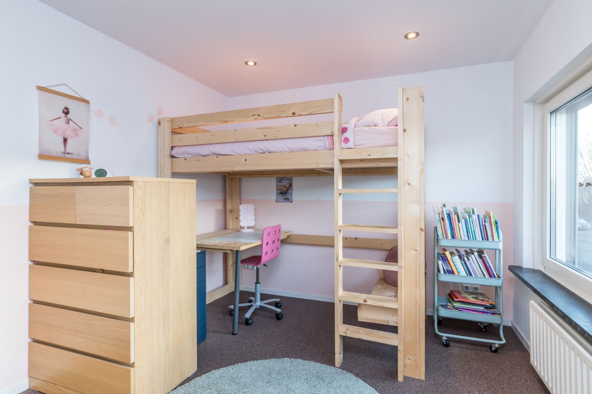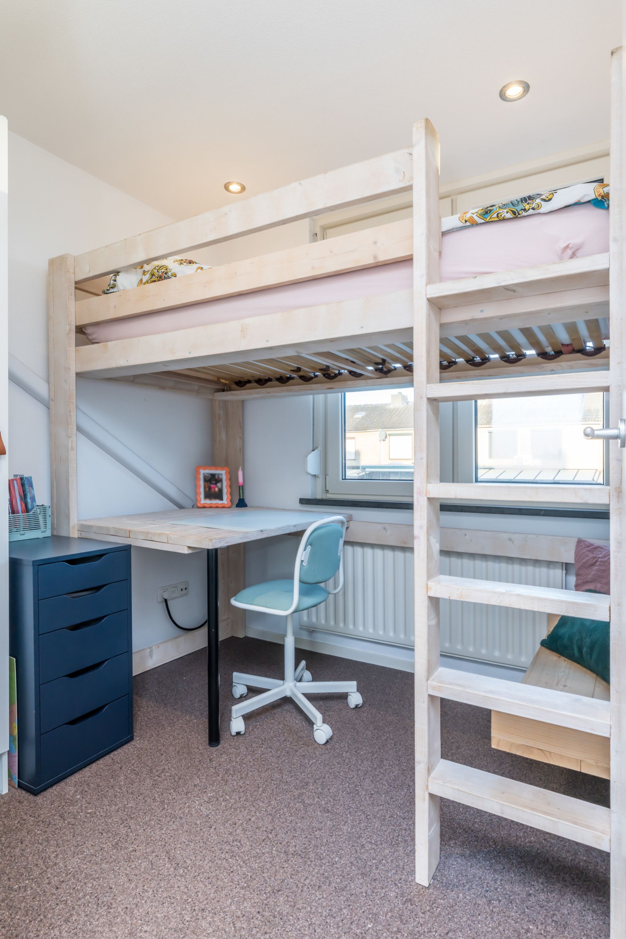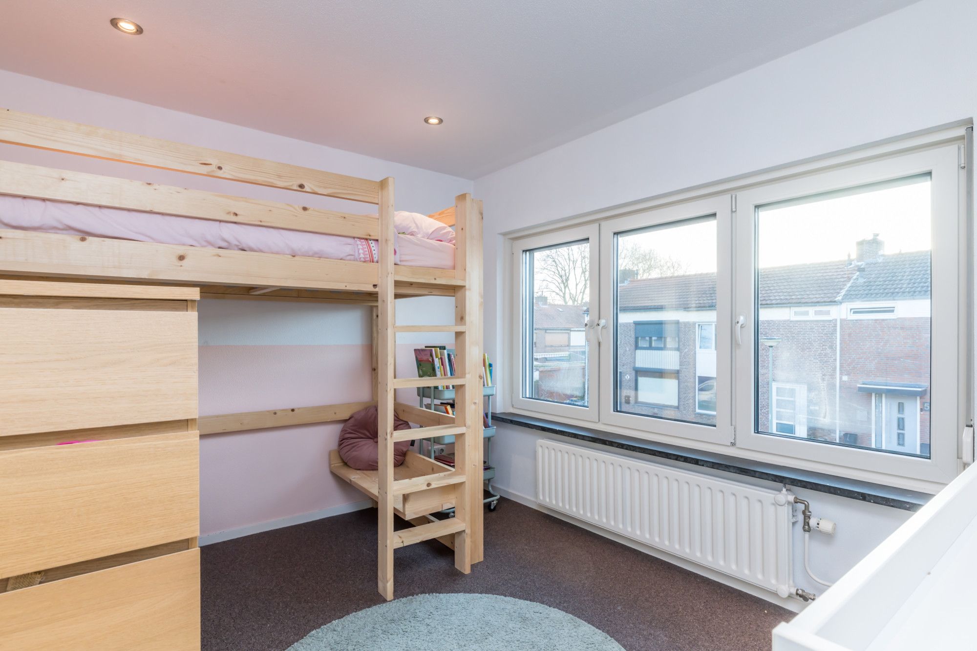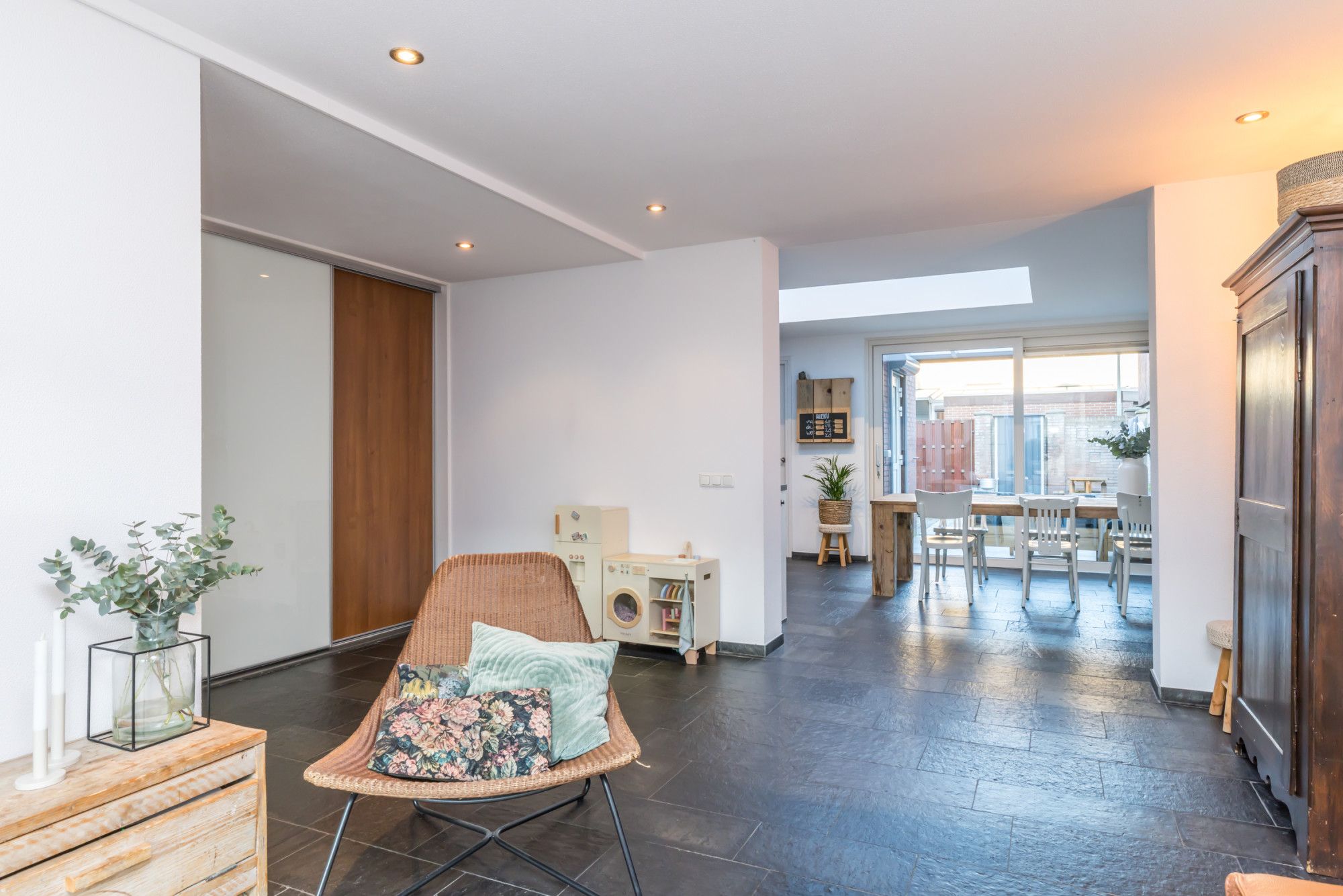 Centraal in de woning is ruimte gecreëerd voor spelende kinderen en een vaste kastenwand zorgt voor verrassend veel bergruimte.