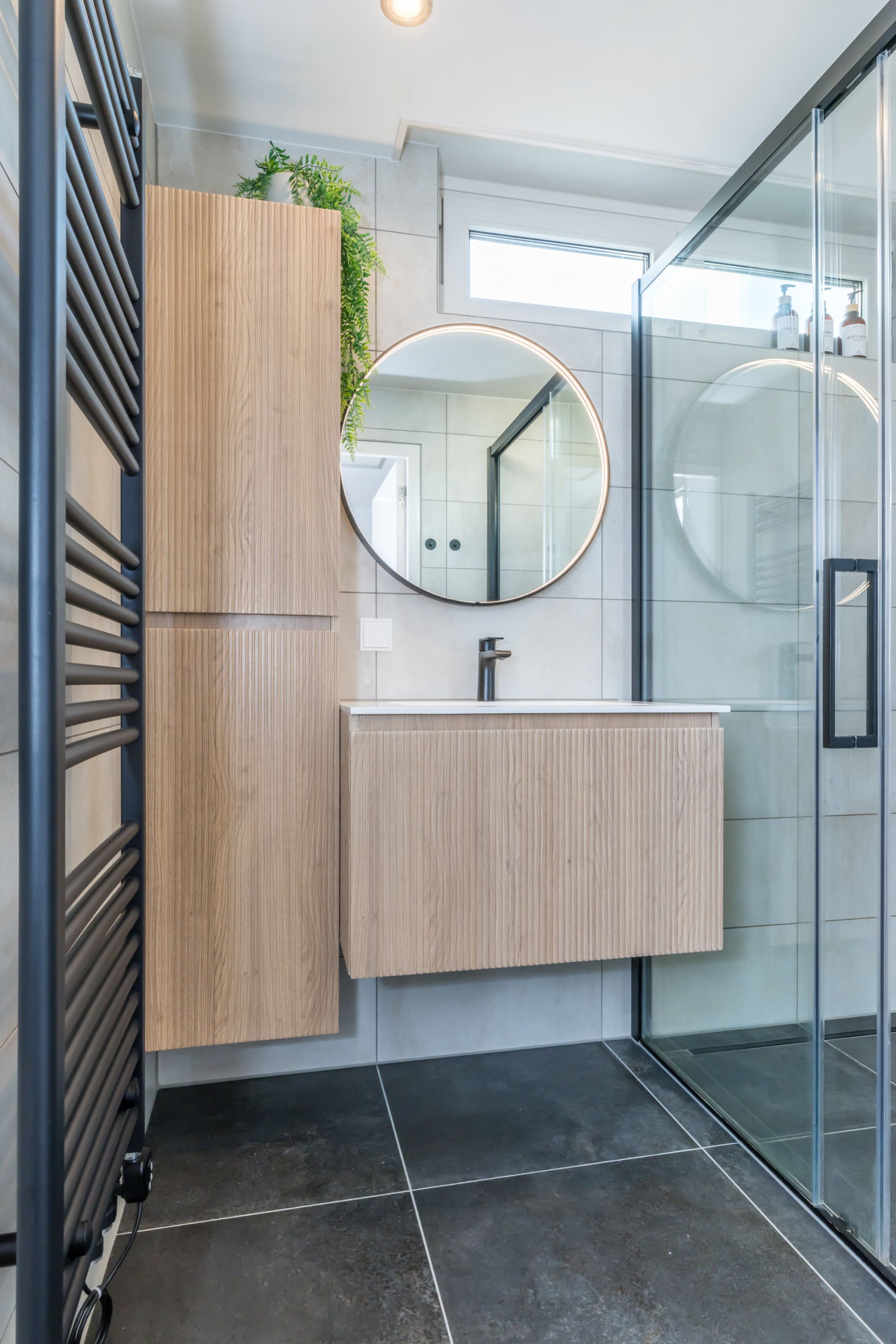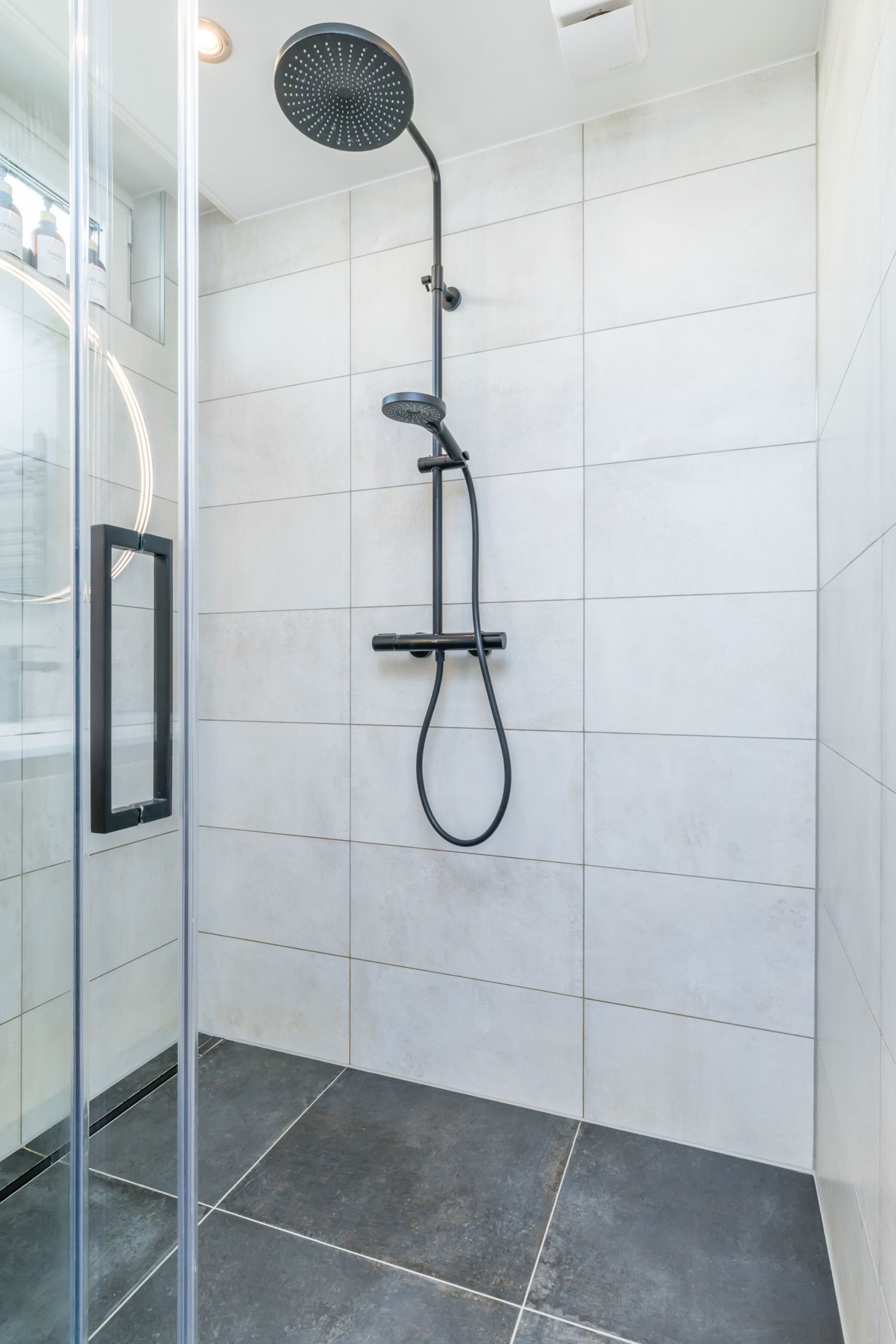 De onlangs gerenoveerde, geheel betegelde, luxe badkamer linksvoor is voorzien van een badkamermeubel met vaste wastafel / anti-condens spiegel / zeer ruime inloop-regendouche / mechanische afzuiging en een designradiator