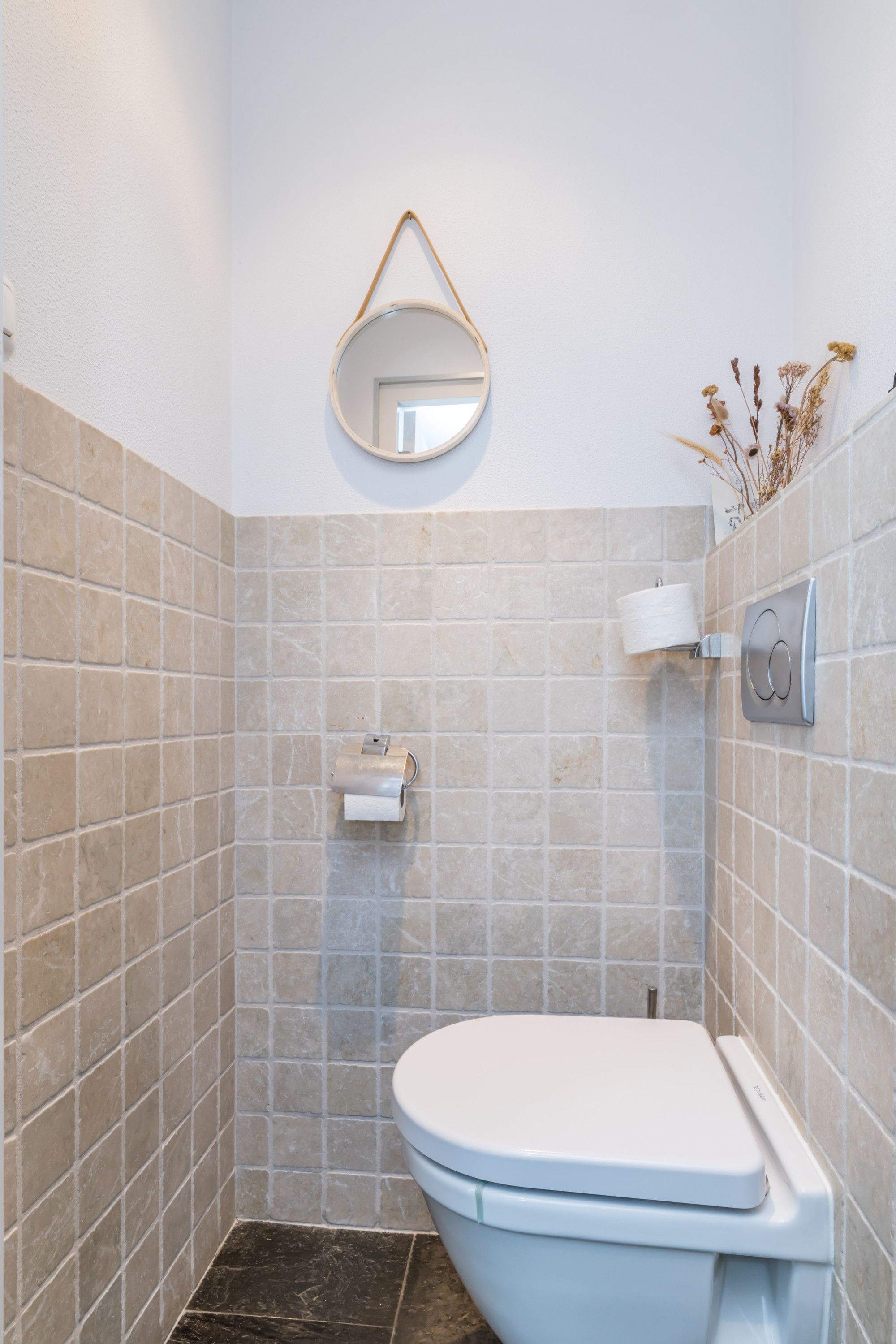 * HALF-BETEGELD STRAK AFGEWERKT GASTENTOILET MET ZWEVEND WANDCLOSET