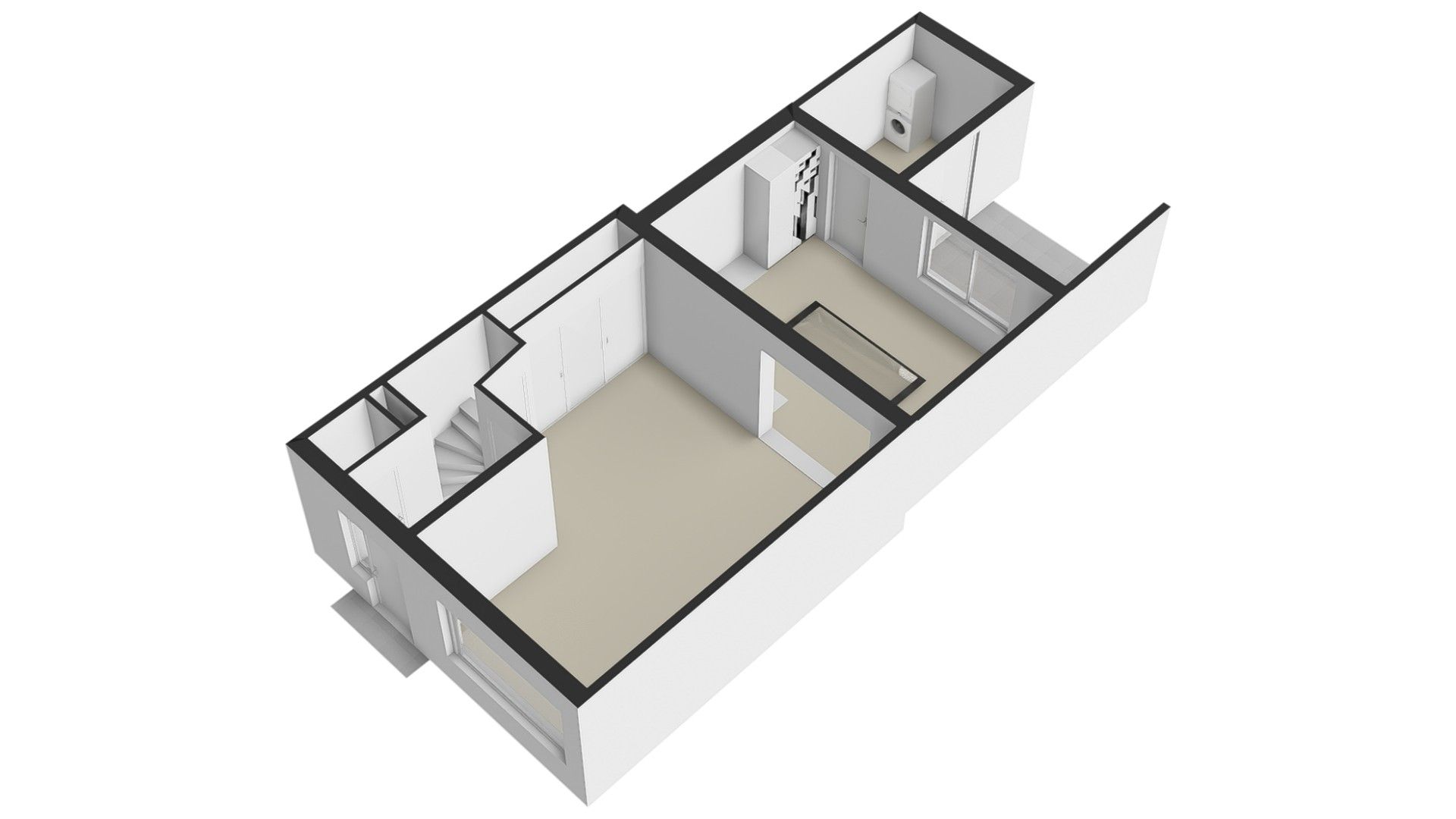Aansluitend bevindt zich de bijkeuken met witgoedaansluitingen voor wasmachine en droger, extra bergruimte en een loopdeur naar het terras en de tuin.