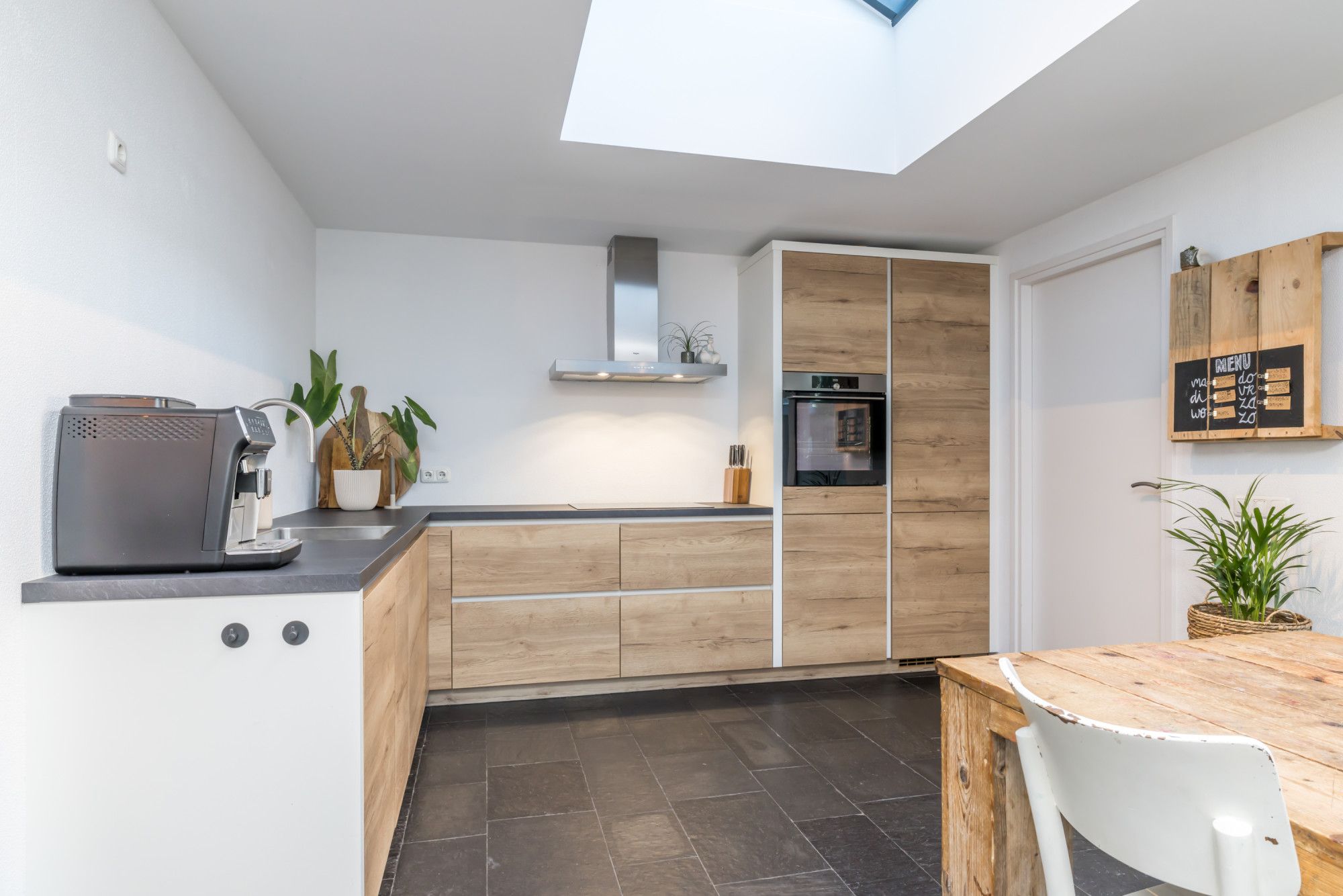Royale achterbouw met veel extra daglicht toetreding via de lichtstraat. Eigentijdse, recent geplaatste, luxe inbouwkeuken in hoekopstelling voorzien van 4 zones inductiekookplaat / RVS-wandschouwafzuigkap / elektrische oven / koel-/vriescombinatie, wasbak een een vaatwasmachine. Doorgang naar de bijkeuken en een schuifpui biedt toegang tot het overdekte terras en de achtertuin.