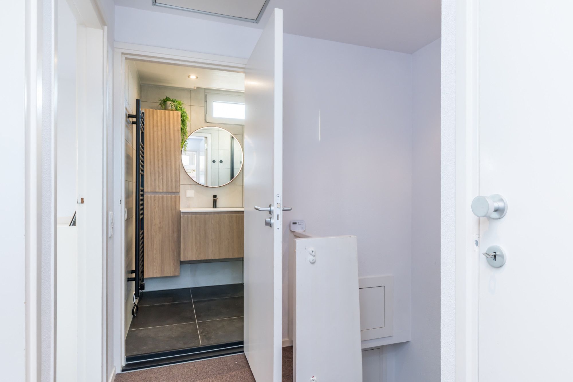 De onlangs gerenoveerde, luxe badkamer is geheel betegeld en voorzien van een vaste wastafel in een badkamermeubel, anti-condens spiegel, ruime inloopdouche, mechanische ventilatie en een design radiator.