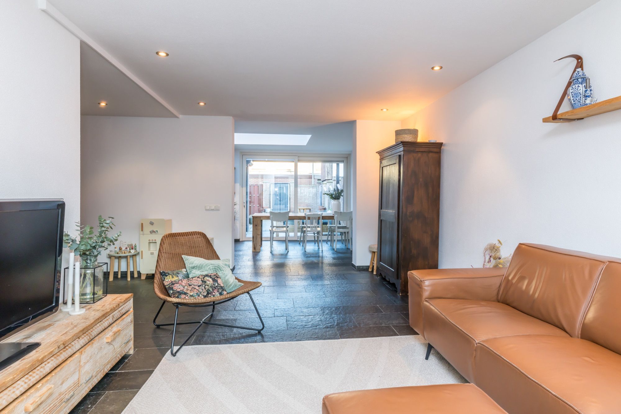 Ruime L-vormige woonkamer met veel lichtinval en vaste kastenwand voorzien van kapstok, garderobe en opbergmogelijkheden. Verdiepte trapkast voor provisie en opslag. Aan de voorzijde gelegen living/lounge met multimediale aansluitingen en glasvezel. Centraal in de woonkamer, speelruimte voor de kinderen. Doorgang naar de aanbouw. De begane grond geheel voorzien van dorpel-loos gelegde Noorse leisteenvloer met vloerverwarming.