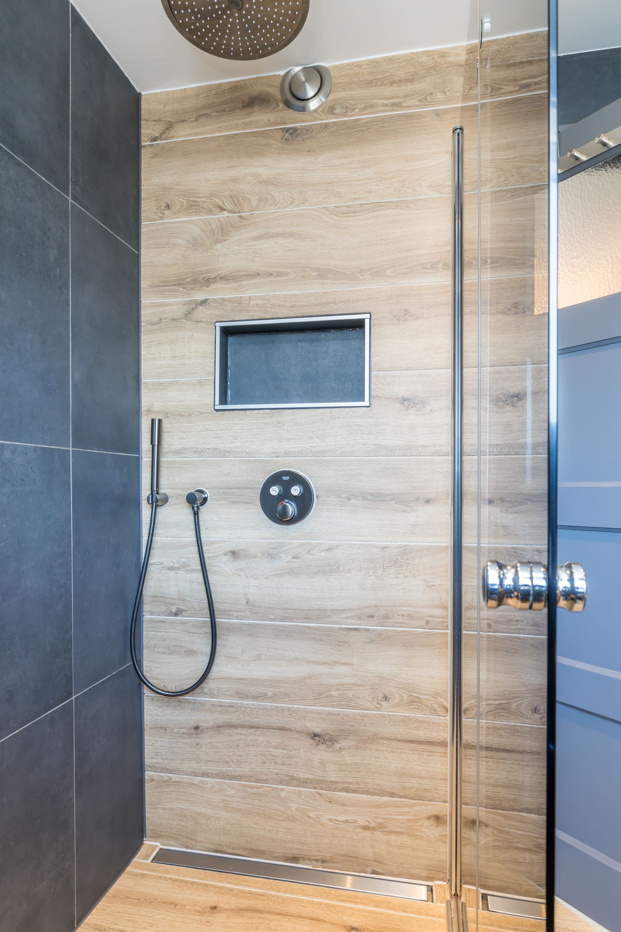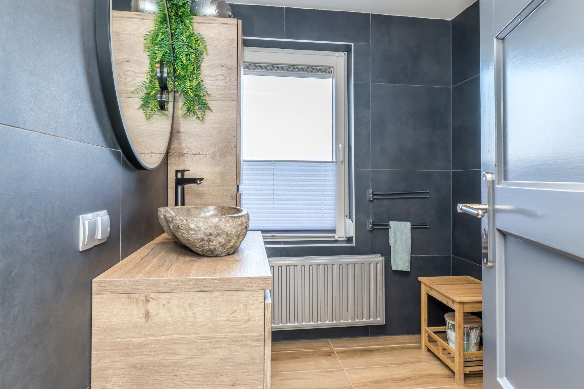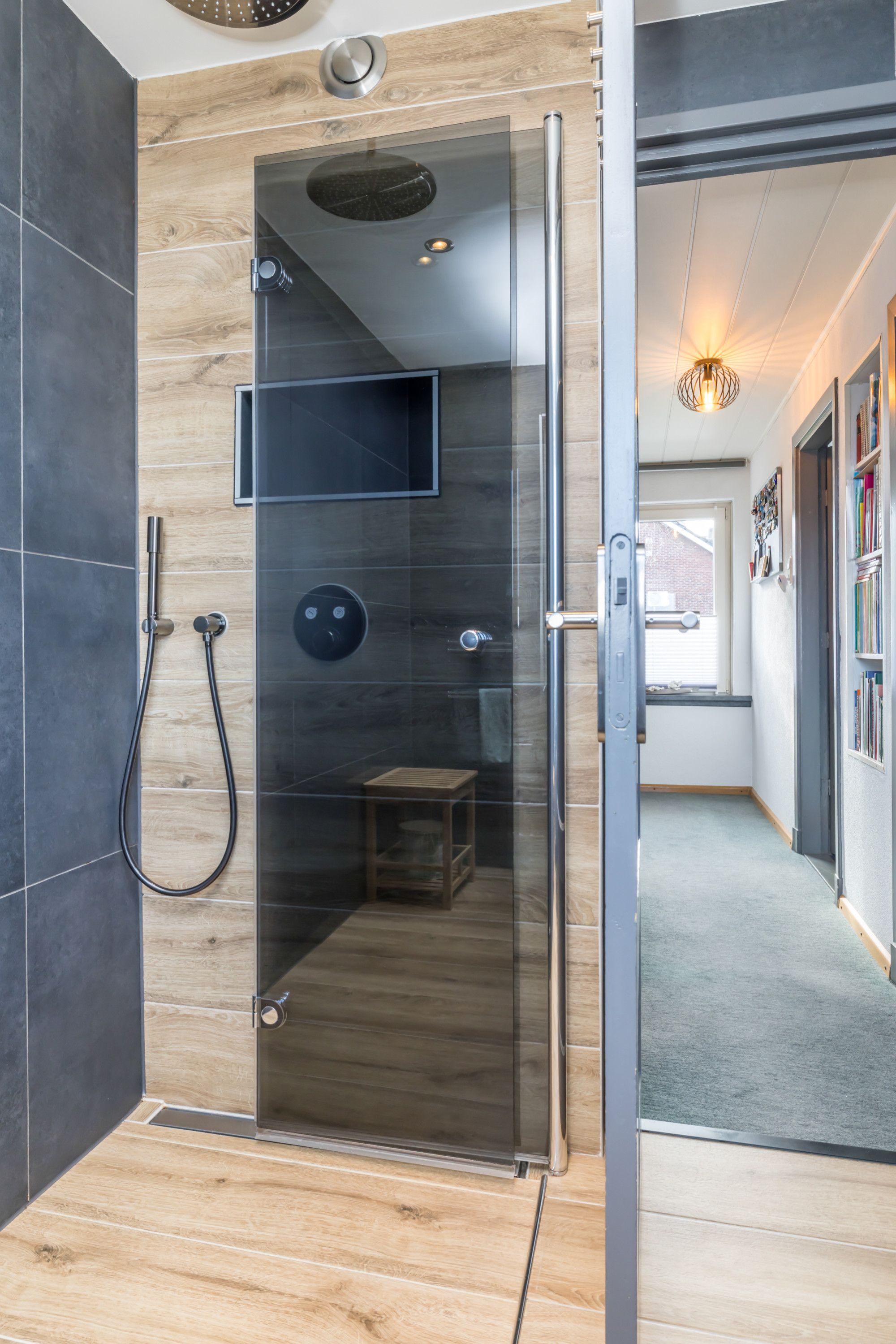 De geheel betegelde en gerenoveerde badkamer is uitgerust met een ruime inloopdouche en een stijlvol badkamermeubel met waskom.