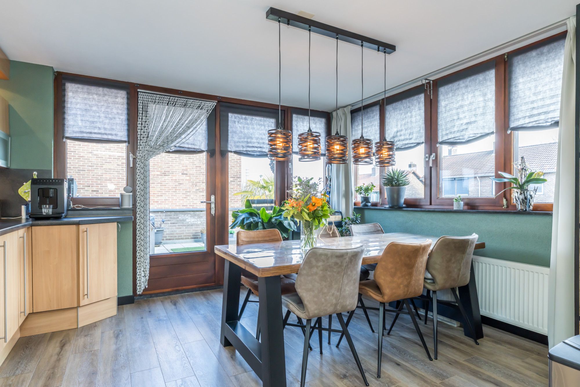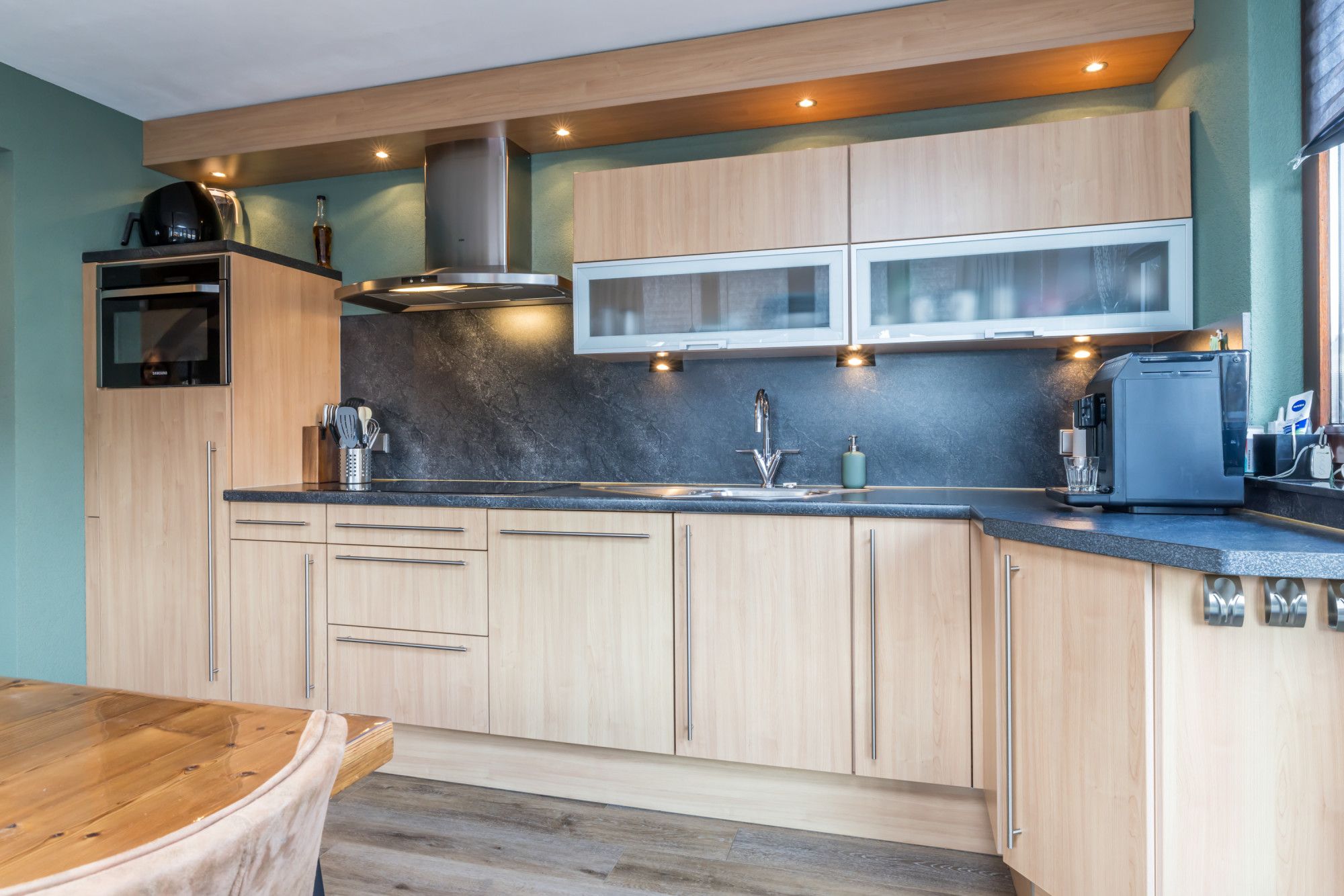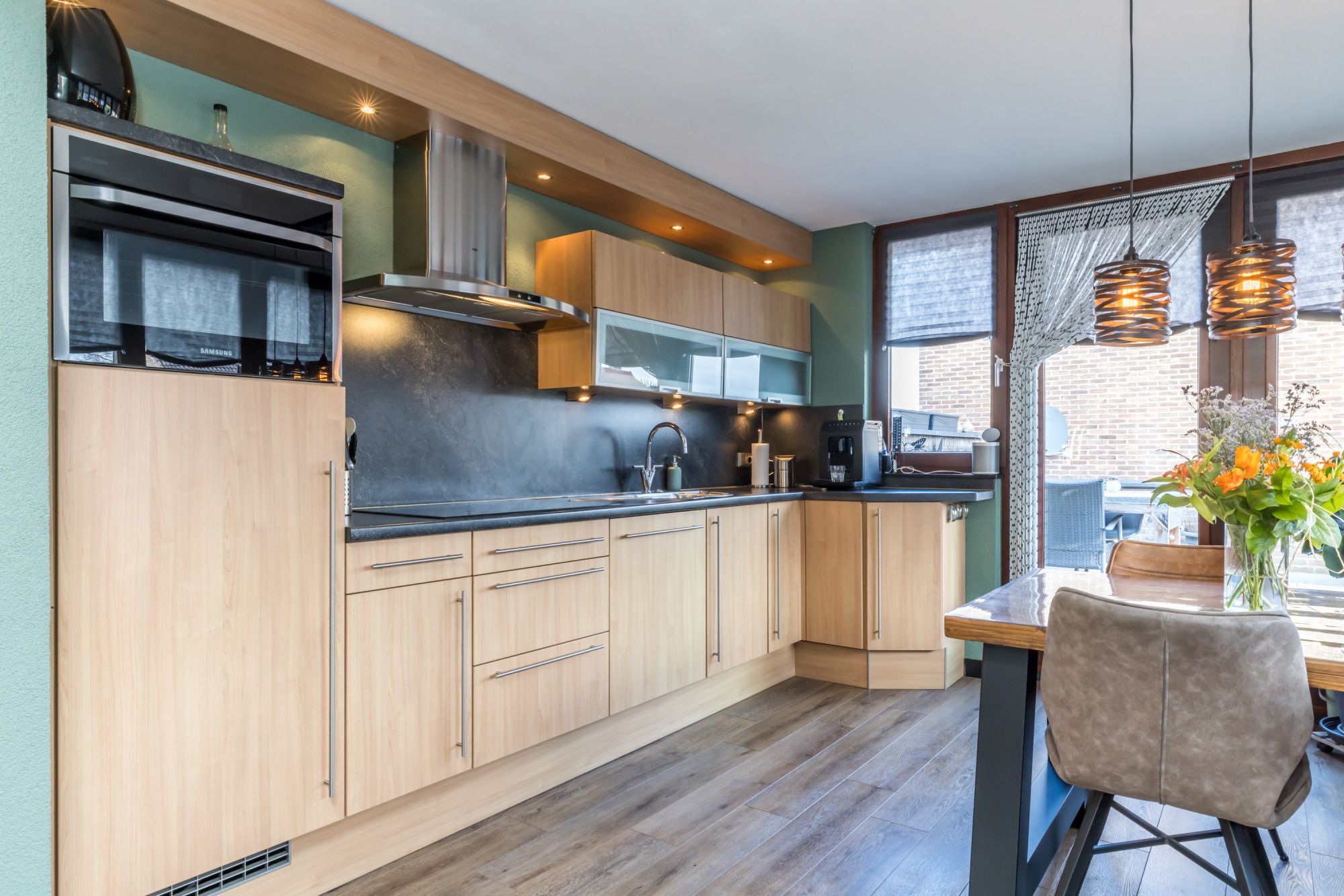 In de royale aanbouw bevindt zich de keukenruimte, waar veel daglicht binnenvalt via de grote raampartijen. Hier is een inbouwkeuken geplaatst, voorzien van apparatuur. De dubbele openslaande tuindeuren bieden direct toegang tot het royale dakterras: een heerlijke plek om in alle rust te ontspannen of te genieten van lange zomeravonden.