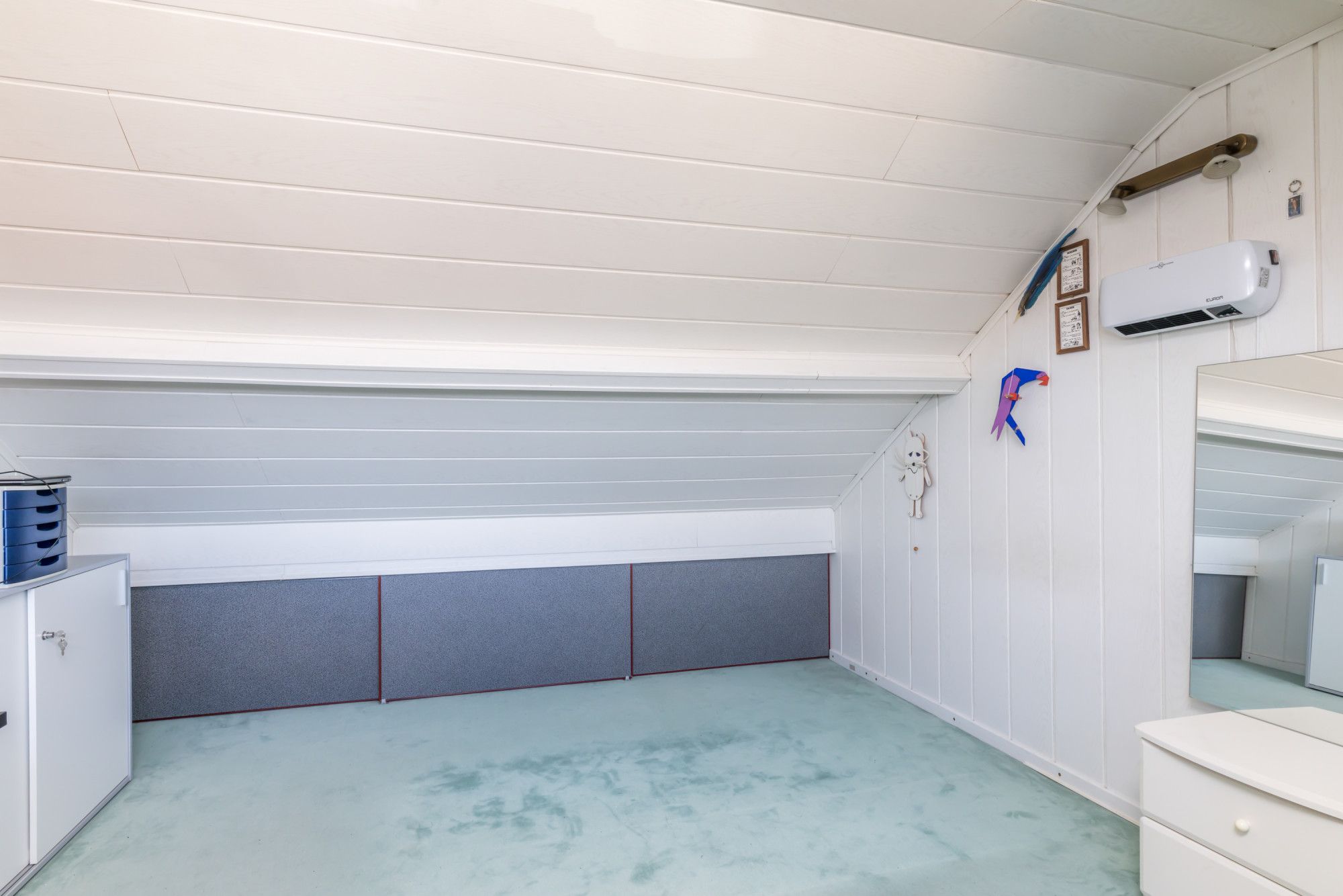 Veel extra bergruimte in de schuinte van de dakconstructie. Op het hoofddak zijn 13 zonnepanelen aanwezig.