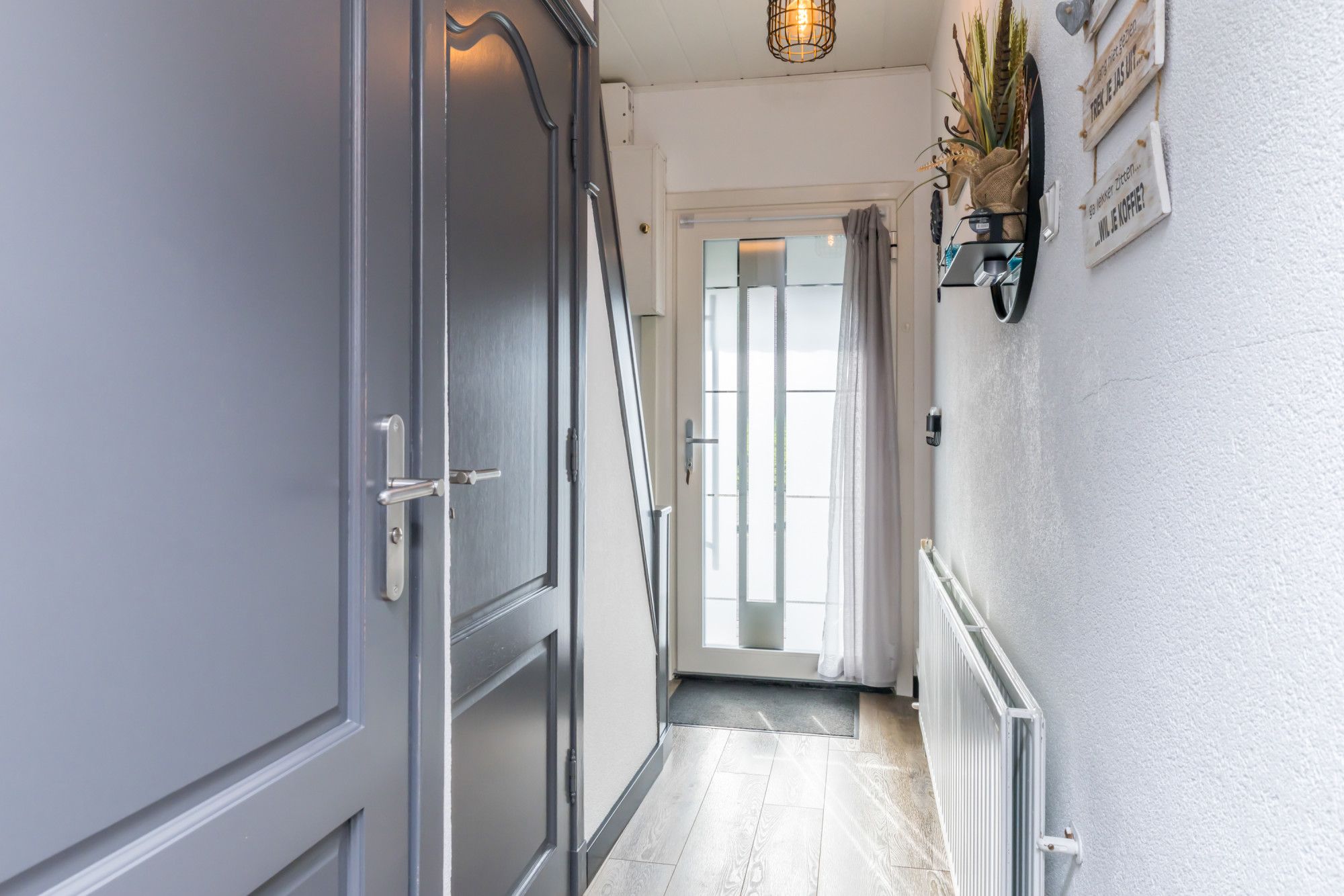 Hal / Entree, garderobehoek, trappenhuis naar de eerste verdieping en het souterrain. Meterkast voorzien van 4 groepsinstallatie / aardlekschakelaar / kookgroep / aparte groep voor de zonnepanelen / digitale meters met dag- en nachtstroomaansluiting en waar geplaatst de omvormer voor de zonnepanelen. Eigentijds geheel betegeld gastentoilet met zwevend wandcloset. Loopdeur naar de woonkamer.
