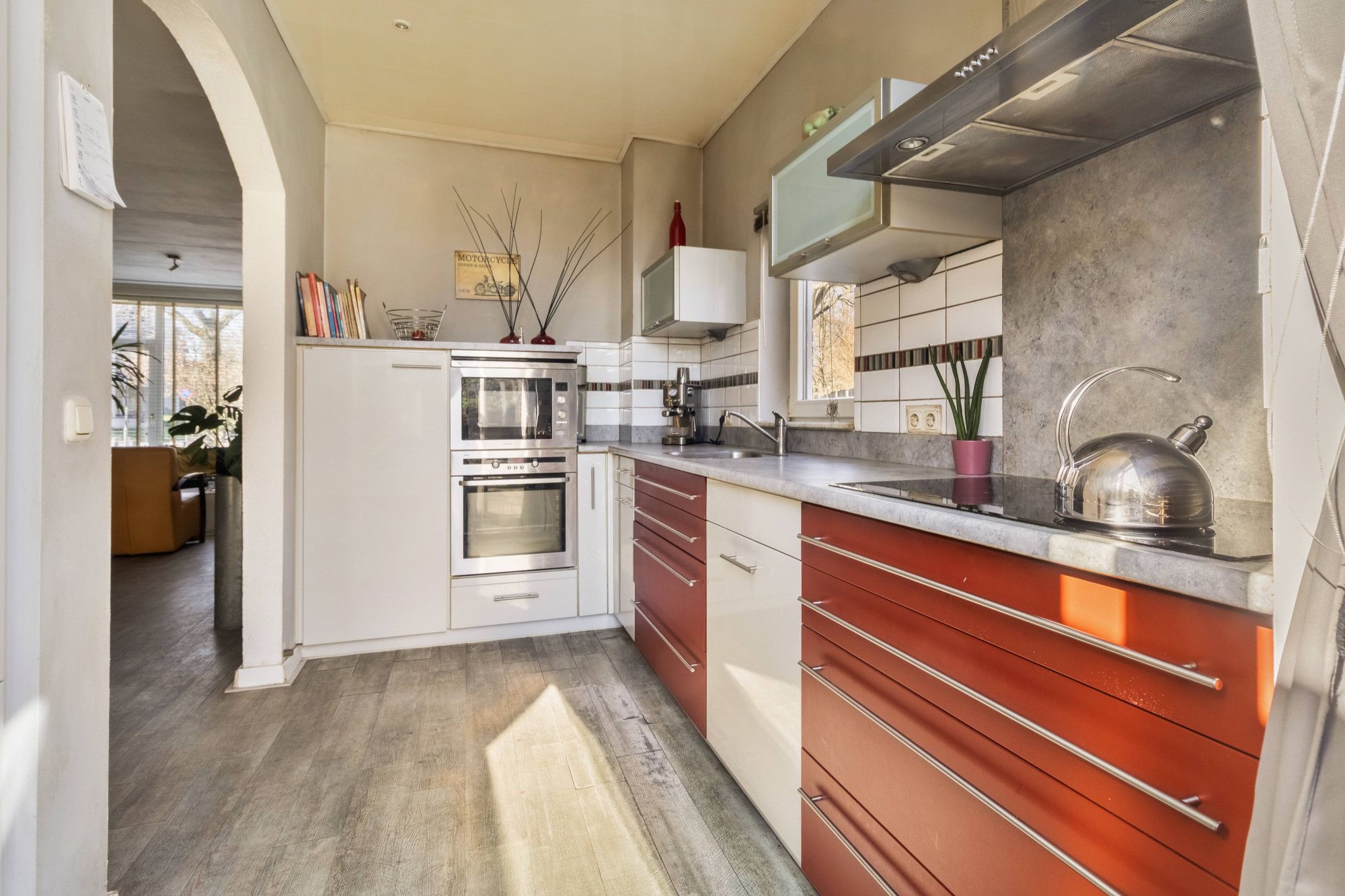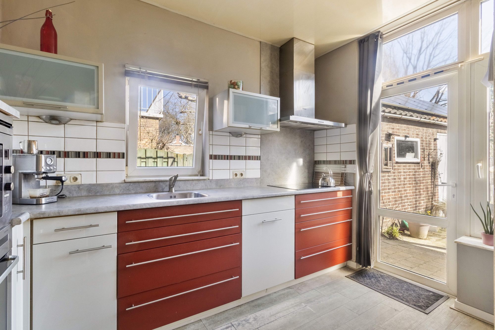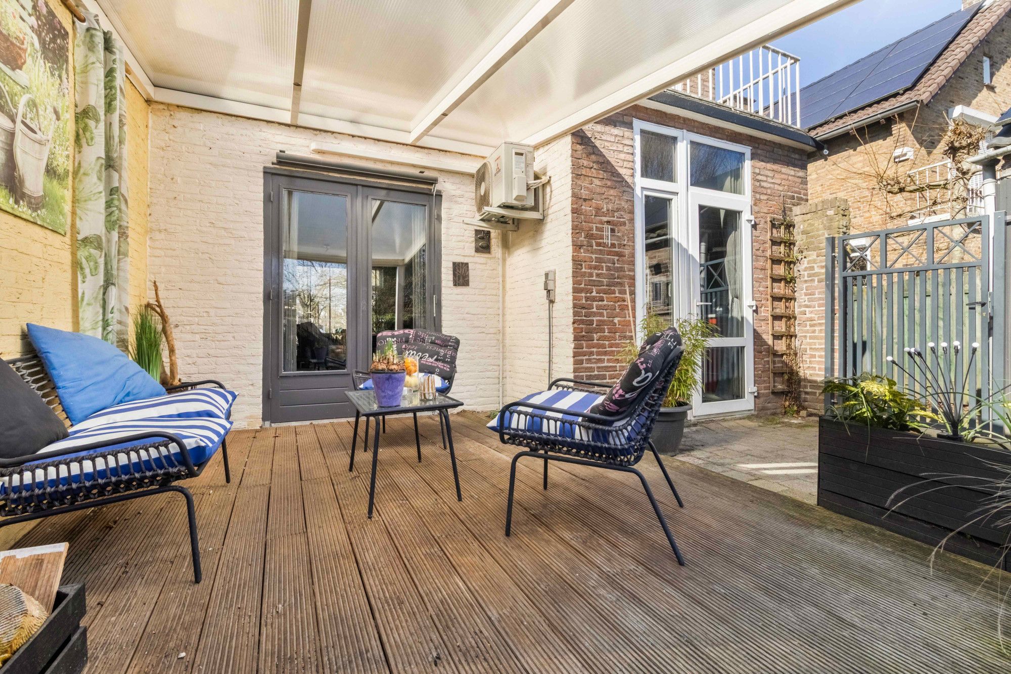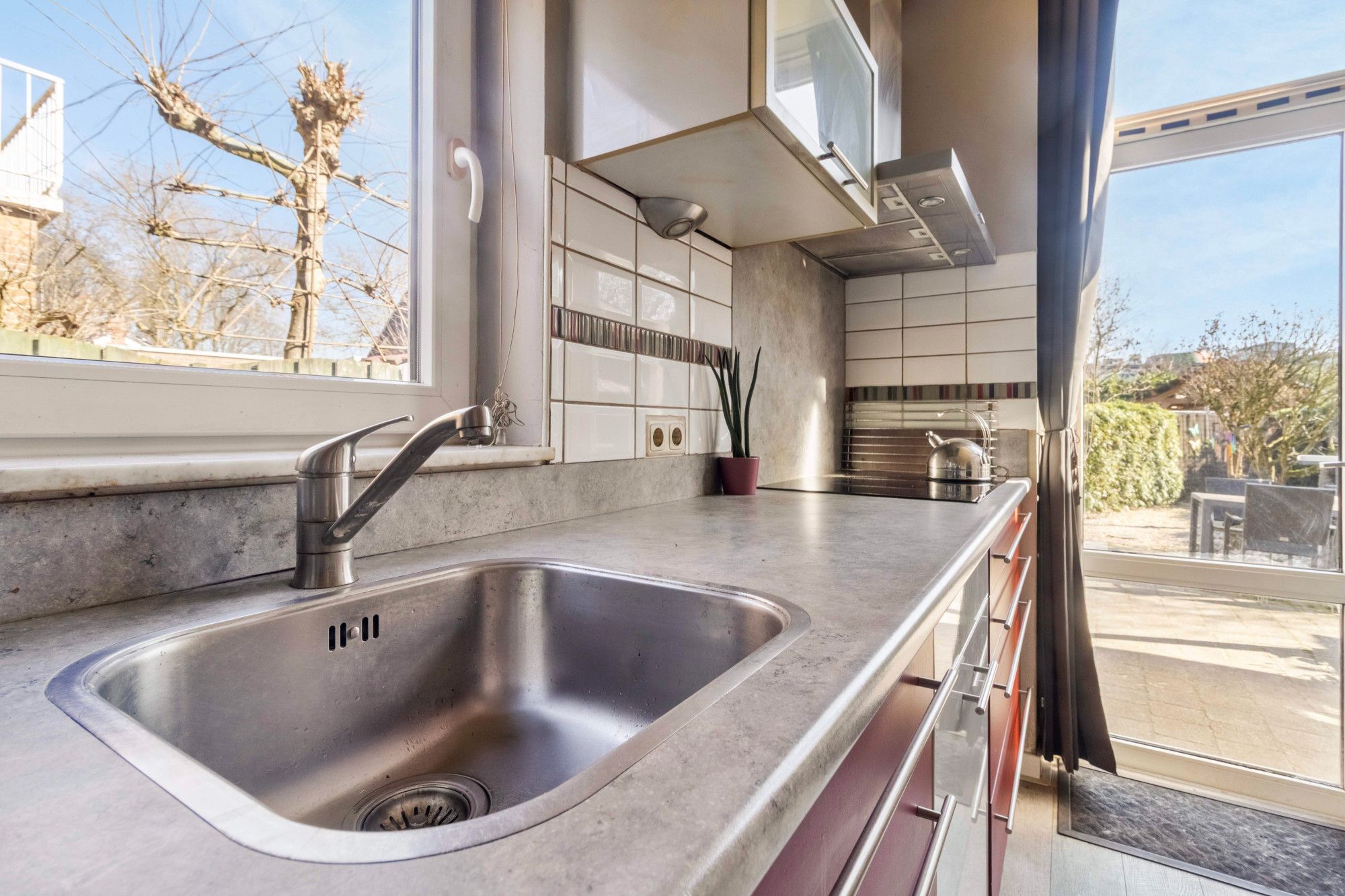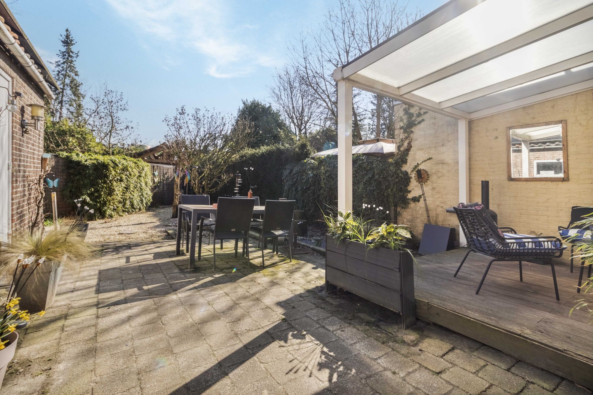 Vanuit de keuken toegang naar achtertuin met ruime terrasoverkapping (4.07 x 3.20 m), terras en verdere aanplanting.