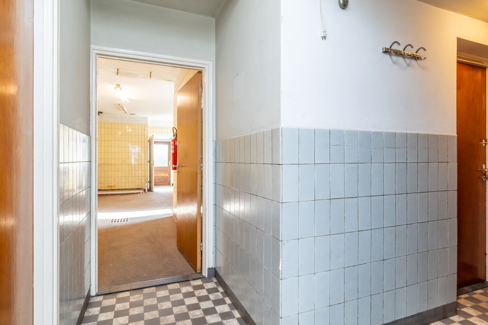 Het tussenportaal verbindt het winkel- werk en woon gedeelte op praktische wijze en geeft toegang tot een kantoorruimte met vaste kastenwand.