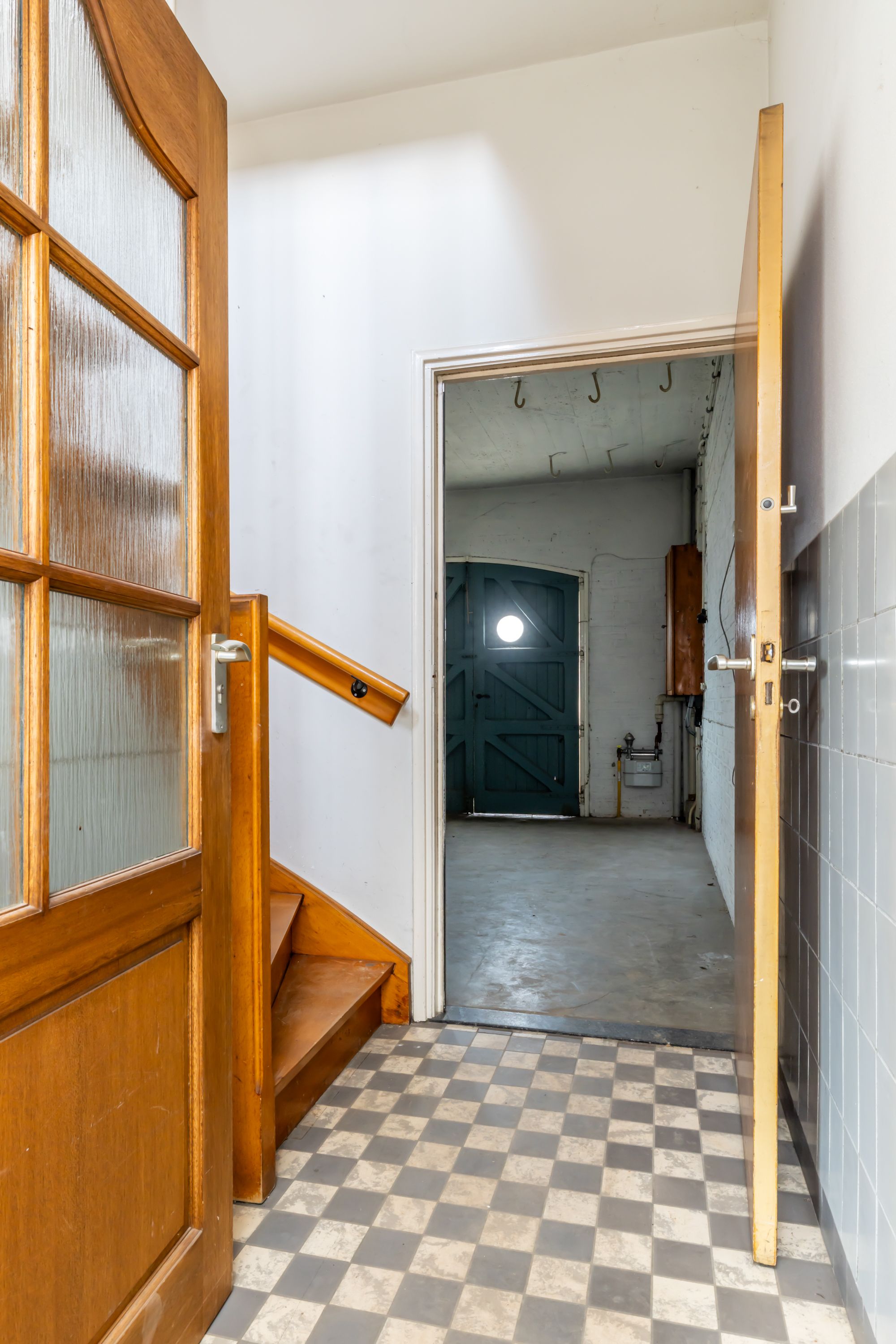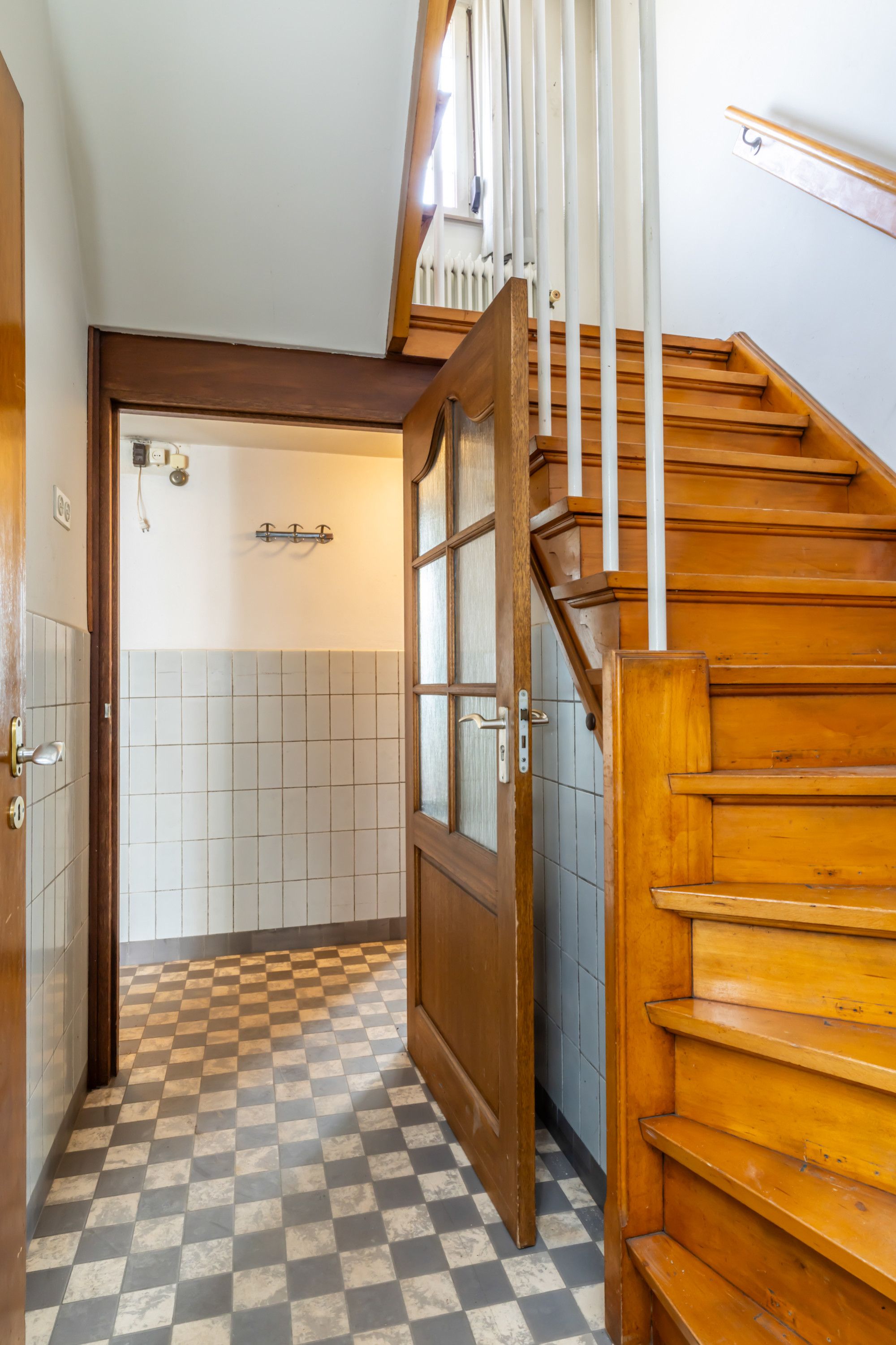 Voorgelegen garage met dubbele houten poort en ruimte voor een auto. Meterkast voorzien van een 10 groepsinstallatie / 3x aardlekschakelaar / 3 fase aansluiting / dag-/nachtstroom / digitale meters en glasvezelinternet. Toegang tot de tussenhal en het authentieke trappenhuis naar de eerste verdieping.