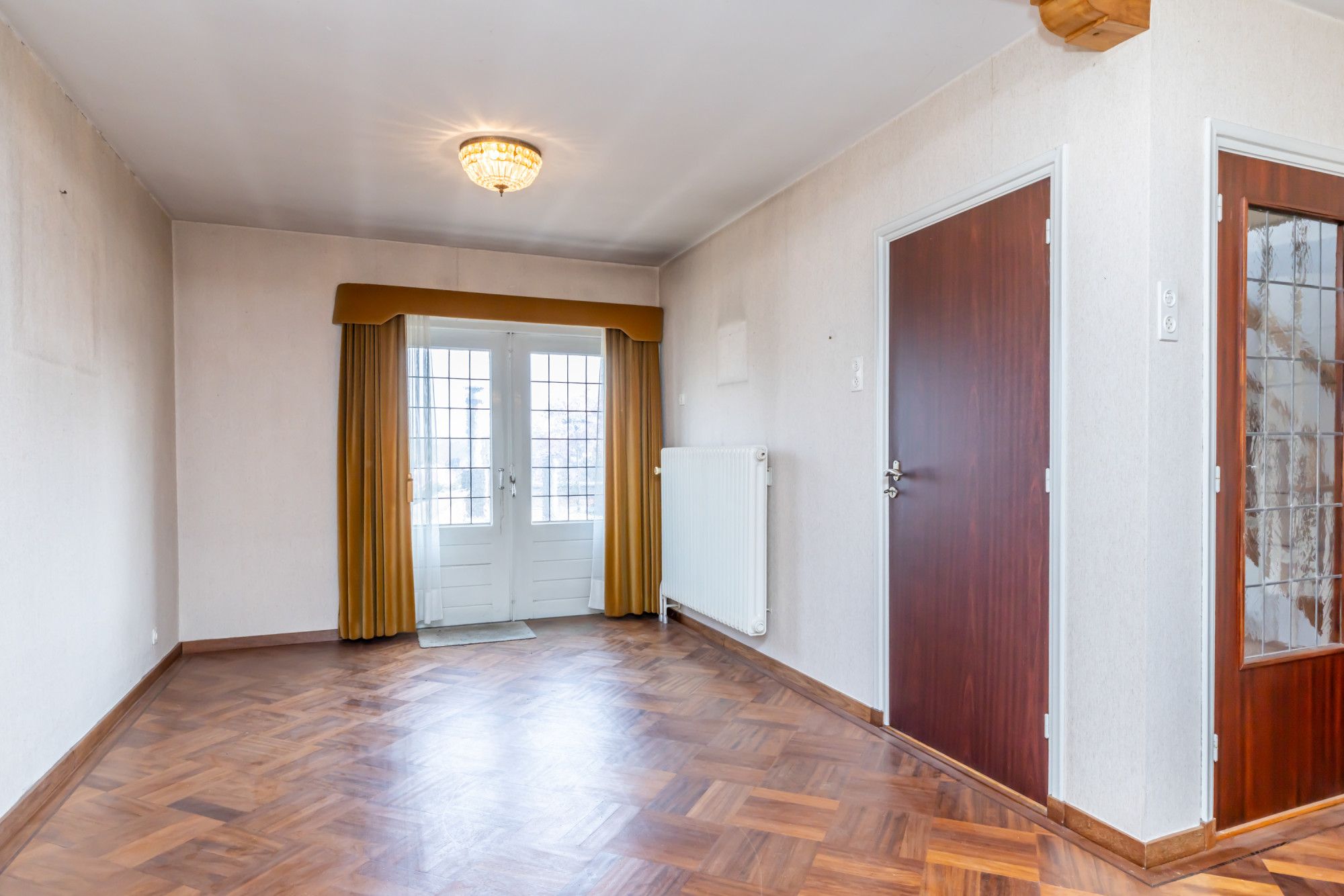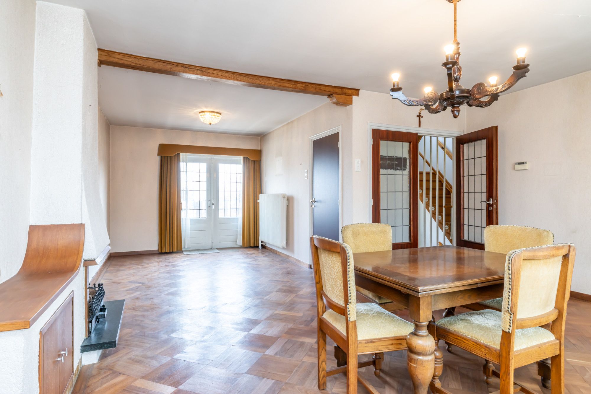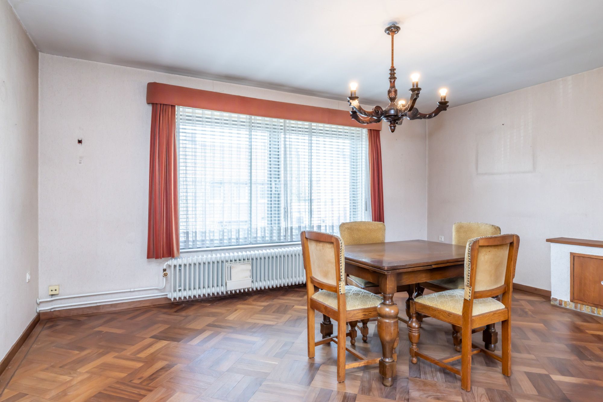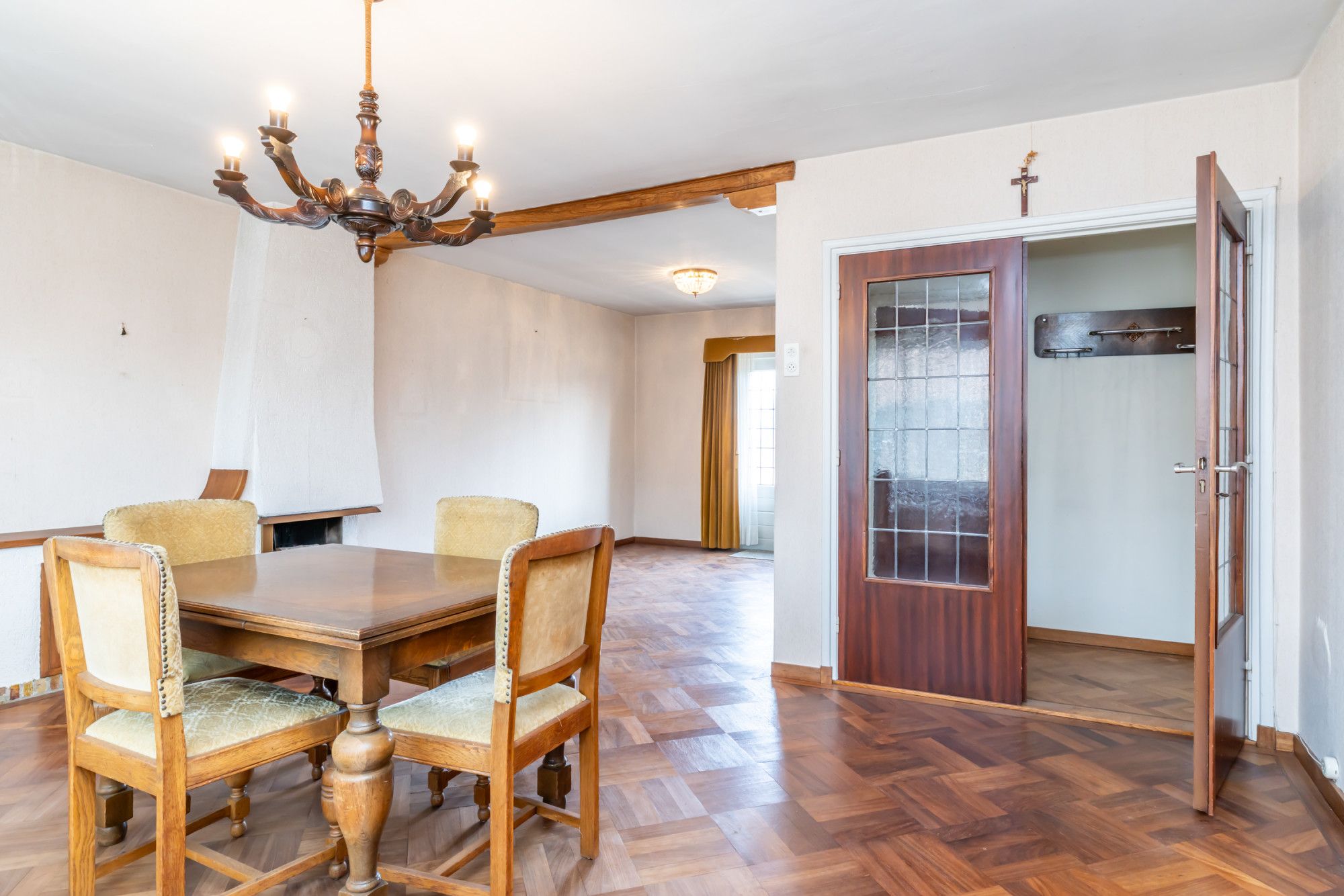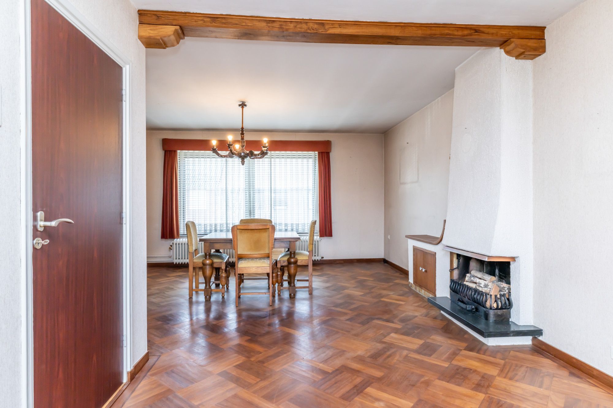 De woonkamer met parketvloer, ligt aan de linkerzijde op de verdieping. Er is een schouwpartij met open haard aanwezig en een eethoek (voormalige slaapkamer) met dubbele openslaande deuren bieden toegang tot het dakterras.