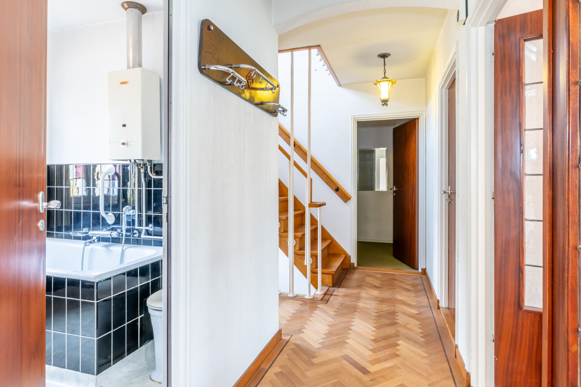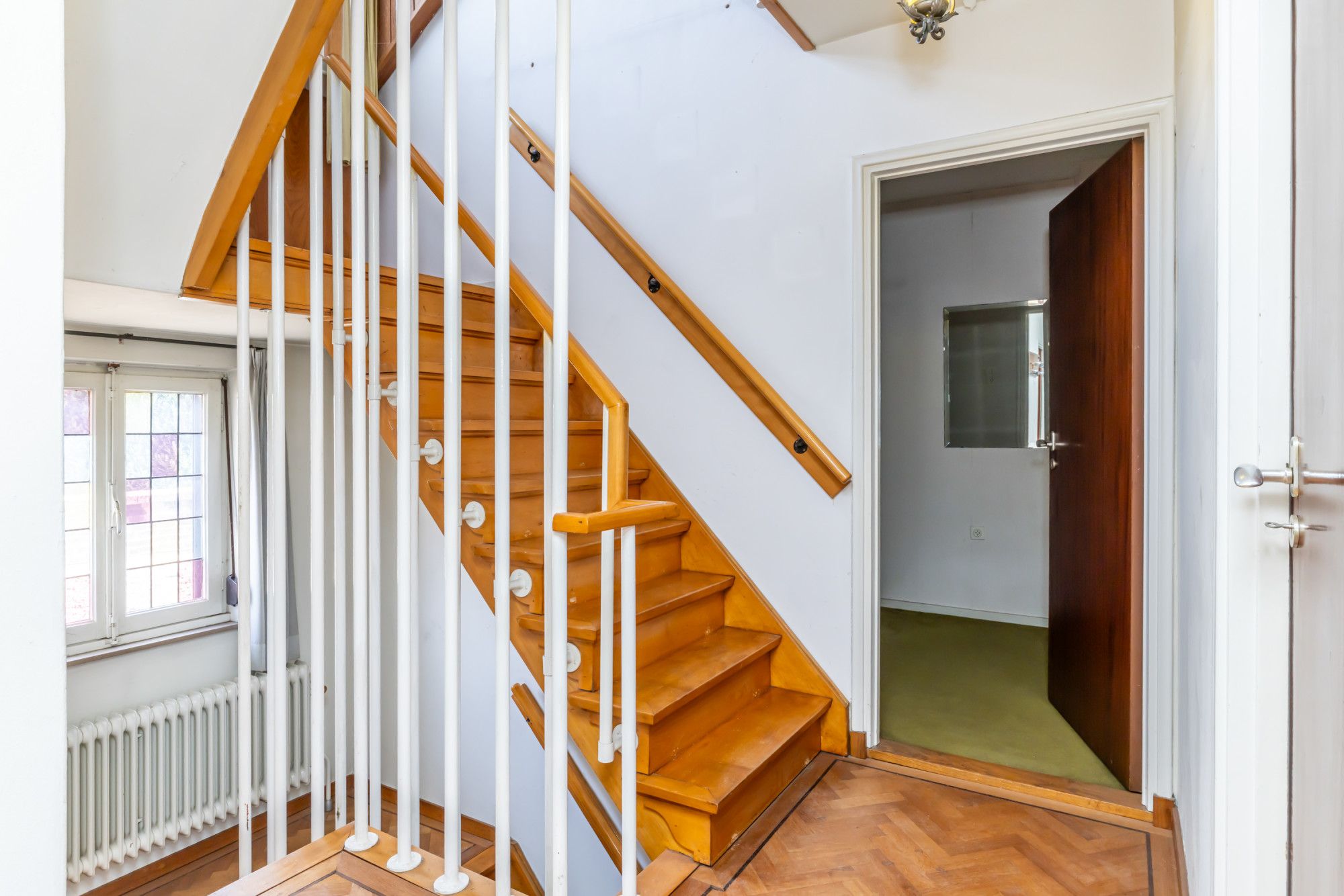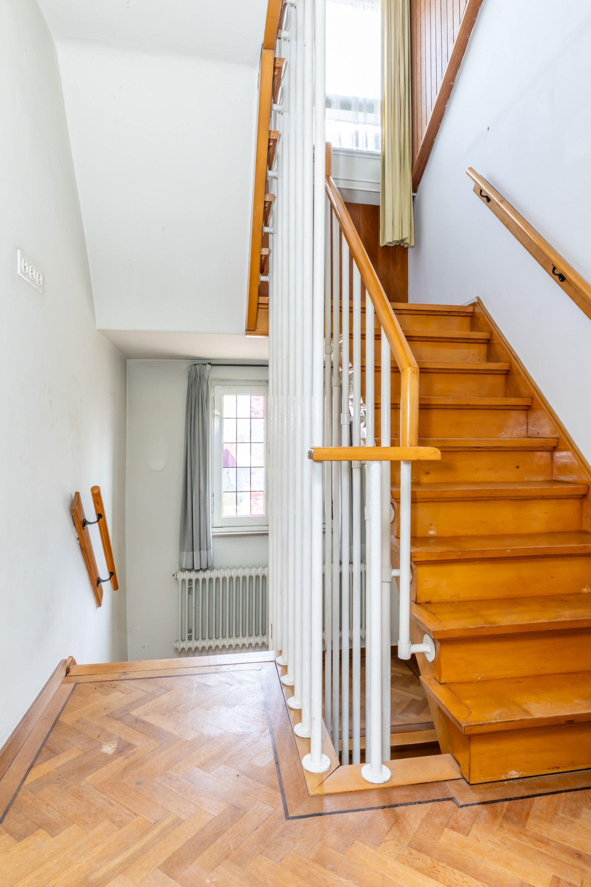 De klassieke bordestrap is een opgang naar de overloop met visgraat parketvloer, en geeft toegang tot de huiskamer, slaapkamers en de badkamer.
