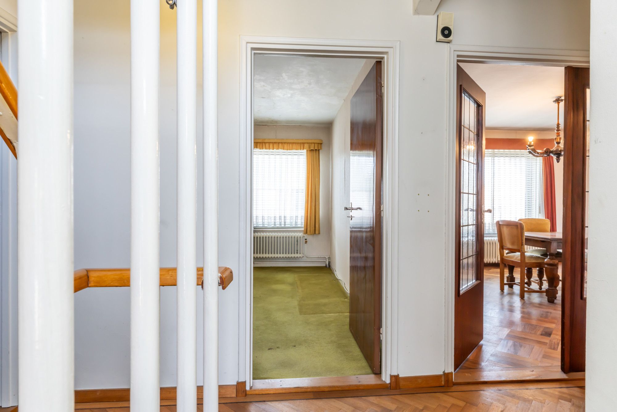 Via de karakteristieke bordestrap, rijk aan authentieke elementen, bereikt u de eerste verdieping. Hier bevindt zich een royale leefruimte die als woonkamer wordt gebruikt, compleet met sfeervolle schouwpartij en een eethoek (voormalige slaapkamer) met dubbele openslaande tuindeuren naar het dakterras.