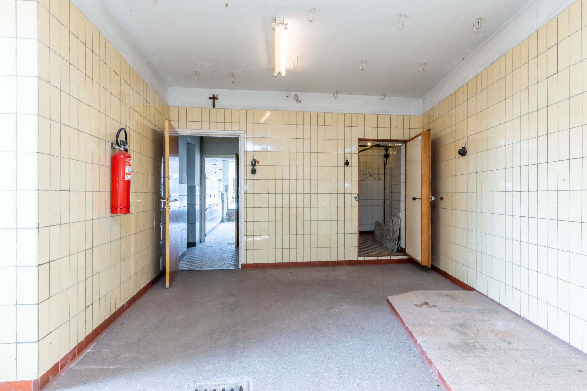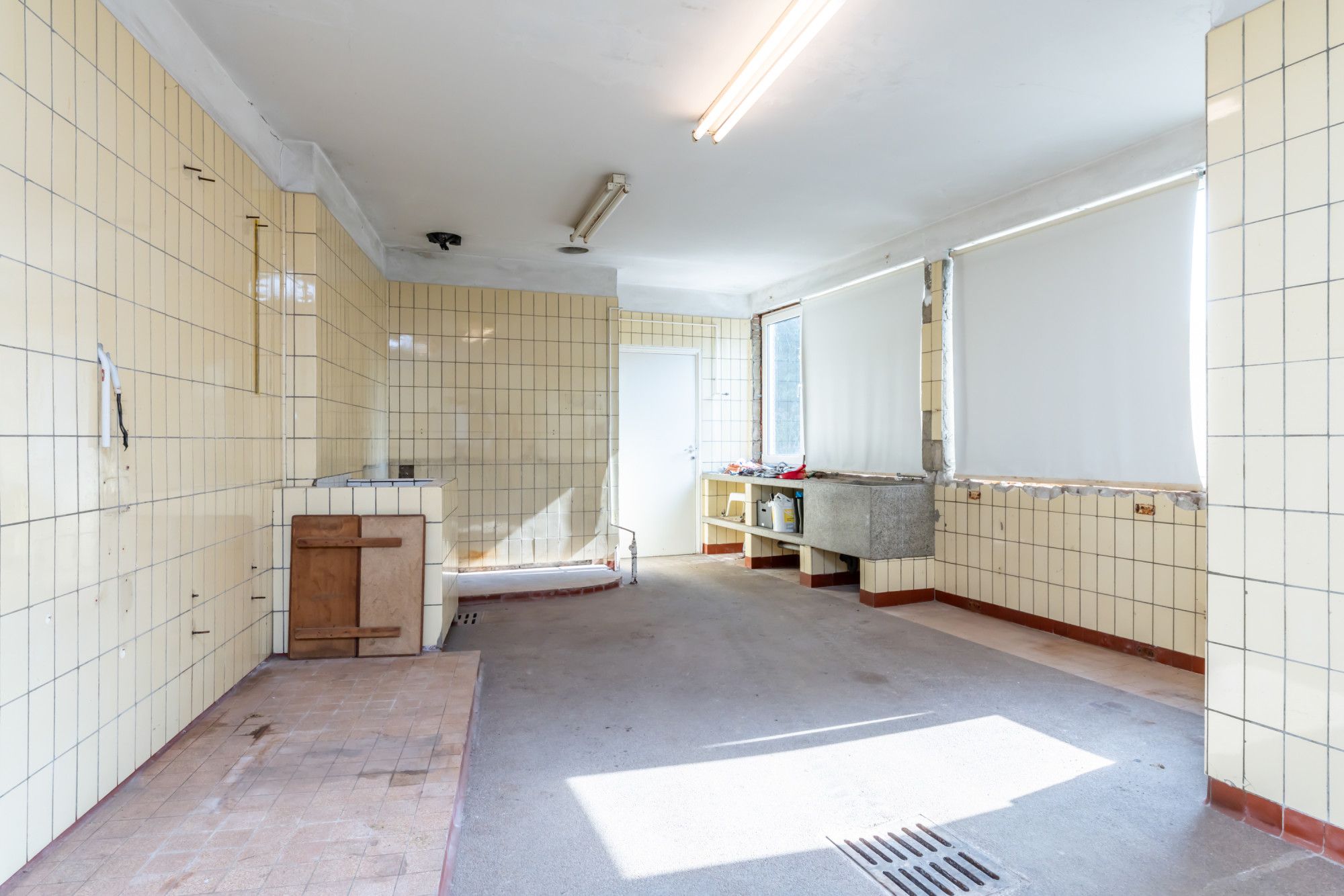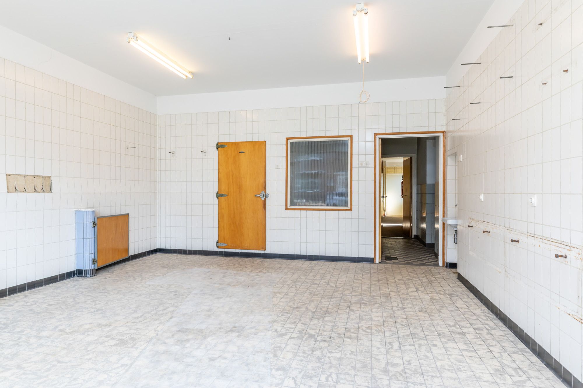 De aansluitende koelcel/berging is ook toegankelijk vanuit de achtergelegen bedrijfsruimte, waar een ruime leefkeuken helemaal tot zijn recht zou komen. Achtergelegen bergruimte met loopdeur naar de achtertuin.