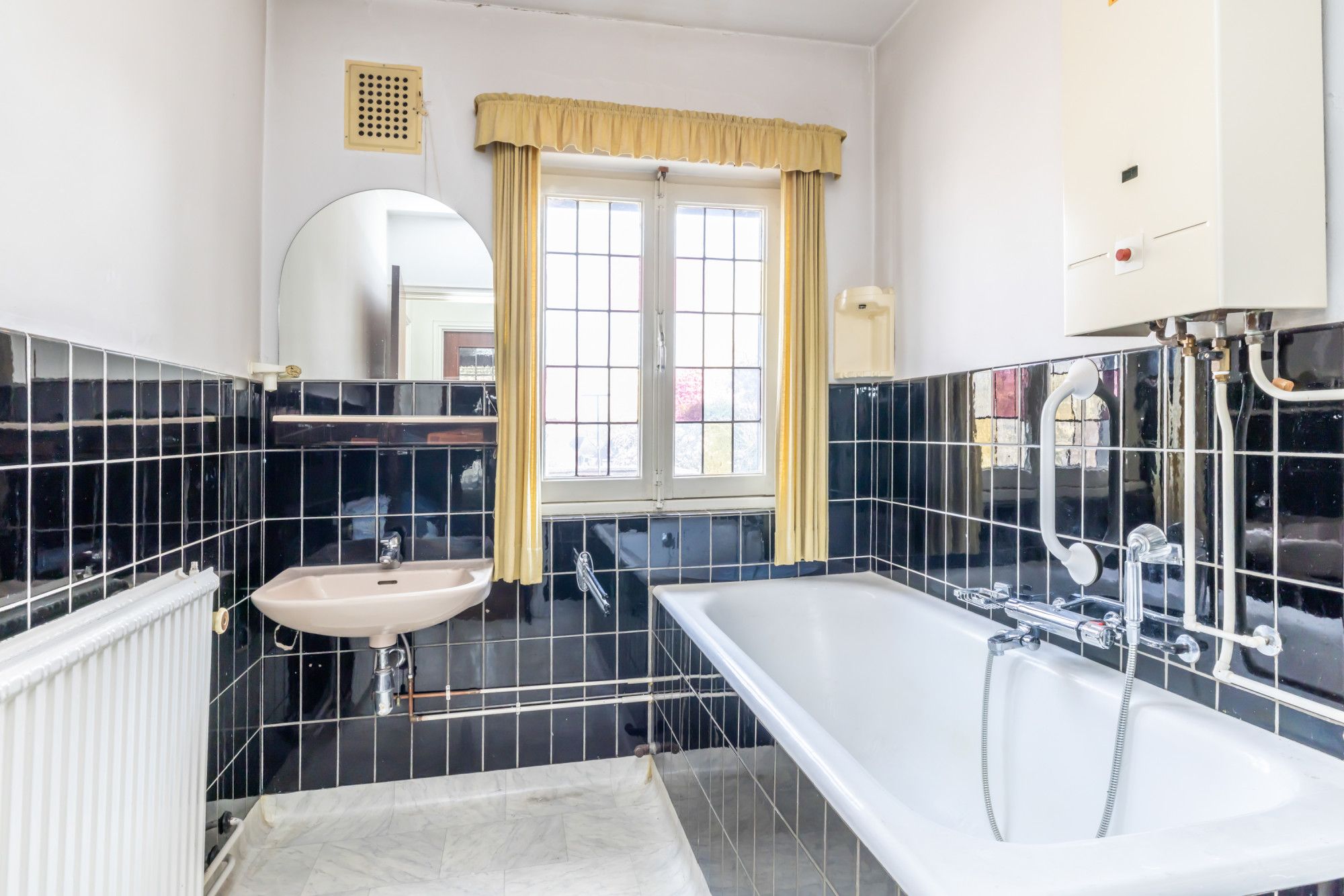Centraal op de verdieping gelegen half-betegelde retro badkamer met vaste wastafel, een ligbad en tweede toilet.