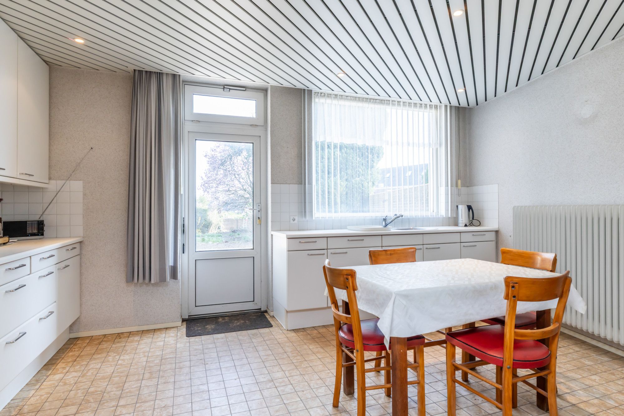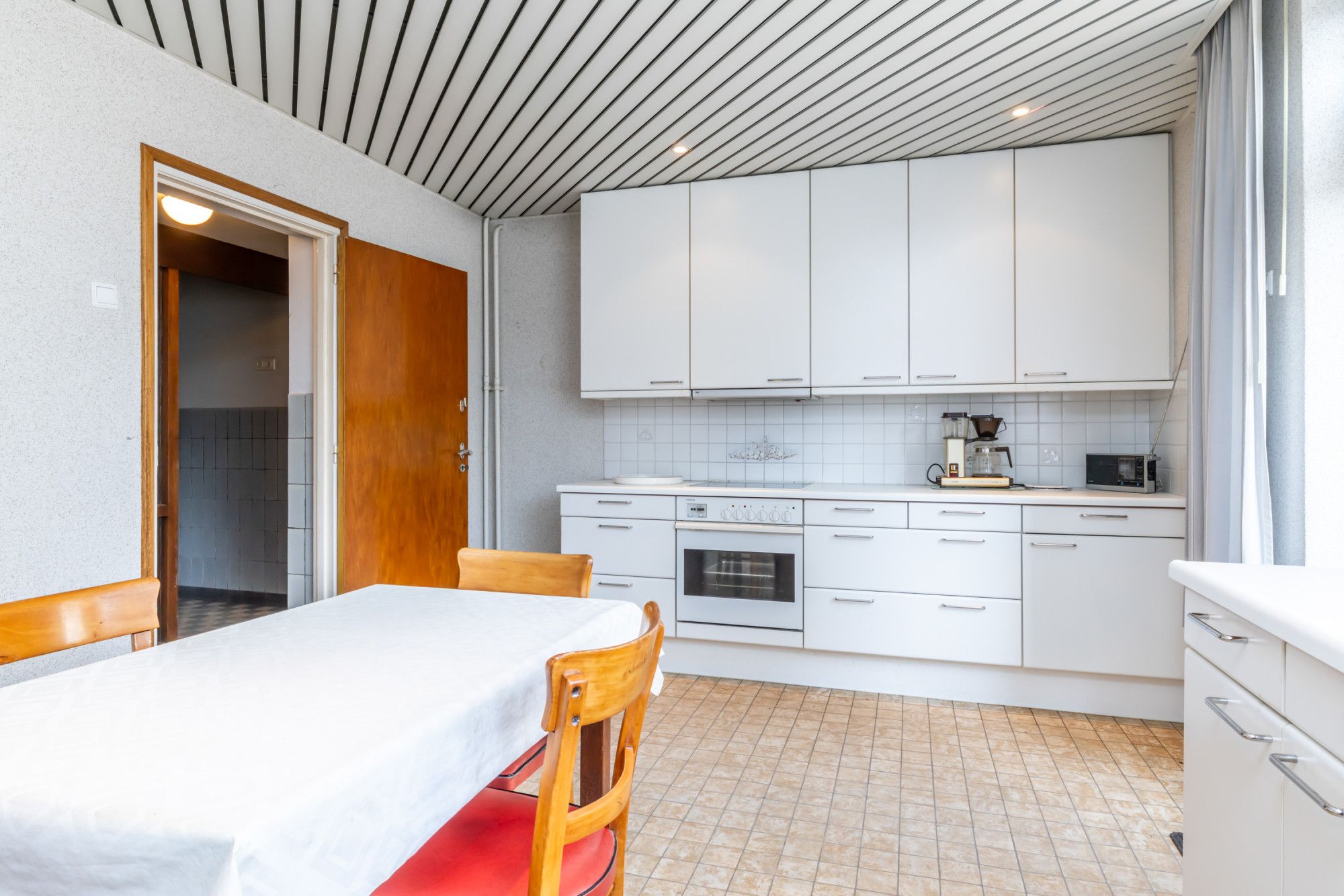 In de gesloten keuken is een inbouwkeuken met apparatuur geplaatst, aangevuld met witgoedaansluitingen en een loopdeur naar het terras en de tuin.