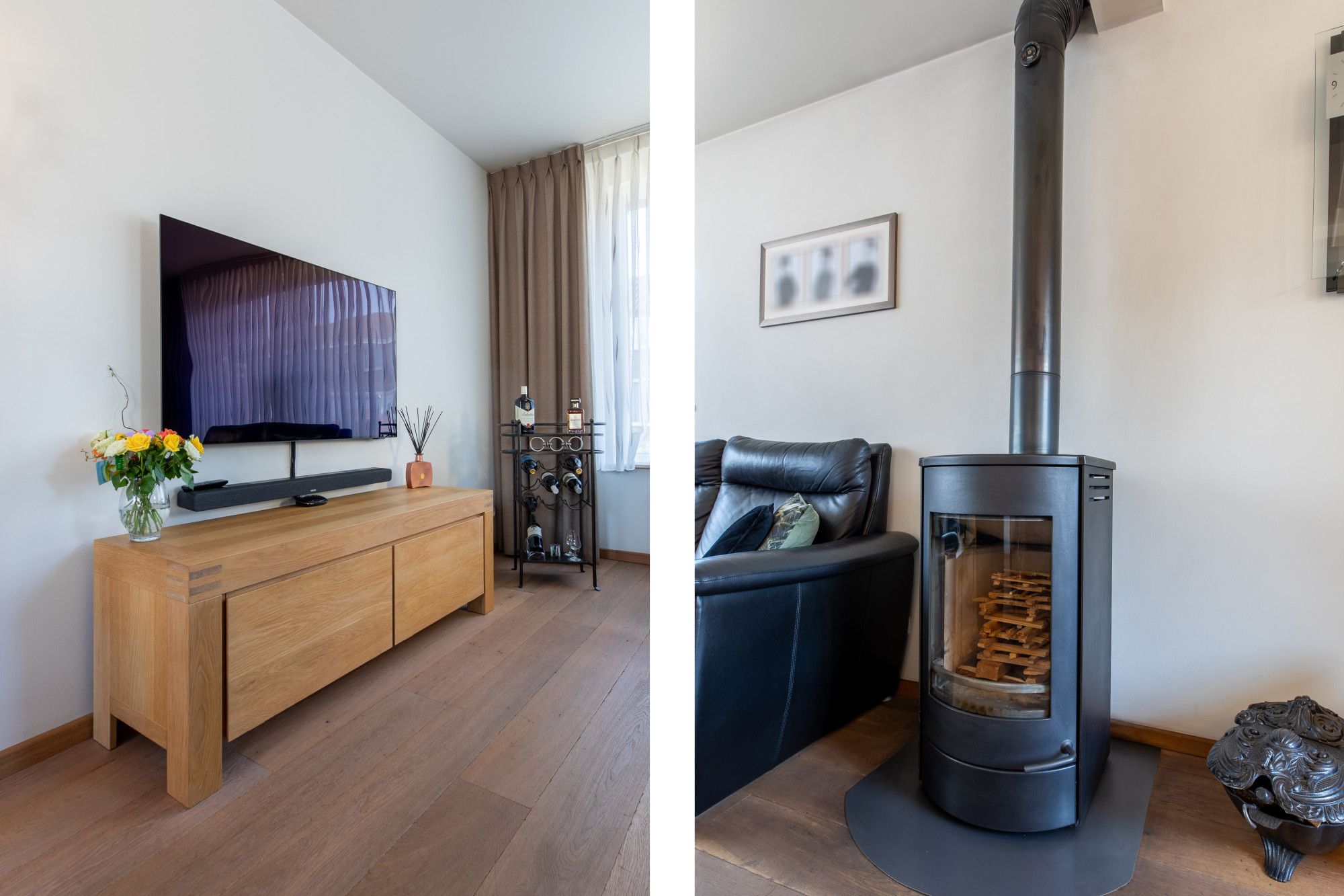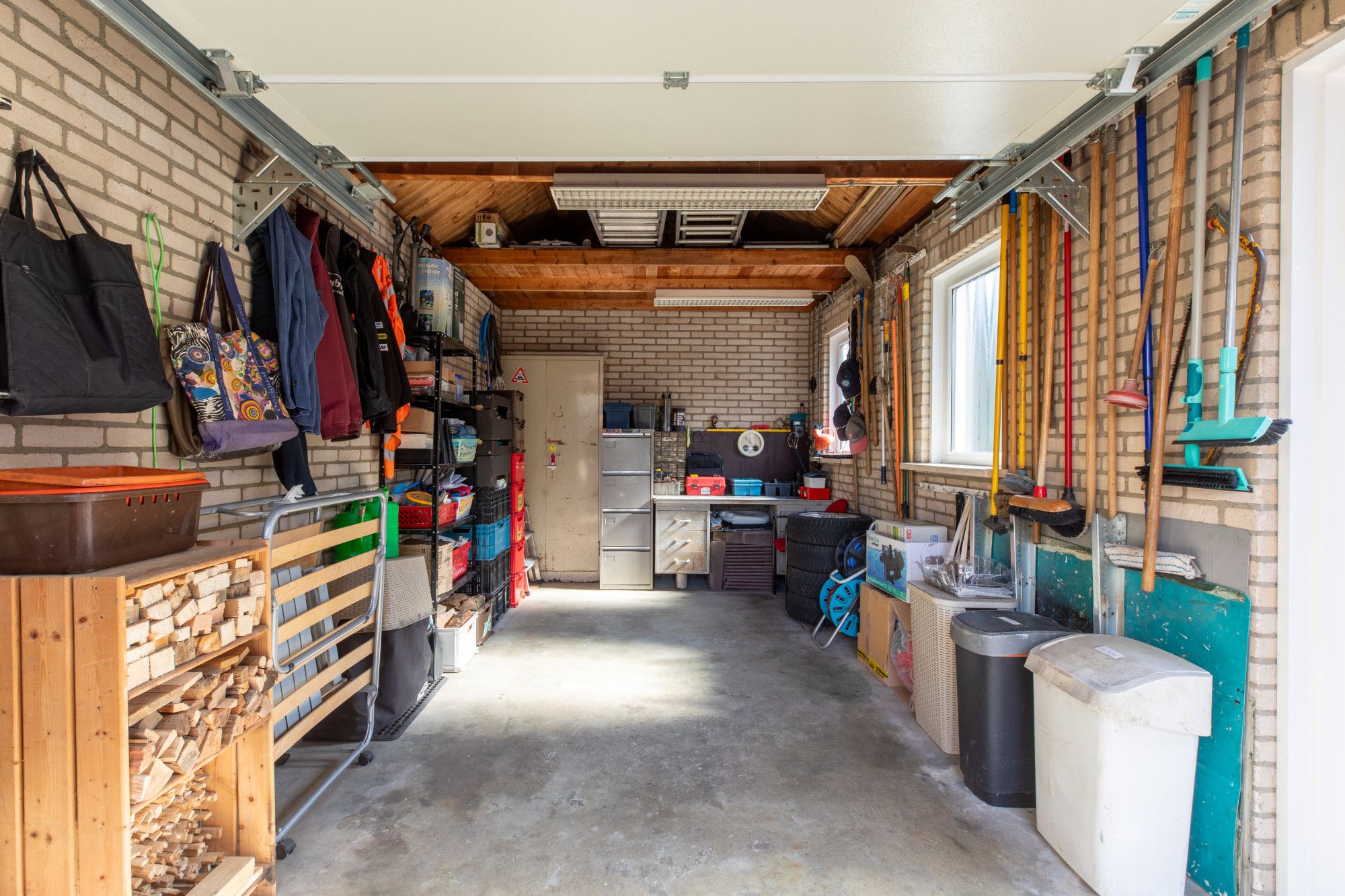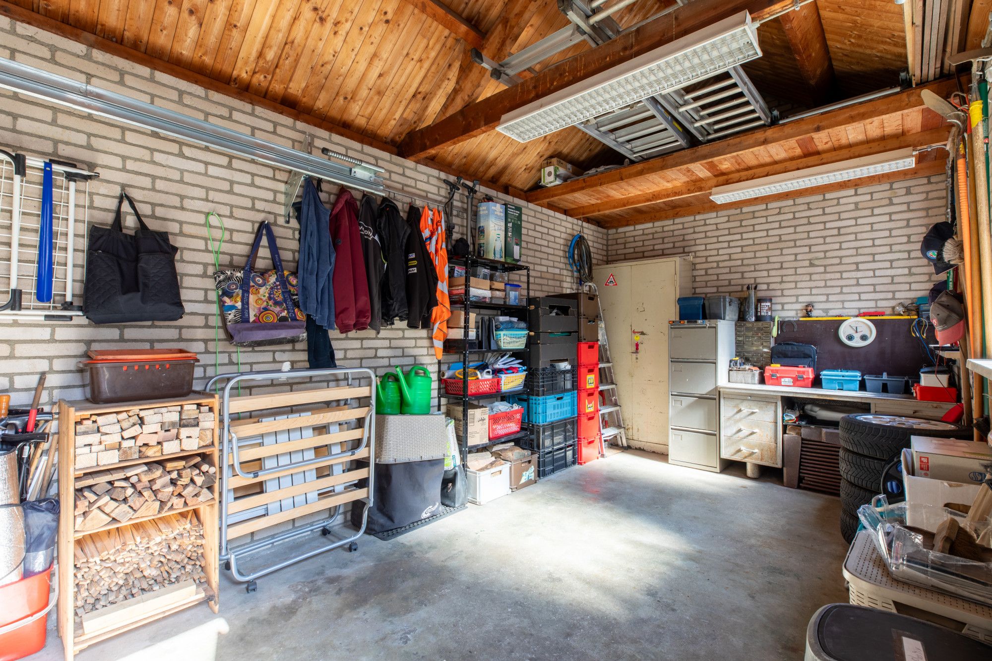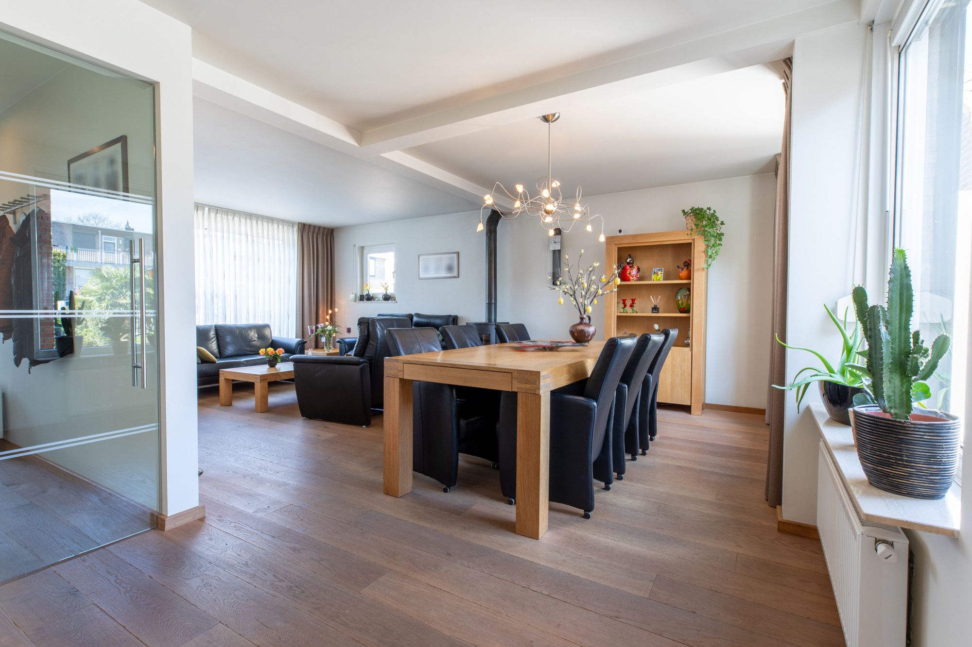 Middels voortuin toegang tot de entree. Hal met doorlopende planken vloer en geheel zwevend toilet met fonteintje. Middels hardglazen deur toegang tot de woonkamer (7.03 x 6.30/4.36 m) eveneens voorzien van eiken planken vloer en sfeervolle houtkachel. Middels hard glazen schuifdeur toegang tot de keuken (4.78 x 2.45 m) voorzien eiken planken vloer en luxe greeploze luxe keuken installatie met diverse onder- en bovenkasten, inbouwapparatuur te weten: 5-pits inductie kookplaat, afzuigkap, vaatwasser, koelkast, magnetron en separate heteluchtoven. Vanuit de keuken toegang tot de riante bij-keuken - hobbyruimte (4.18 x 2.89 m) voorzien van granieten tegelvloer, witgoed aansluiting, wastafel en CV installatie (Remeha). Vanuit de keuken en bijkeuken toegang tot de geheel omsloten bestrate tuin met plantenborders, tuinhuis met zuiveringsinstallatie en verwarmd zwembad (7.50 x 3.50 m en 1.50 m diep). Vanuit de oprit en tuin toegang tot de garage (5.91 x 2.94 m) met sectionaalpoort.
