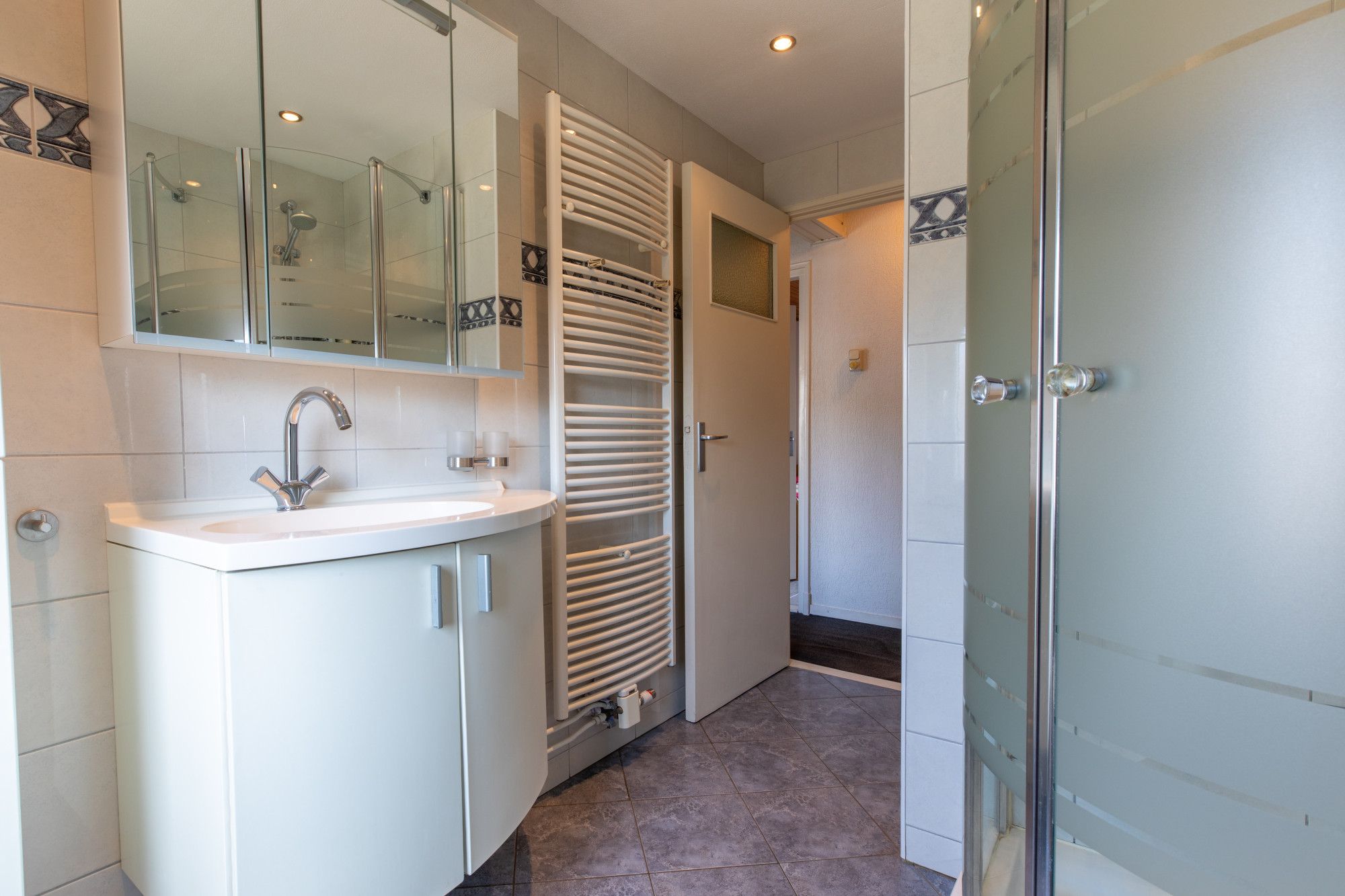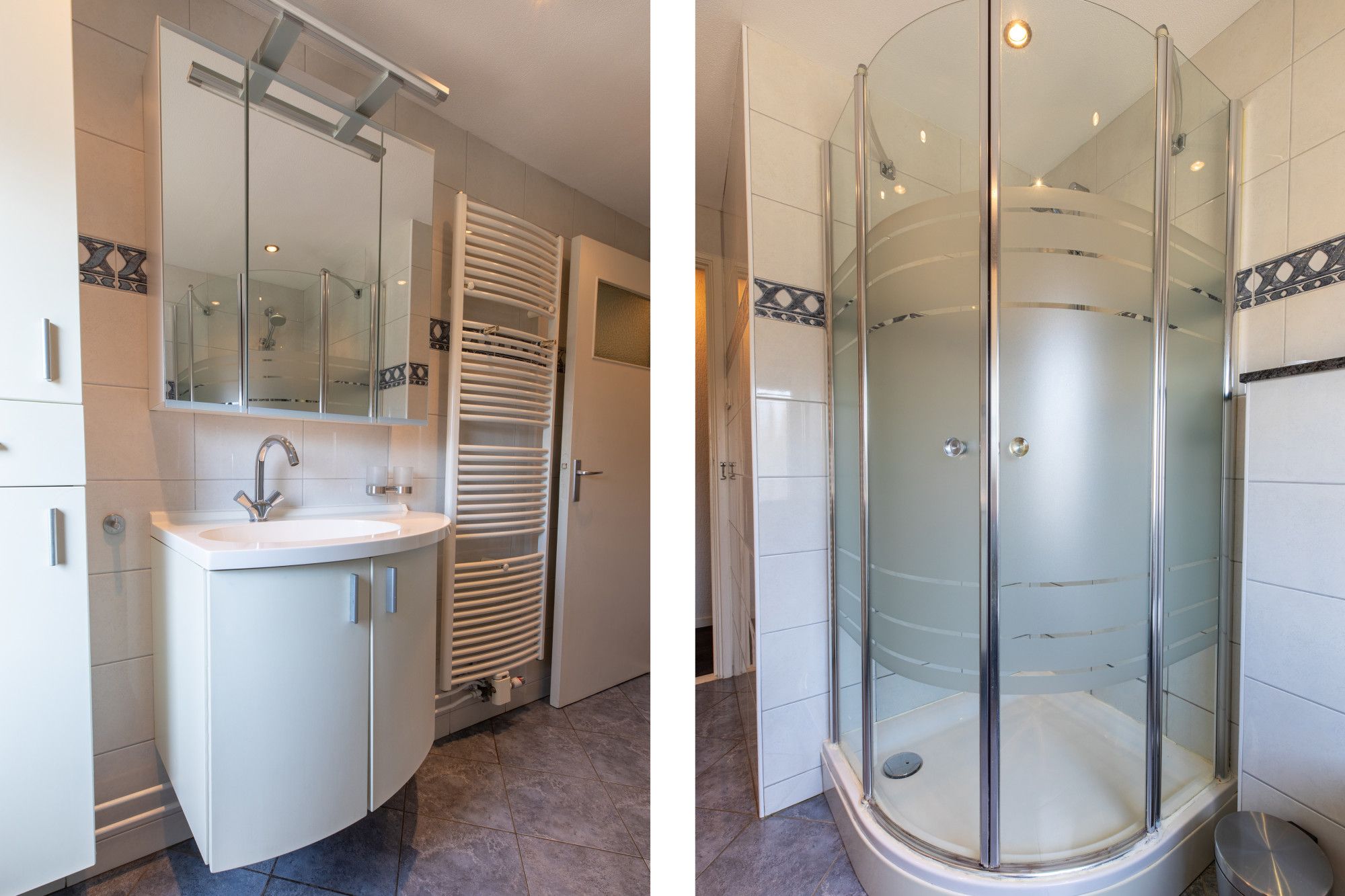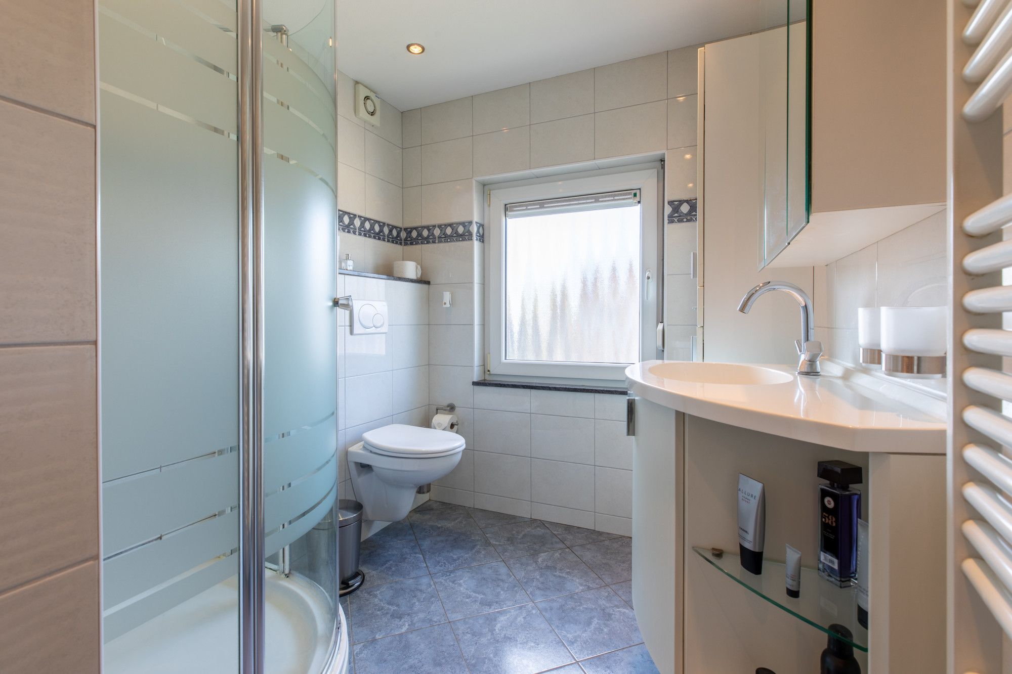 Geheel betegelde badkamer (3.11 x 1.80 m) met hoekdouche, 2e toilet en badmeubel met vaste wastafel.
