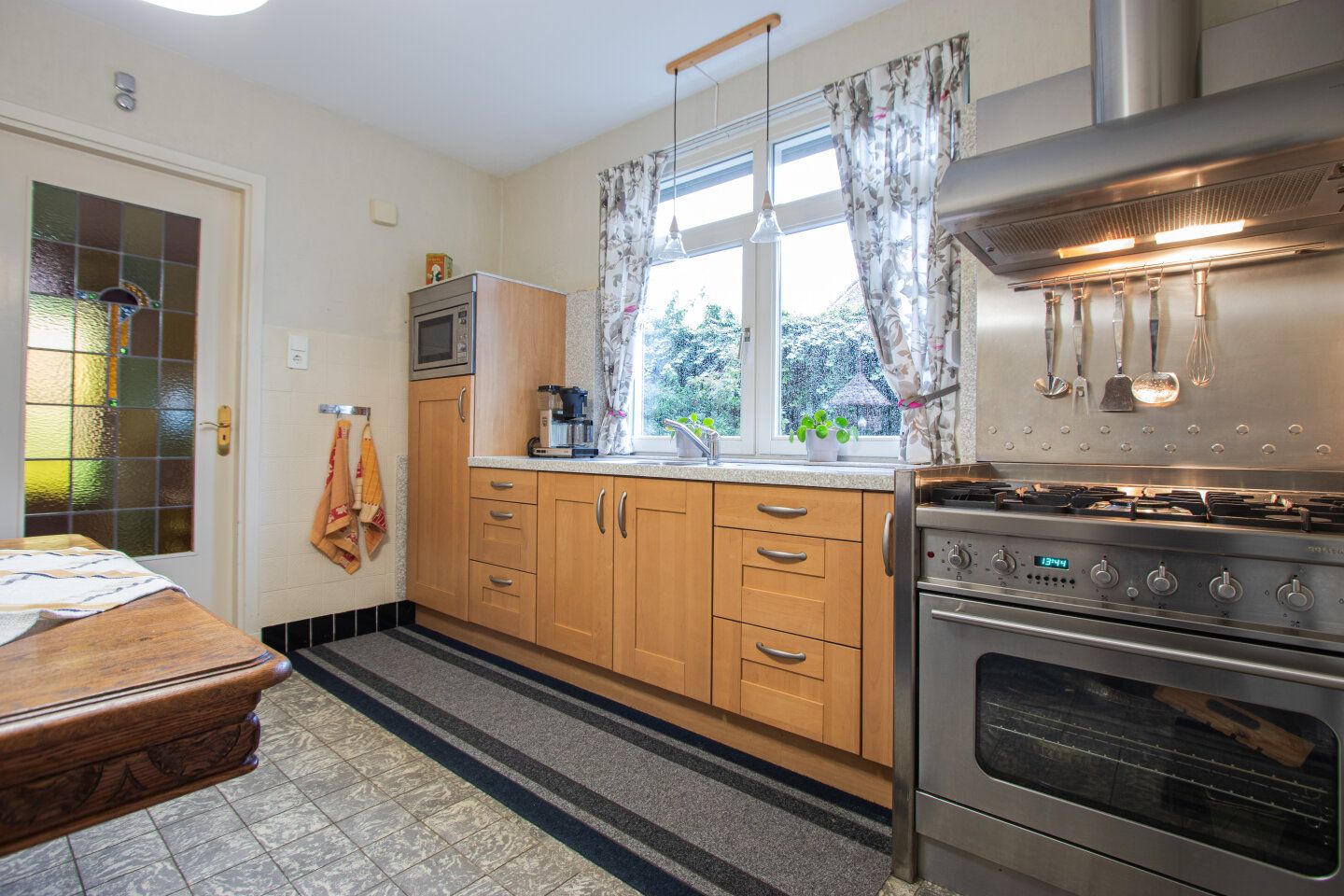 De hal geeft toegang tot de gesloten keuken met diverse inbouwapparatuur. Verder de woning in, kom je uit in de bijkeuken. Naast een extra keukenblok en de witgoedaansluiting, bevindt zich hier ook het gastentoilet met fonteintje.