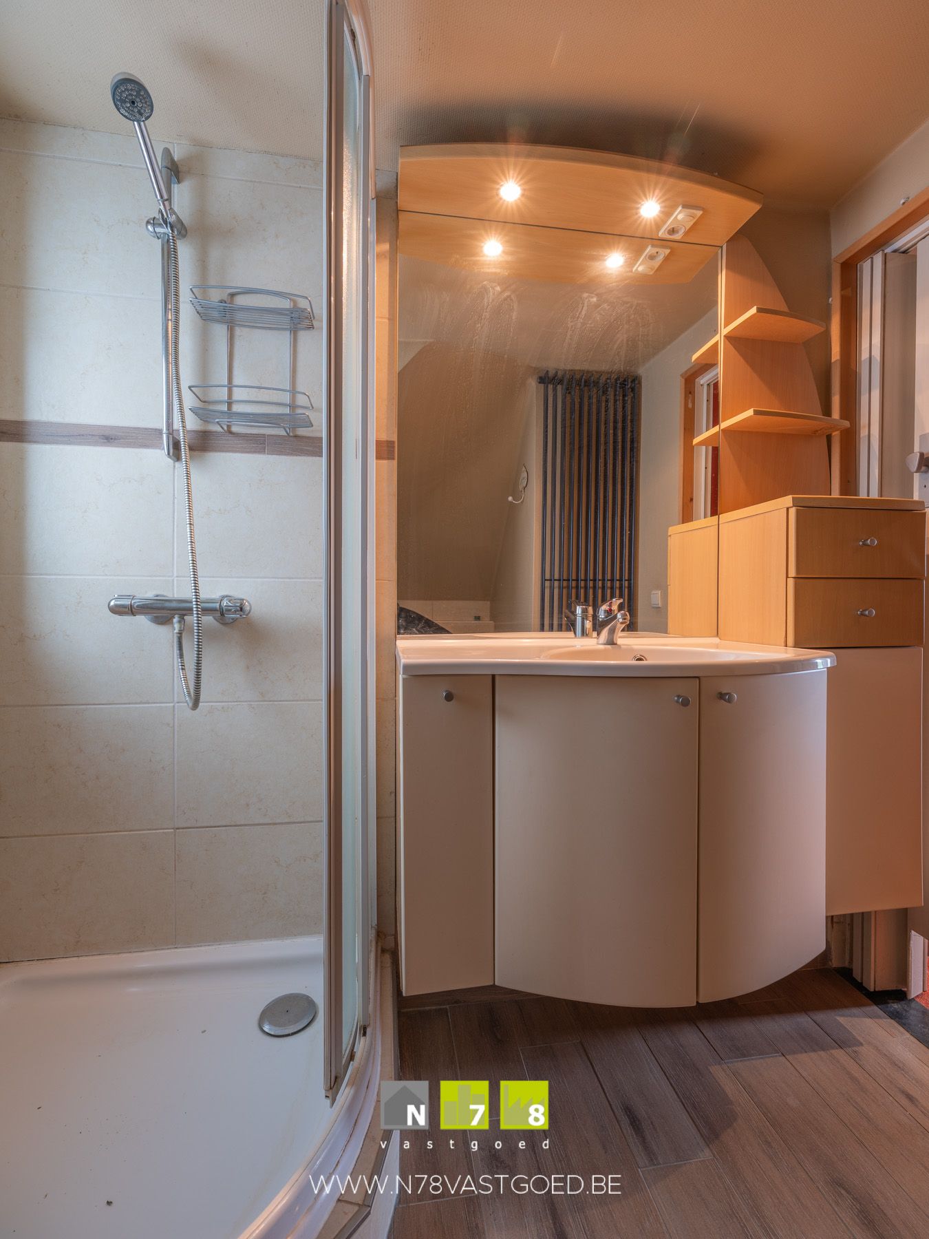 - Badkamer (2,08m x 1,71m = 3,56 m²): ingericht badmeubel met enkele lavabo, onderkasten, kolomkasten, douche, toilet, laminaat.
