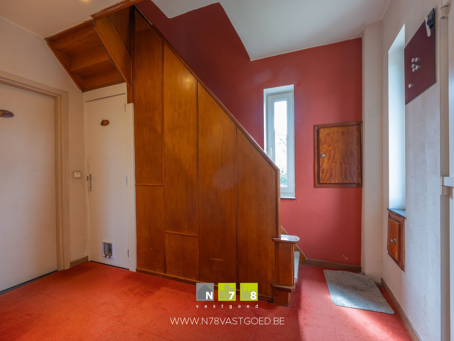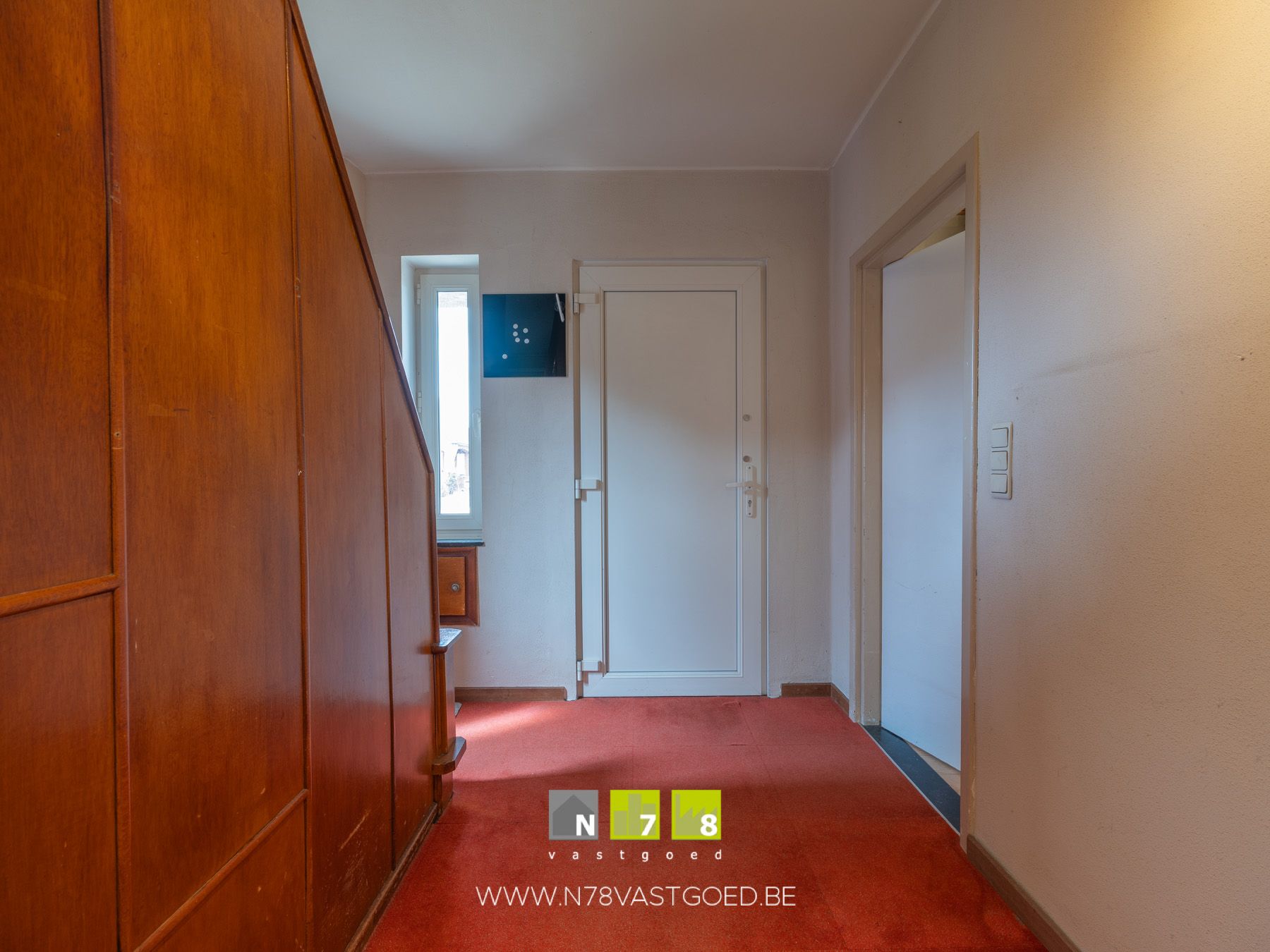 - Inkomhal (2,48m x 3,29m = 8,16 m²): trap naar de eerste verdieping, tapijt.