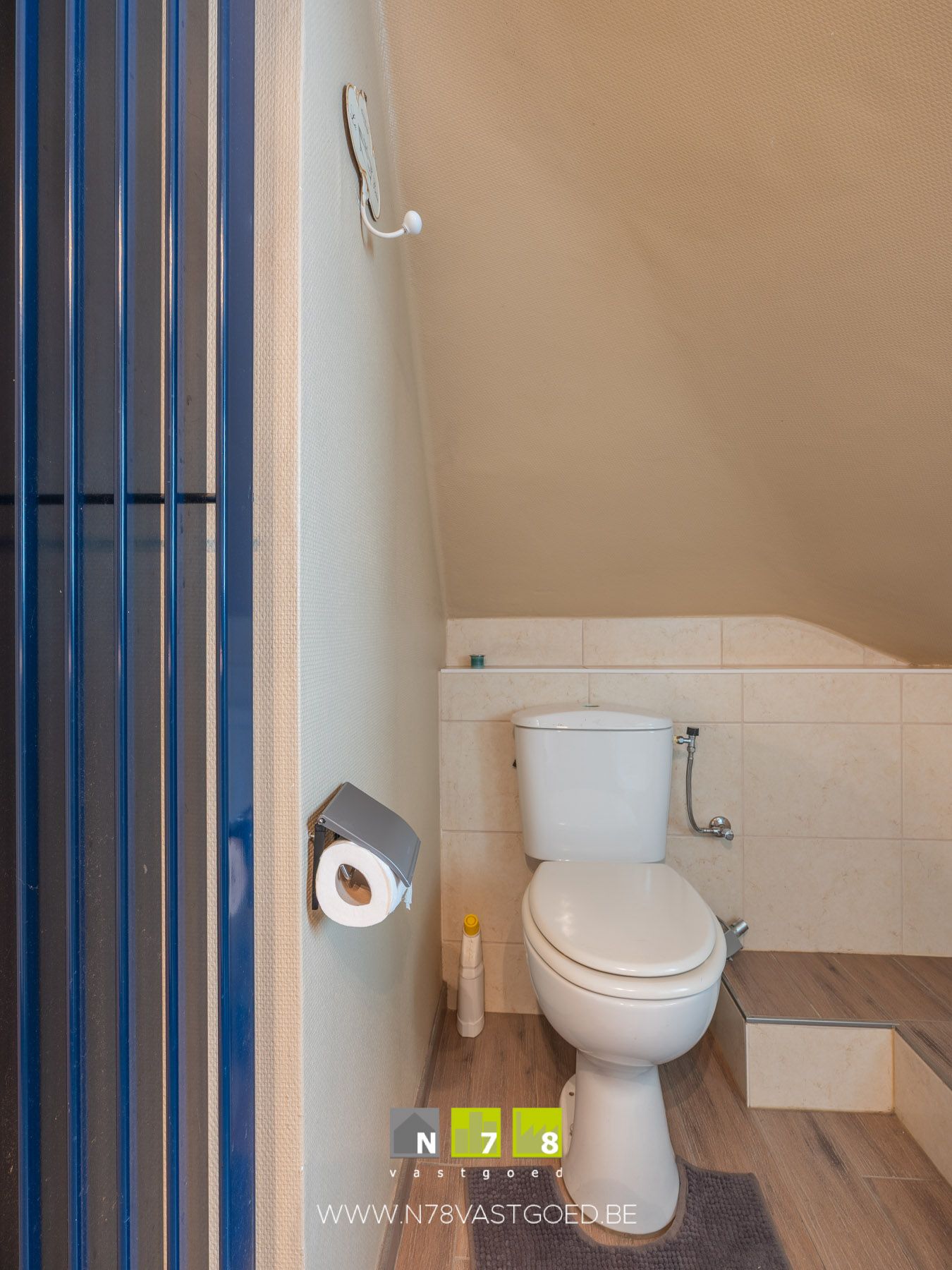 - Toilet (1,07m x 1,19m = 1,27 m²): zittoilet, deels betegelde achterwand, tegelvloer.