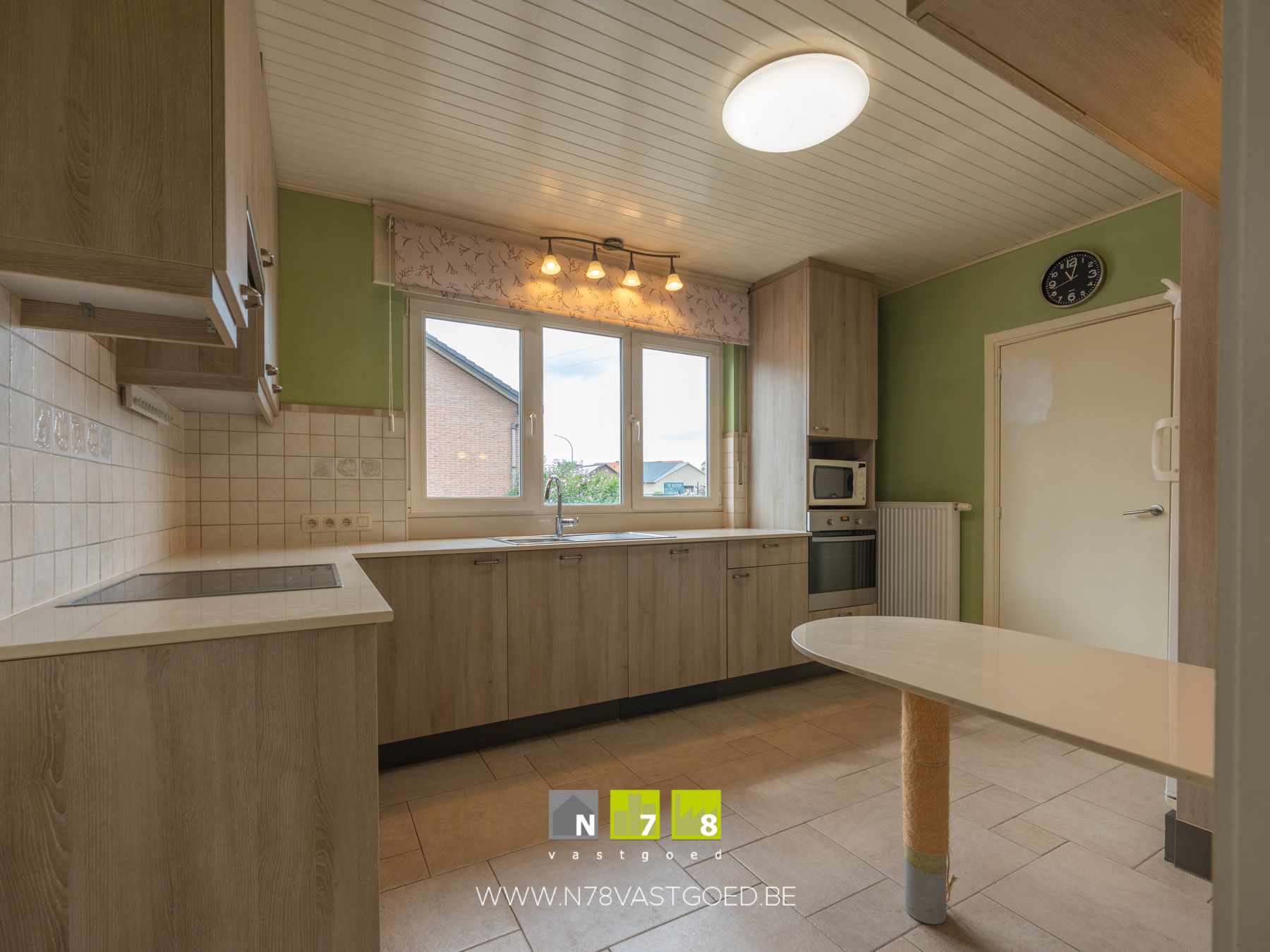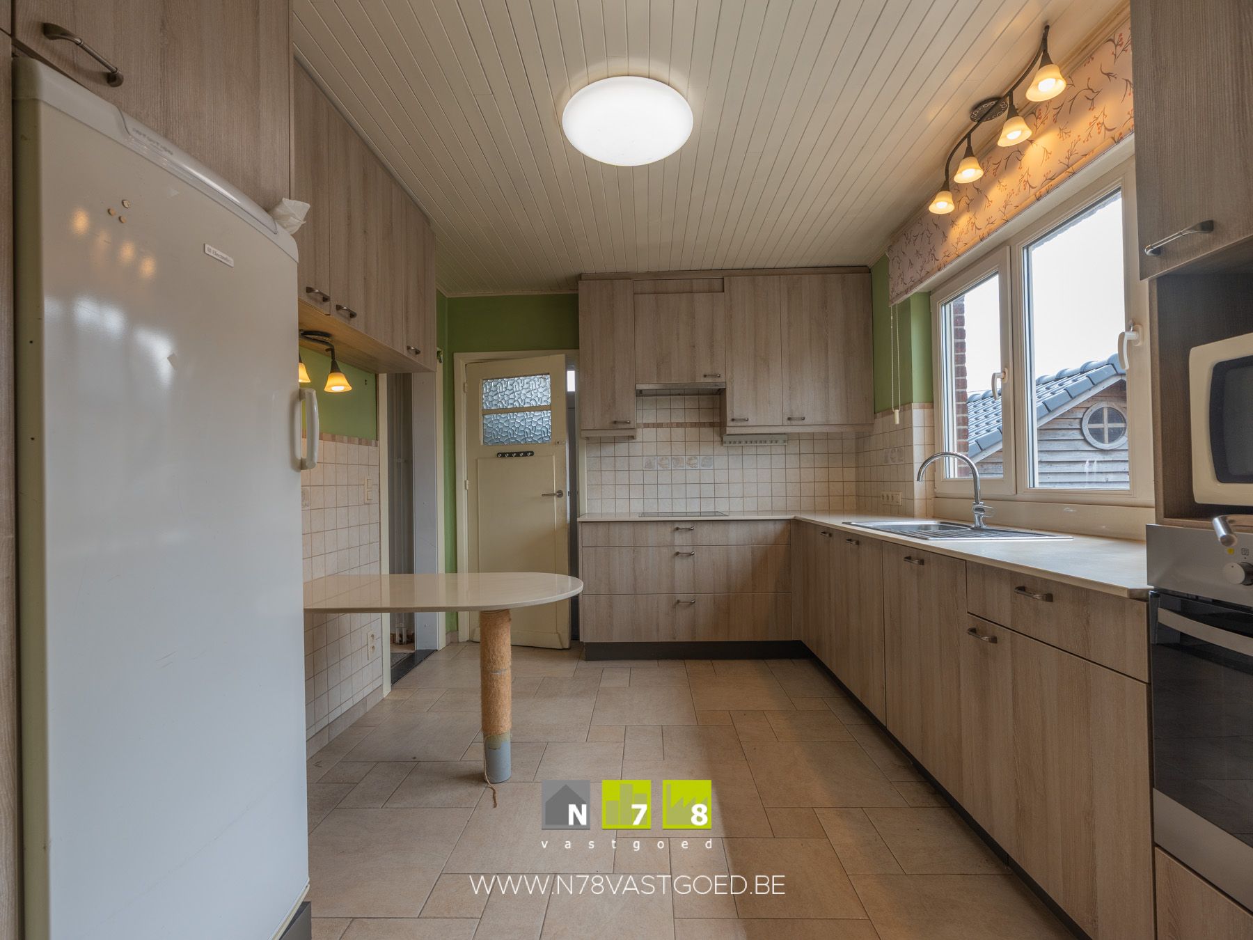 - Keuken (3,96m x 3,05m = 12,08 m²): geïnstalleerde keuken met onder- en bovenkasten, lades, keramische kookplaat, dampkap, oven, microgolfoven, koelkast, vaatwasser, betegelde achterwand, tegelvloer.
