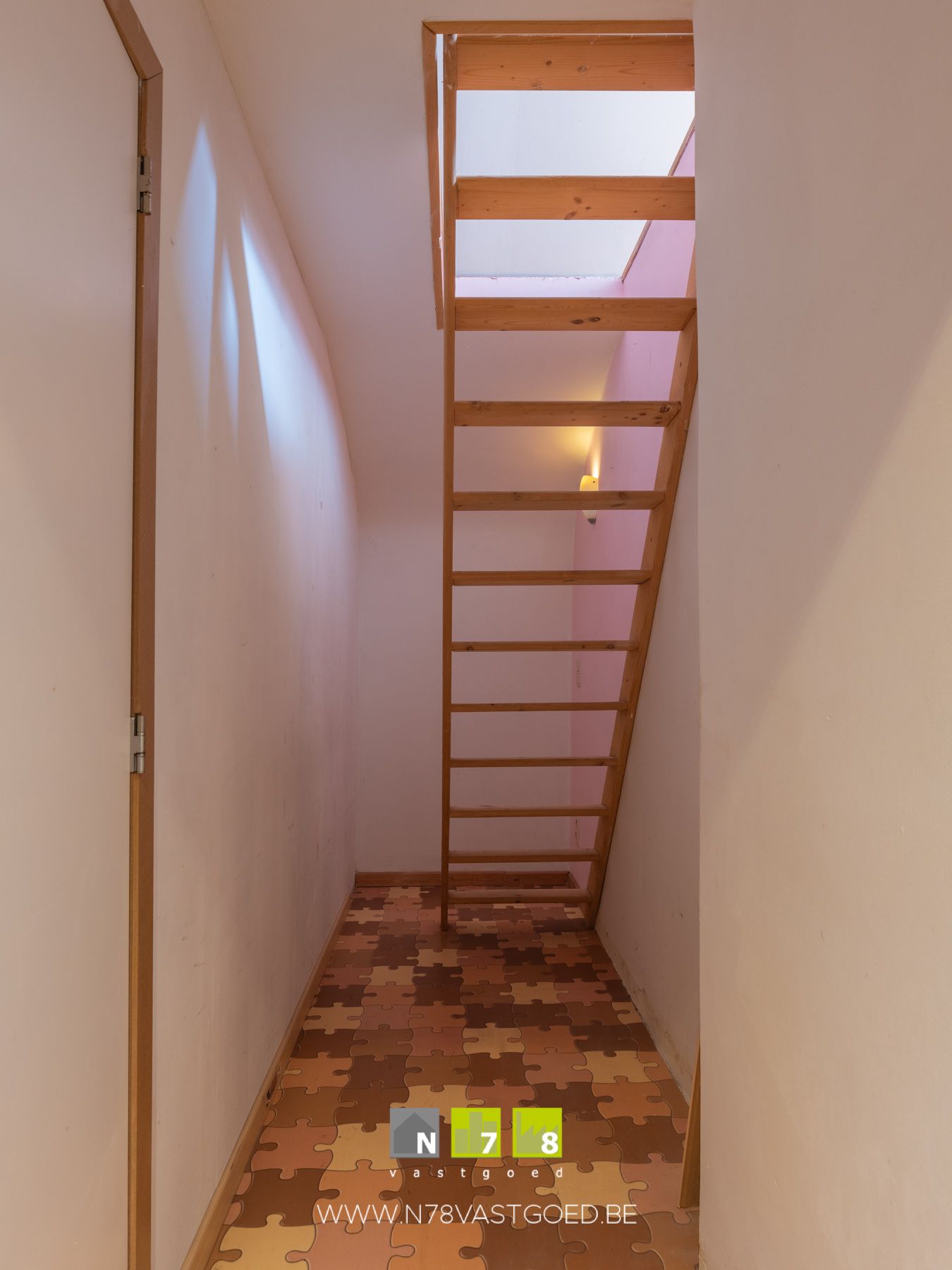 - Overloop ((1,10m x 3,77m) + (1,00m x 1,00m) + (1,05m x 2,66m) = 6,85 m²): trap naar het gelijkvloers, tapijt.