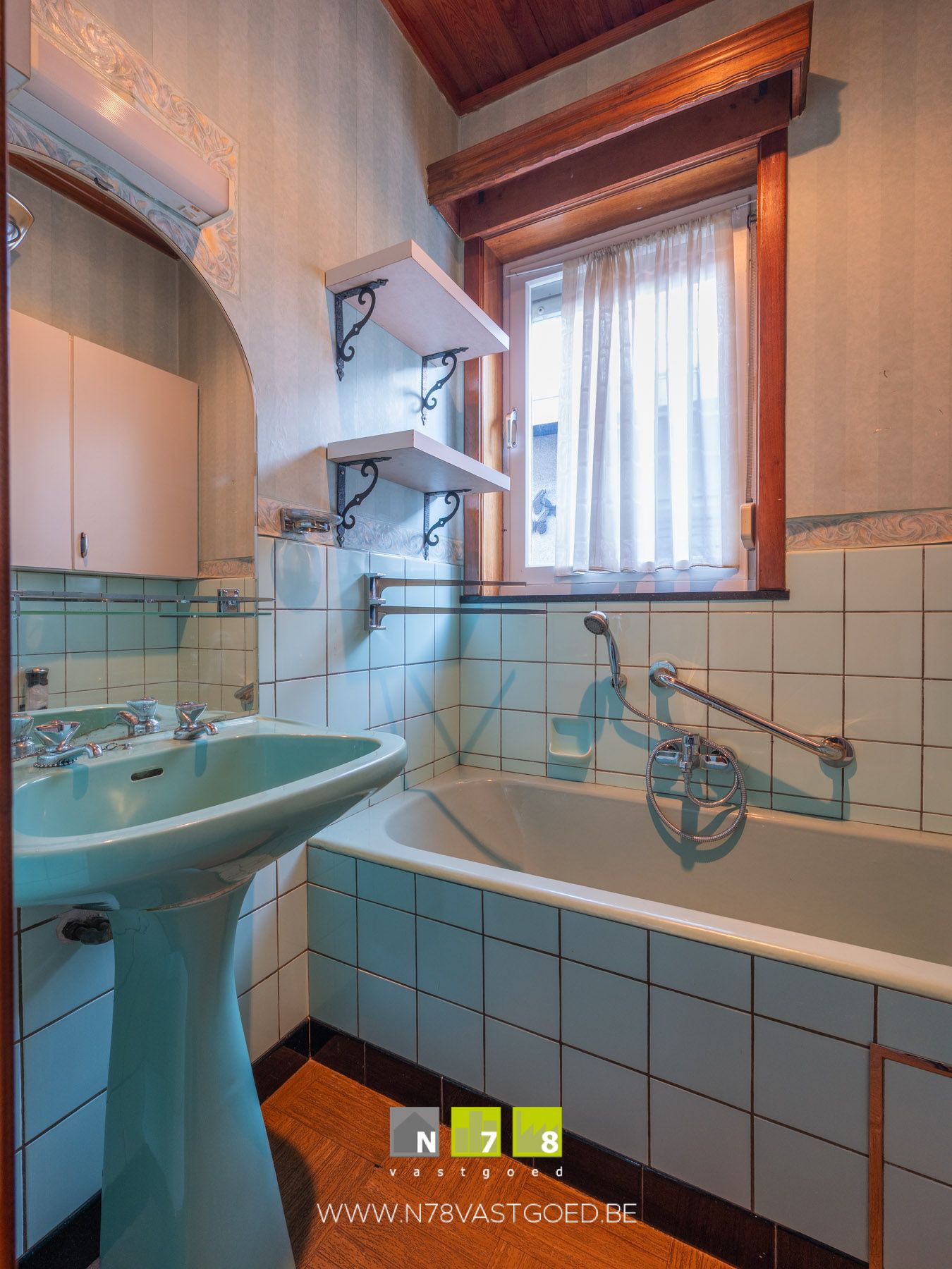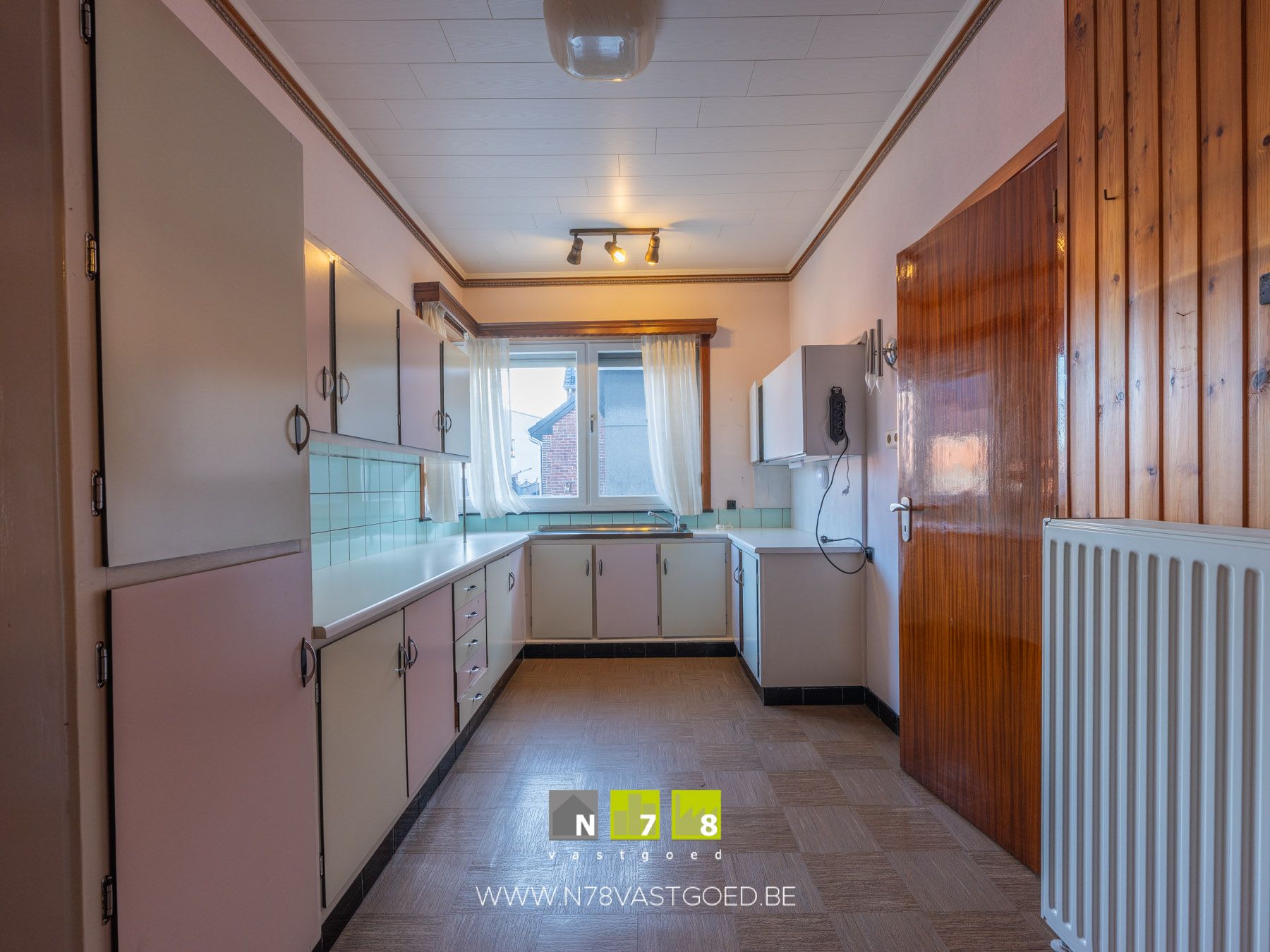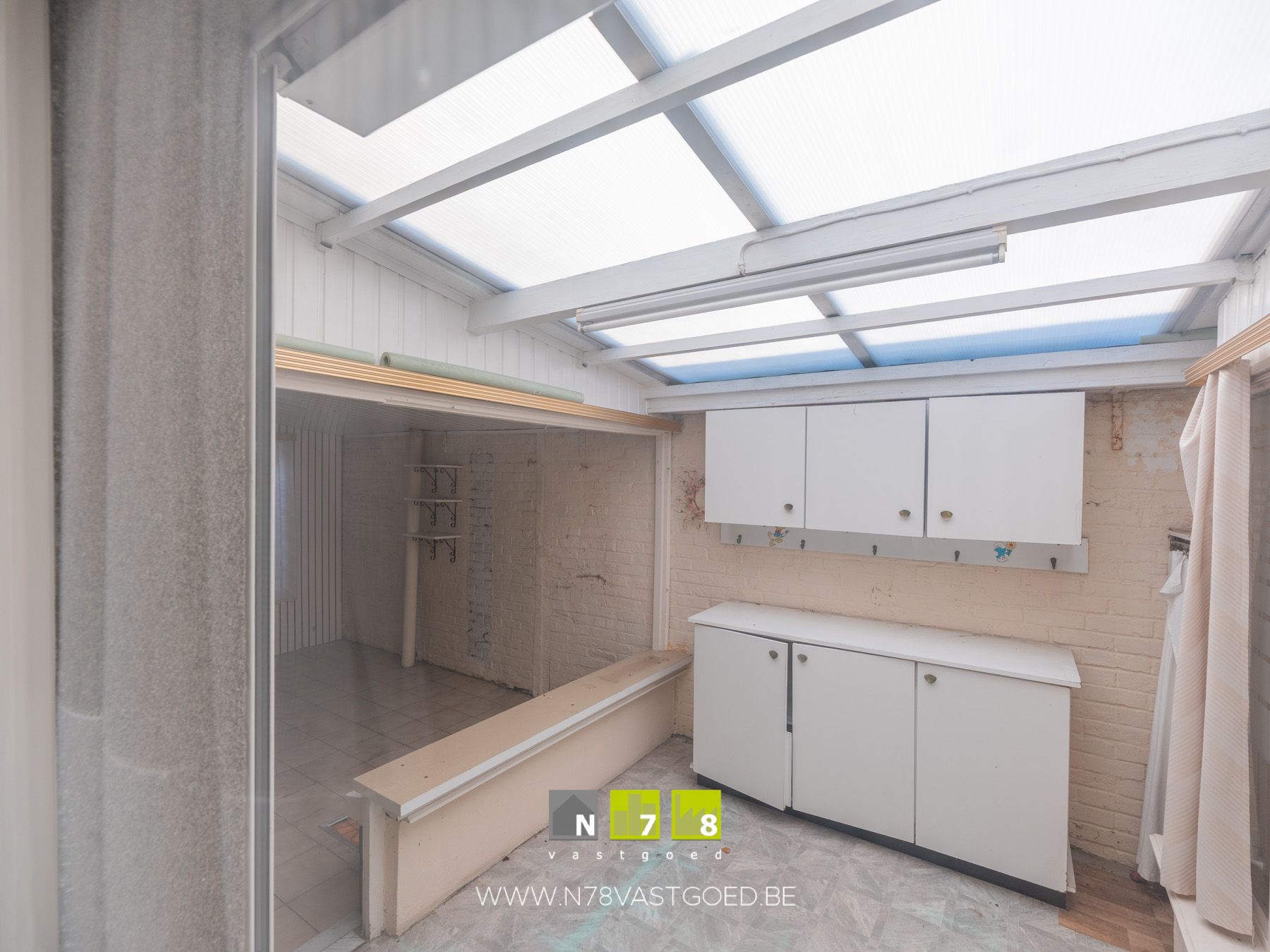 - Berging (7,86m²): kasten, dampkap, doorgang naar veranda, deels wandbetegeling, linoleumvloer.