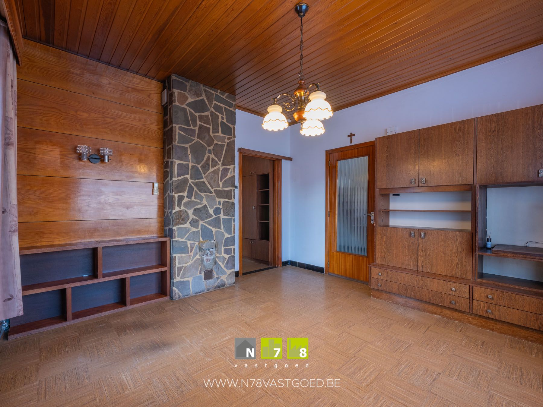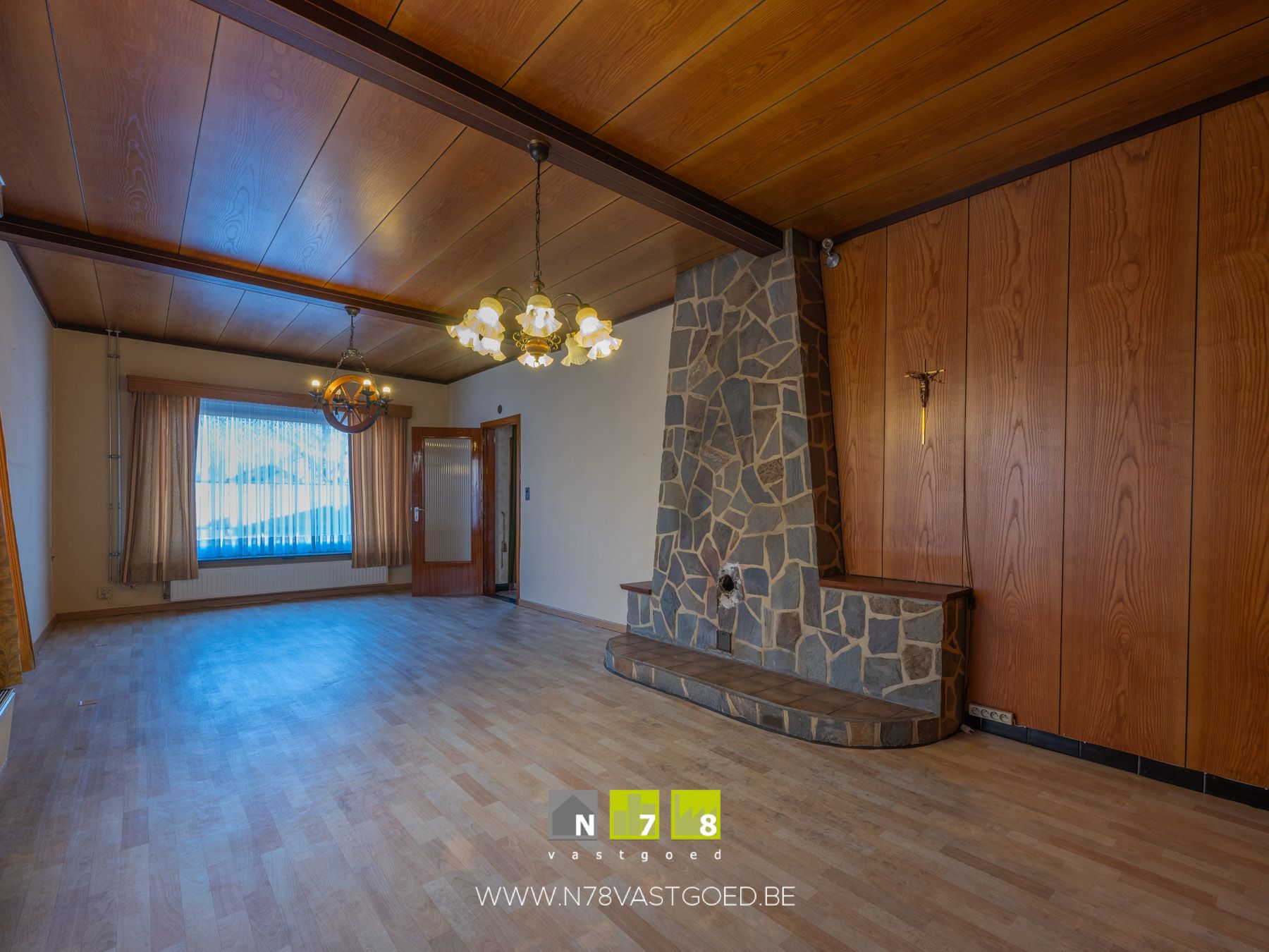 - Woonkamer (30,63m²): stenen schouwwand, linoleumvloer.