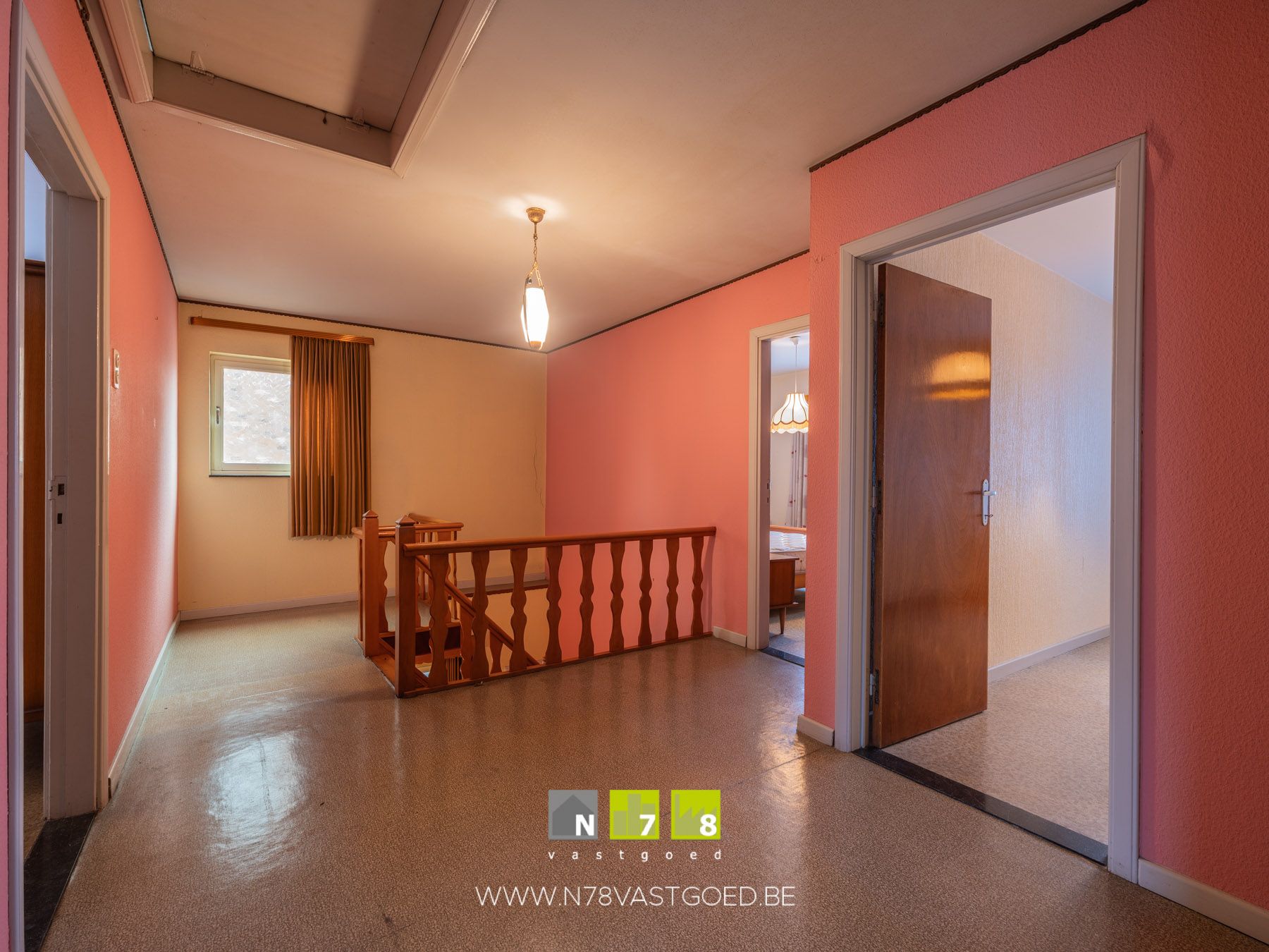 - Overloop (3,13m x 6,20m = 19,41m²): trap naar het gelijkvloers, luik naar de zolder, novilon.