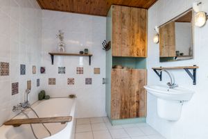 Middels de imposante trappartij is ook de tweede verdieping bereikbaar. Deze verdieping is de ware verrassing van deze woning! Het met zorg gerestaureerde dak is geïsoleerd met vlas, waarbij de oude eiken spanten in het zicht zijn gelaten en het dakbeschot is afgewerkt met fraaie populierenhouten planken. De hoge nok zorgt voor een ruimtelijk gevoel. Deze verdieping is op speelse wijze opgedeeld in twee ruimtes, momenteel in gebruik als vijfde slaapkamer en hobbyruimte. In de dakschuinte is praktische bergruimte gerealiseerd.
