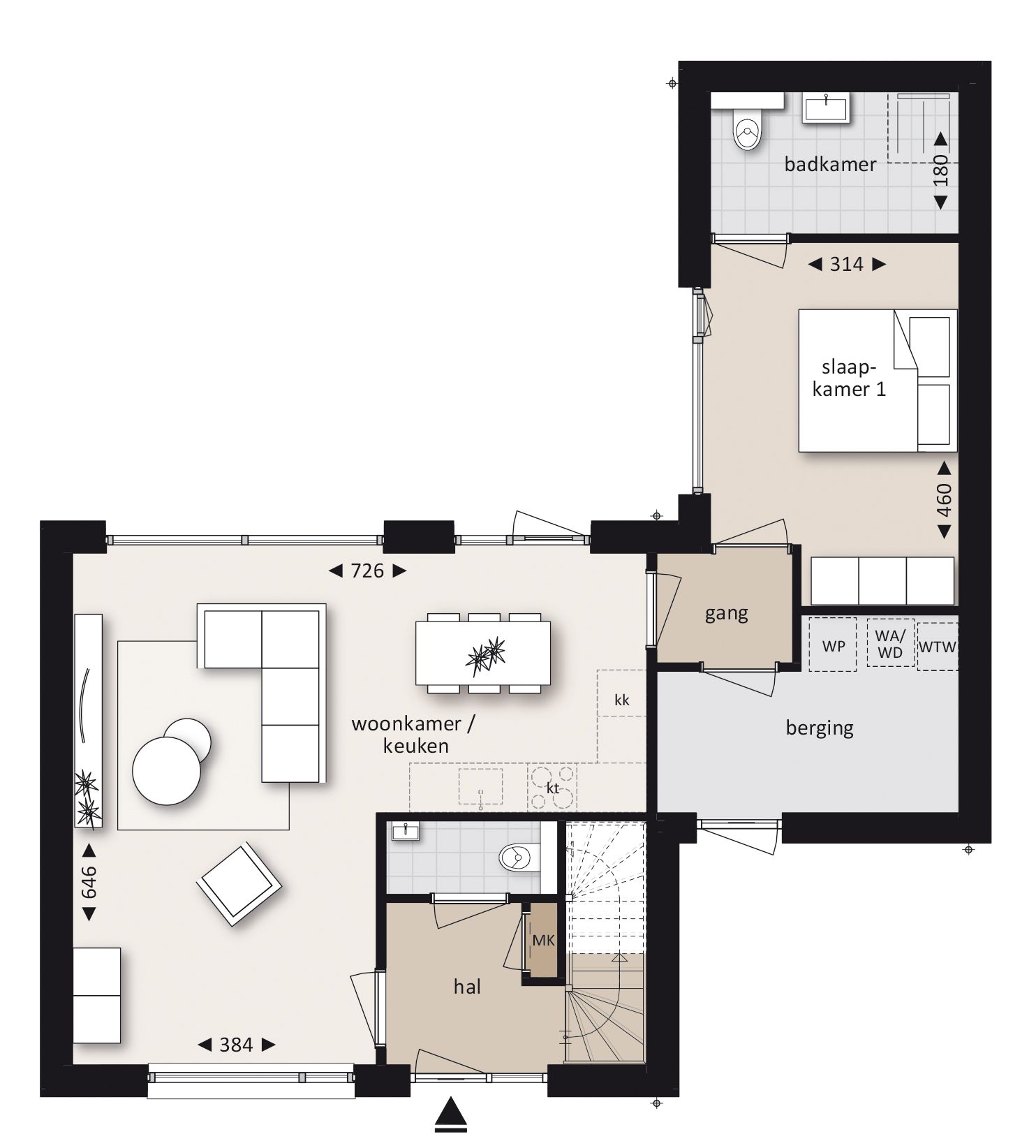 De riante leefruimte bestaat uit een zitgedeelte en een eetgedeelte met open keuken. Grote raampartijen zorgen voor veel daglicht en een directe verbinding met de aangrenzende tuin, waardoor binnen en buiten naadloos op elkaar aansluiten. Via de woonkamer heeft u toegang tot de hoofdslaapkamer op de begane grond. Deze heeft de beschikking over een eigen badkamer met onder meer een inloopdouche, een wastafel en tweede toilet. De badkamer is betegeld tot plafondhoogte en voorzien van sanitair van Villeroy & Boch. De slaapkamer heeft veel tuincontact door de grote raampartij. De praktische berging is bereikbaar vanuit buiten en via de hal van de woning en biedt ruimte aan technische installaties, waaronder de energiezuinige warmtepomp, het stallen van uw fiets en extra opslag.