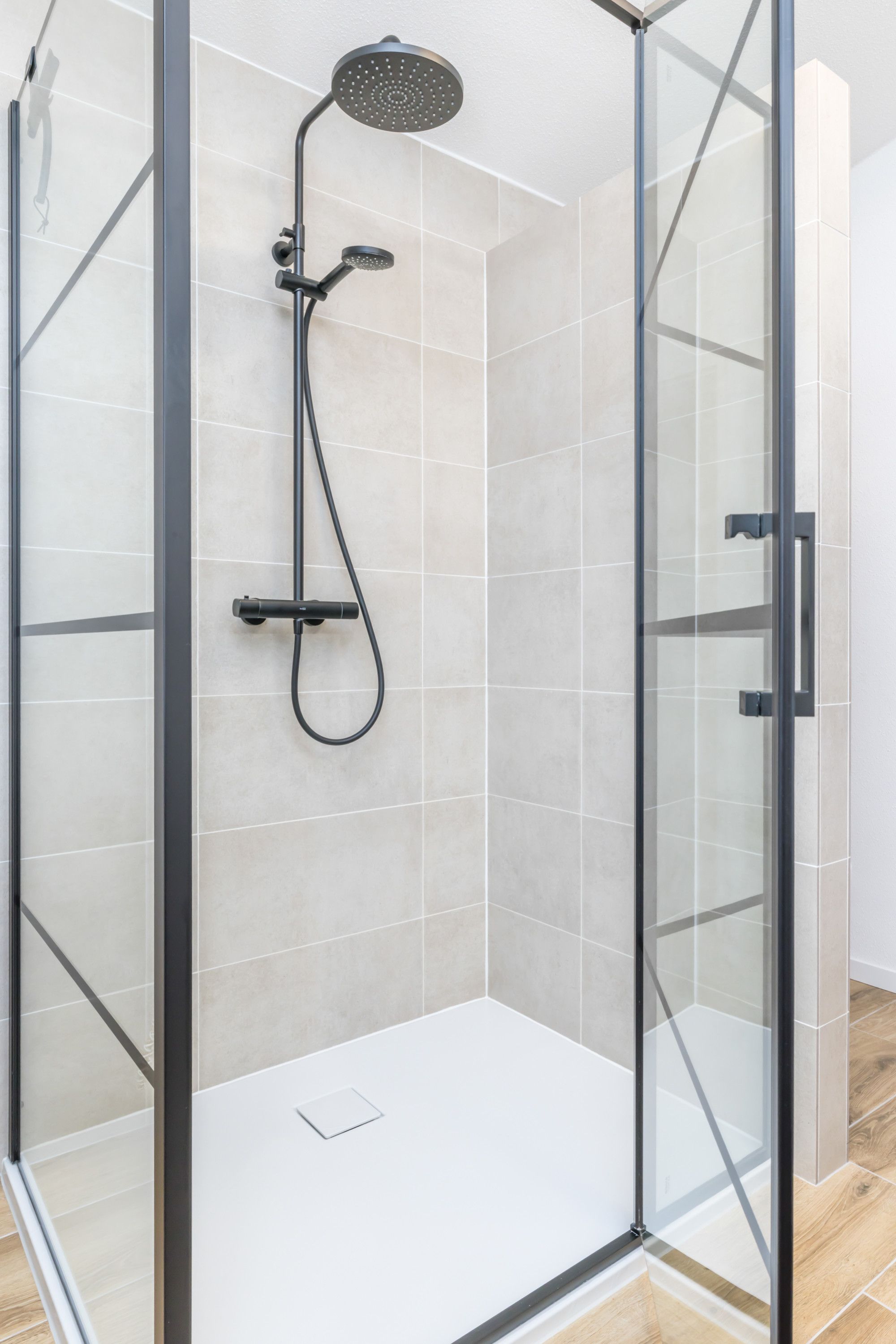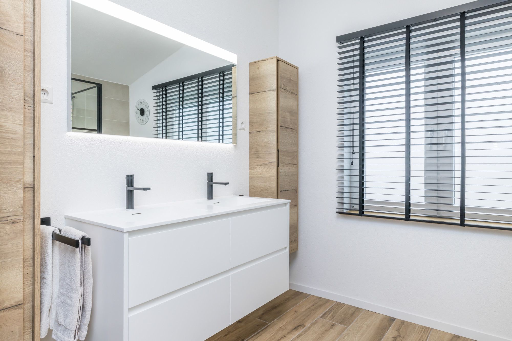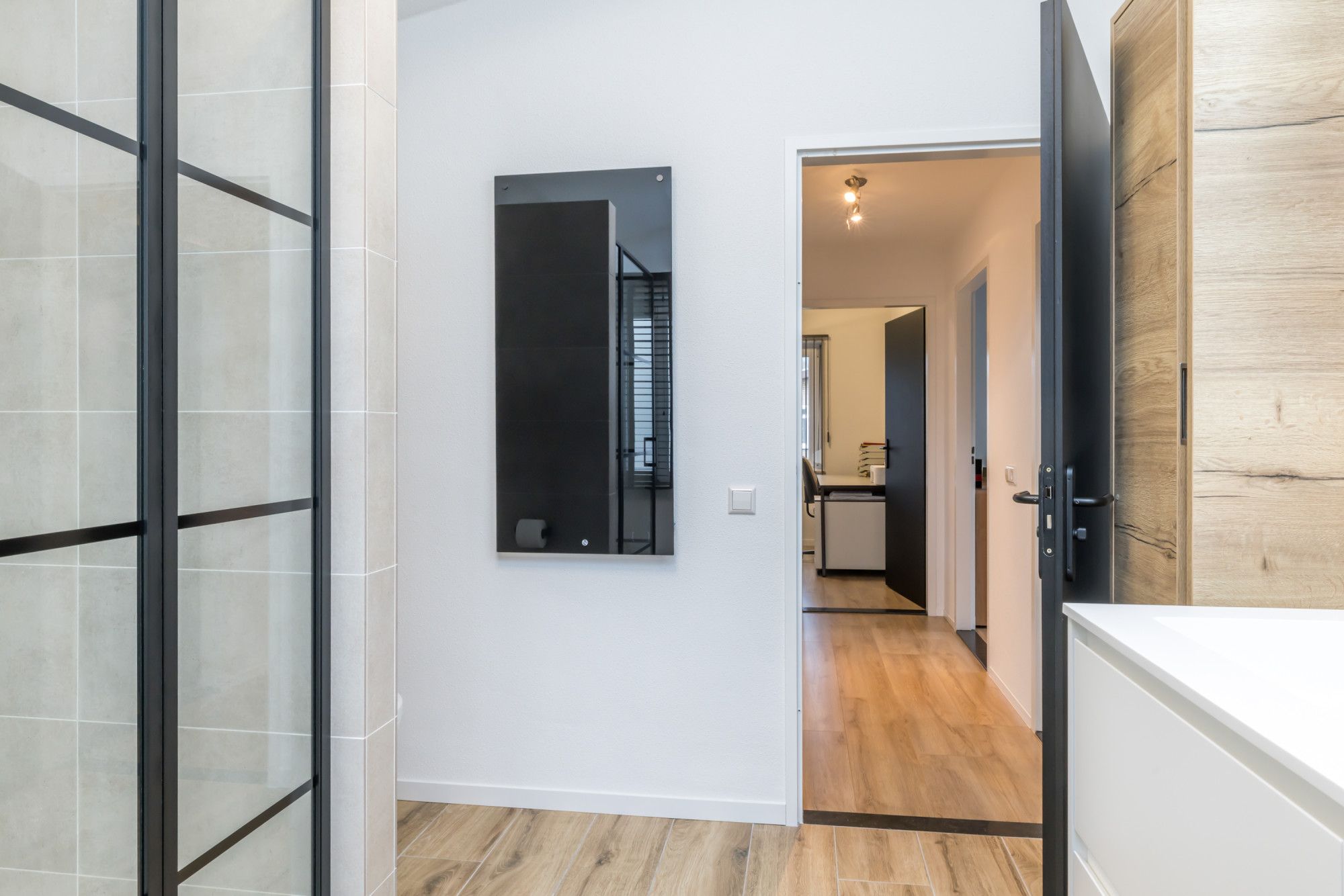 De strak vormgegeven badkamer is een echte eyecatcher en beschikt over een royale inloop-regendouche, een badkamermeubel met dubbele vaste wastafel, een infrarood verwarmingspaneel en een tweede toilet.