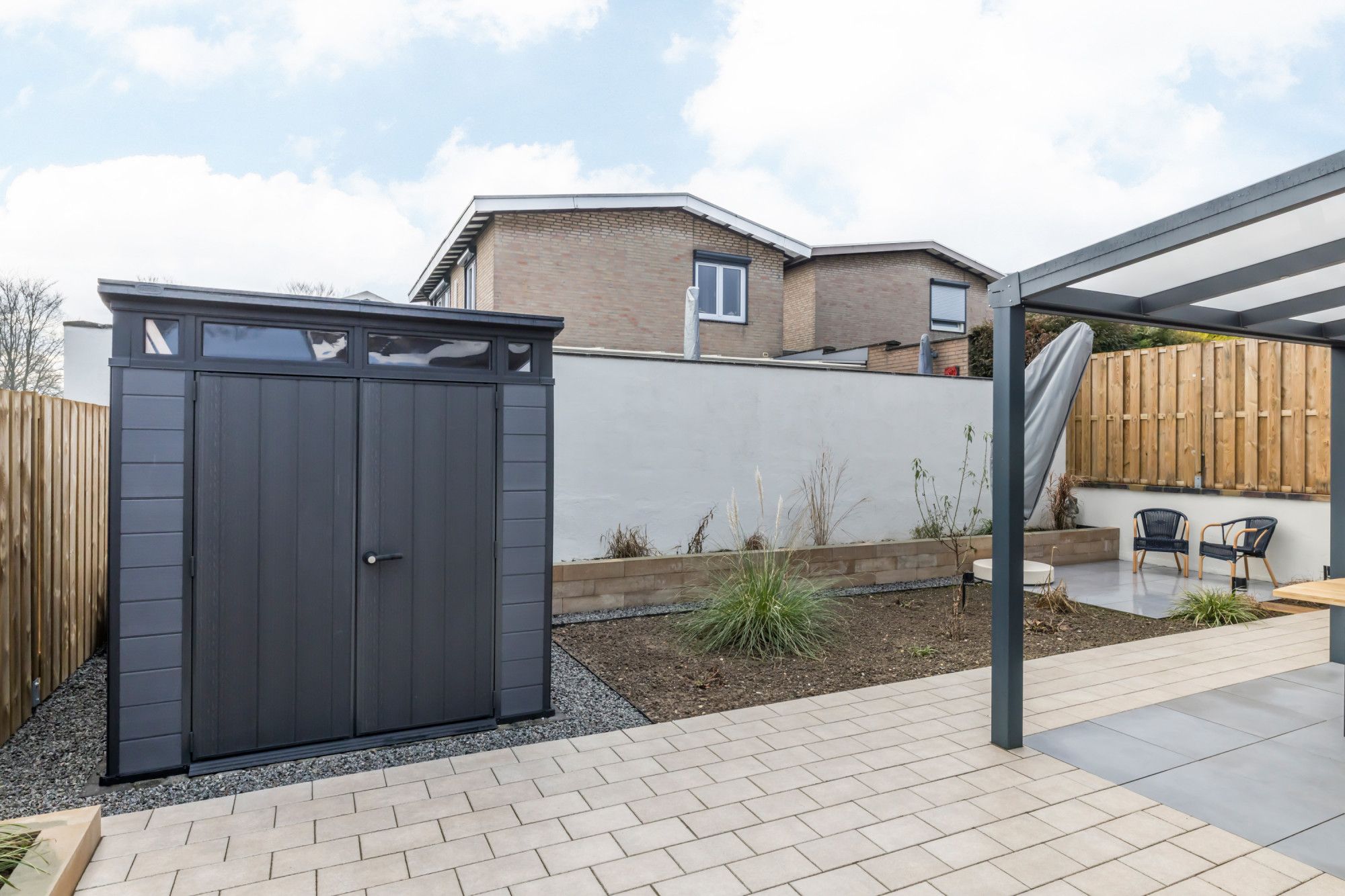 Fraai aangelegde en onderhoudsvriendelijke achter-/zij-tuin met ruim overdekt terras, borders voorzien van aanplanting en een vrijstaande tuinberging, bereikbaar via een zijingang.
